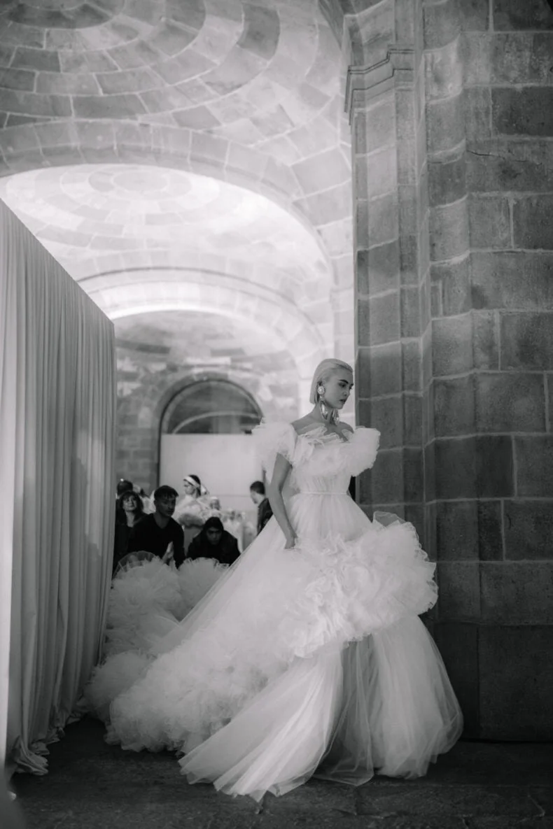 The biggest drawcard of the (seriously impressive) bunch was haute couturist and high fashion royalty Giambatistta Valli. While the Italian designer has been whipping up couture masterpieces for nearly 20 years, the collection he debuted in Barcelona was only his third time round in the bridal sphere. On a fresh, spring evening in the historic and stunning La Llotja de Mar building, the Giambatistta Valli Love Collection 3 sashayed around the runway as part of the event’s ‘Gala Night’. The 30-piece strong range went big on volume, with bold ballgown silhouettes, dramatic trains, statement ruffles and luxe layers of dreamy tulle taking centre stage – all crafted with meticulous detail and paired with oversized accessories.