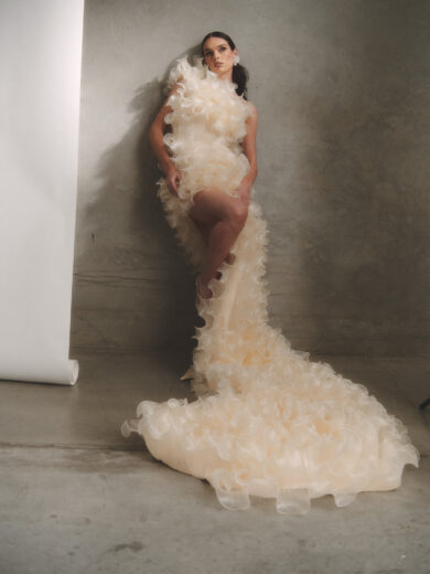 The brand’s signature design language blends sculptural silhouettes, unexpected textures, and alternative veils to create work that feels expressive rather than traditional for tradition’s sake. Every piece holds emotion. Every detail has purpose. Nothing is created to fit a mould, it’s created to honour the woman who will wear it.