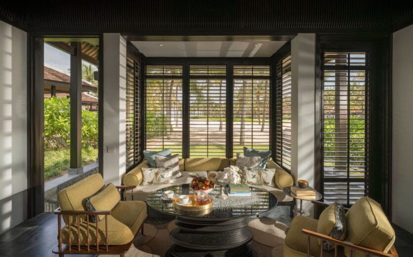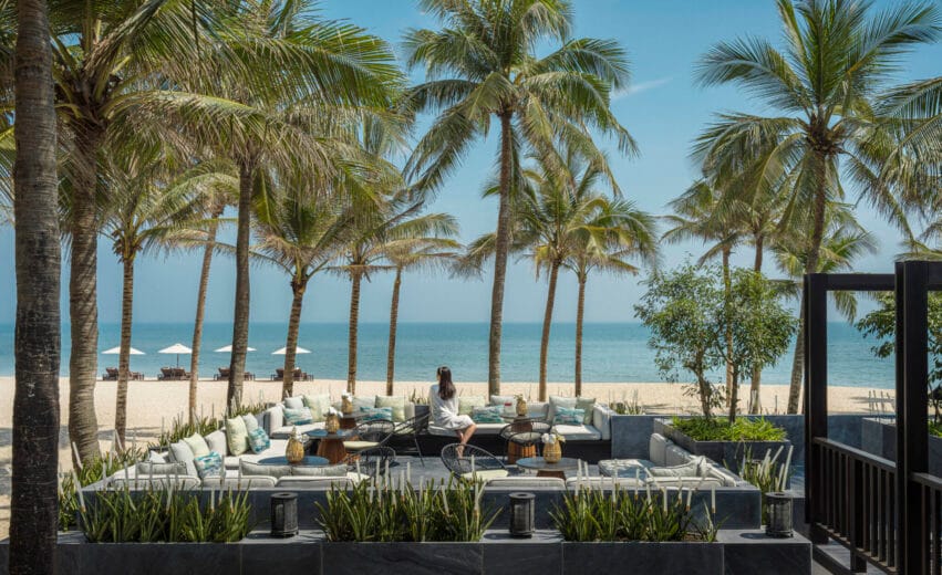 A former fishing village – with a temple preserved onsite – the Resort’s centralised public areas are arranged around three tiers of infinity pools, flanked by loungers, towering palms, water features and manicured gardens that gently cascade towards the beautifully calm East Sea. Five horseshoe-arched bays house 100 sleek villas, perfectly positioned to optimize beach, breeze and Phong Thuy (Feng Shui) principles.