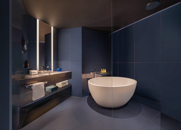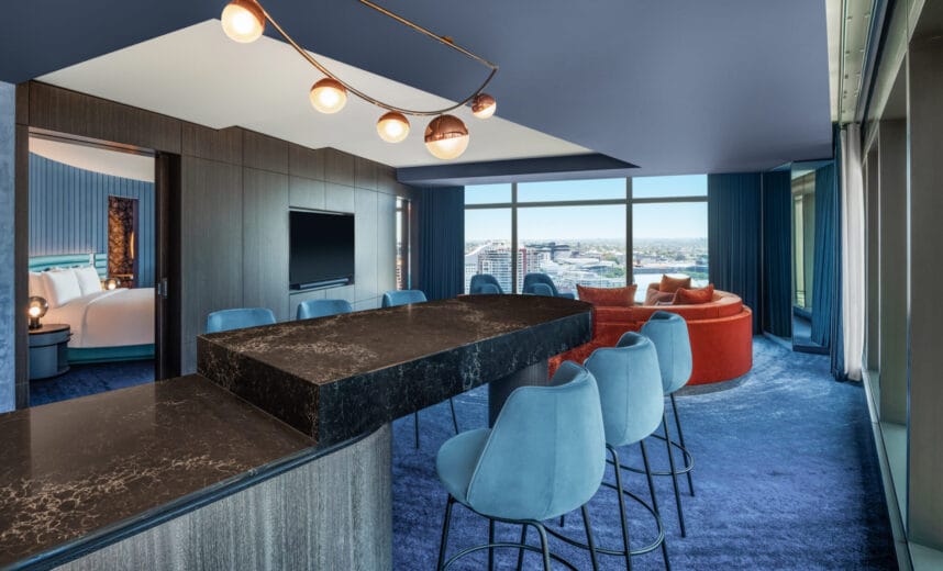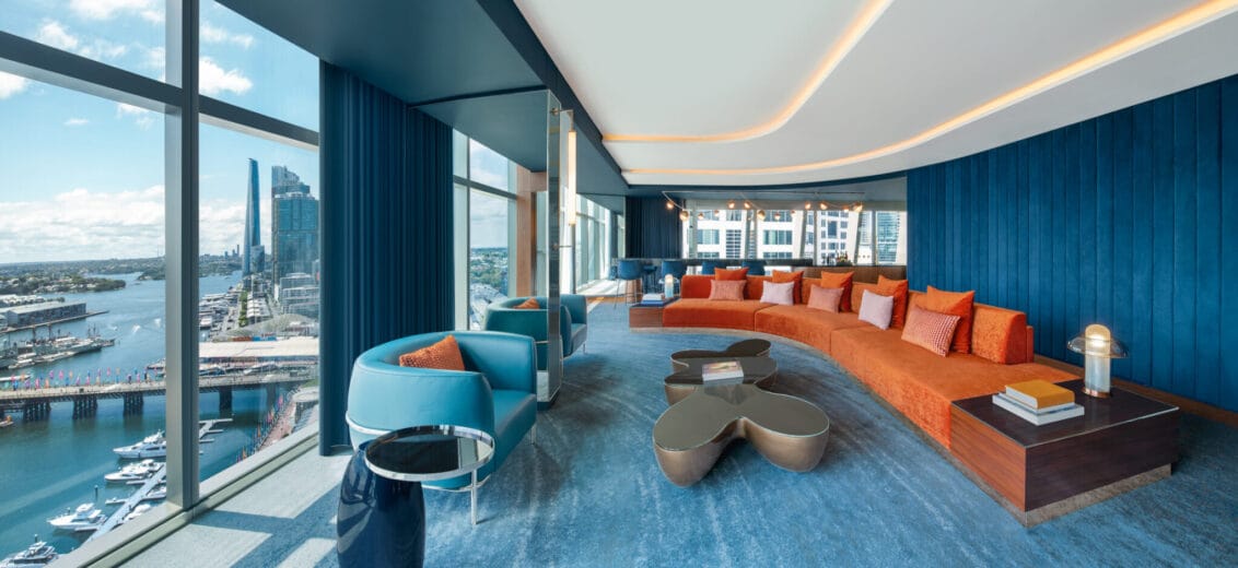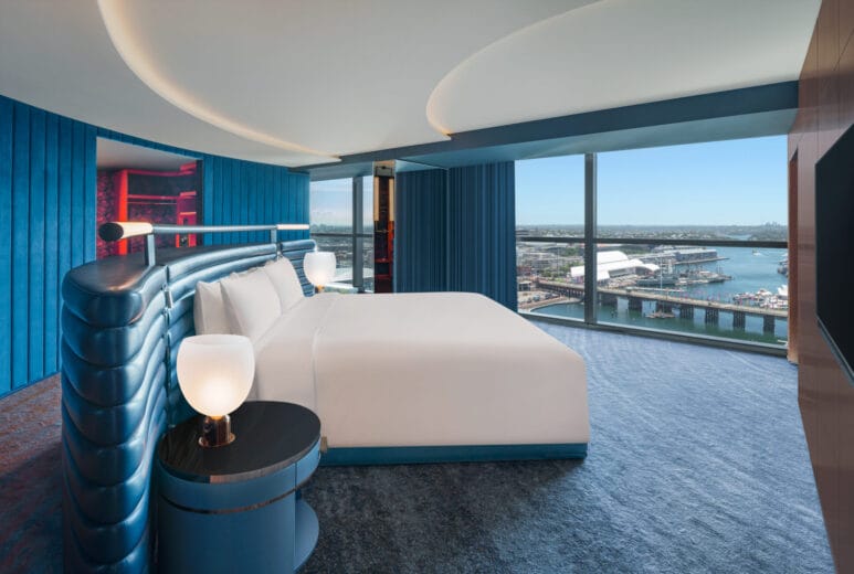 Rising over Darling Harbour, W Sydney instantly captures the eye with the undulating lines of its futuristic exterior and striking interiors that pay homage to the hotel’s NSW locale. Daring and original, a sleek retreat where bold design meets the larrikin spirit, seamlessly melding Sydney and Australia’s cultural touchstones to create an all-encompassing dining and social destination. The Darling Harbour hotel transforms as day turns to night, from the evocative future-noir allure of the Living Room bar and kinetic energy of BTWN restaurant to AWAY Spa, a refreshing sanctuary amid its concrete city surrounds, and the panoramic harbor views from WET Deck and double story rooftop bar, 29/30. Within each of W Sydney’s guest rooms, suites, and studios, marine chic design interiors channel the hotel’s harbourside location and Sydney’s stunning coastlines.