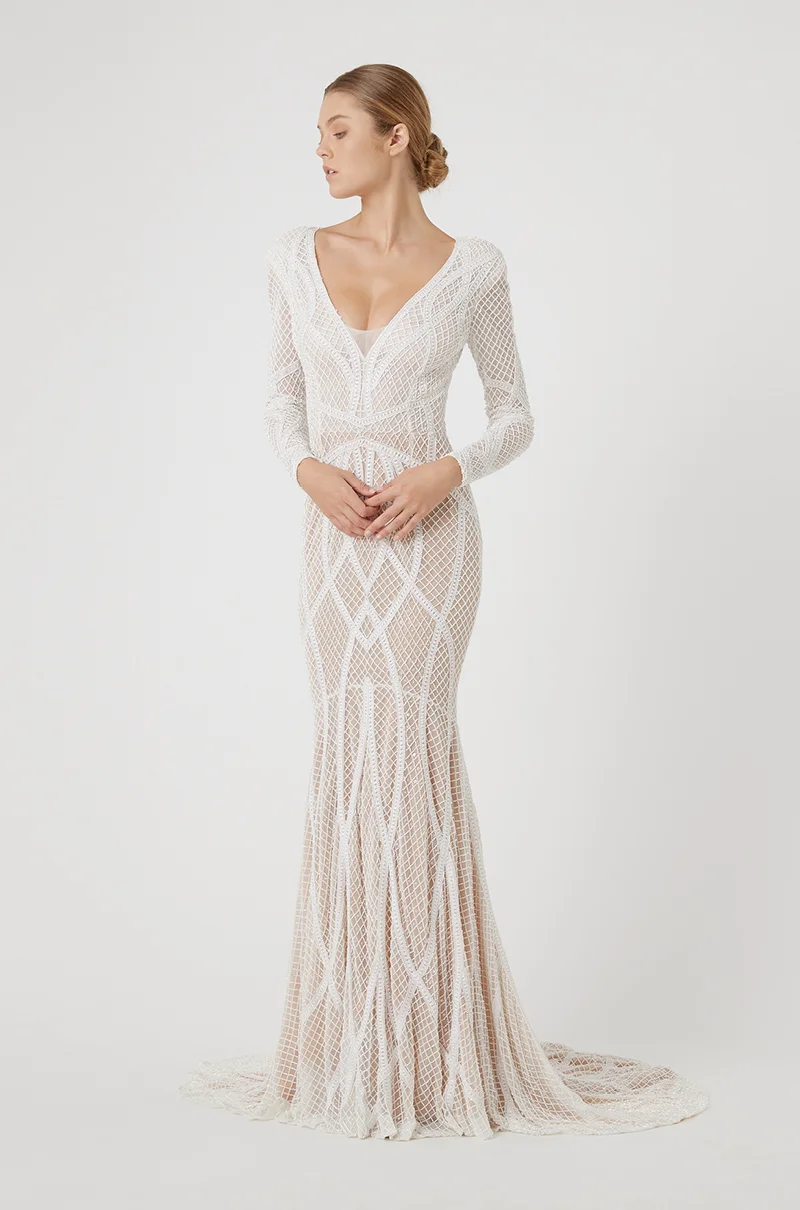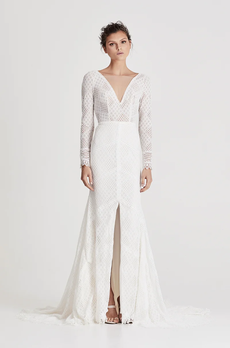 Don’t worry gals, you can still show some skin with a bit of sleeve with features like deep v-backs, thigh-high splits and uber sleek silhouettes. The Valentina Gown by Prea James counters sweet, sheer sleeves with some perfectly placed waist cutouts. We have a sweet yet sultry backless lace number from Daisy Brides and a deep, deep scoop neck confection from the sweetness behind Alca Line Bride.