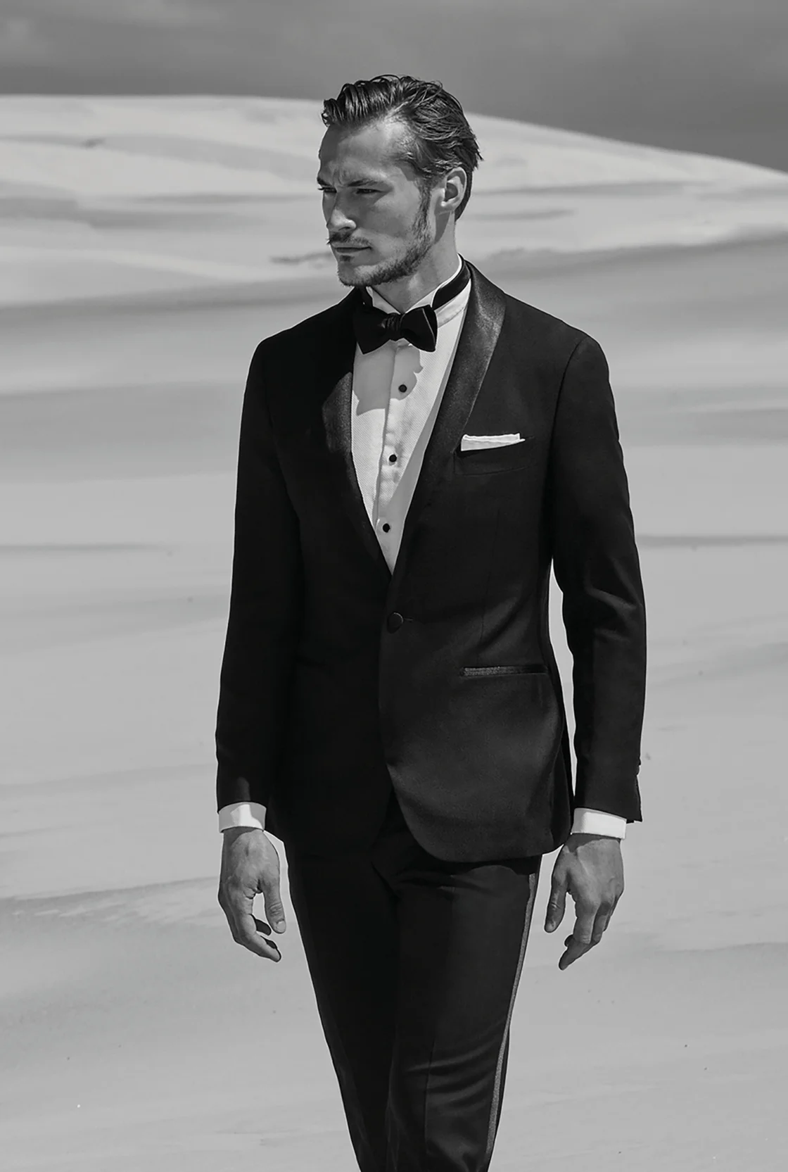 MJ Bale Saunders Black Tuxedo Jacket $699, Ramini White Tuxedo Shirt $149.95, Maurico Black Bow Tie $69.95 & Lorde Tuxedo Button pack $19.95. Shop online at MJ Bale.
