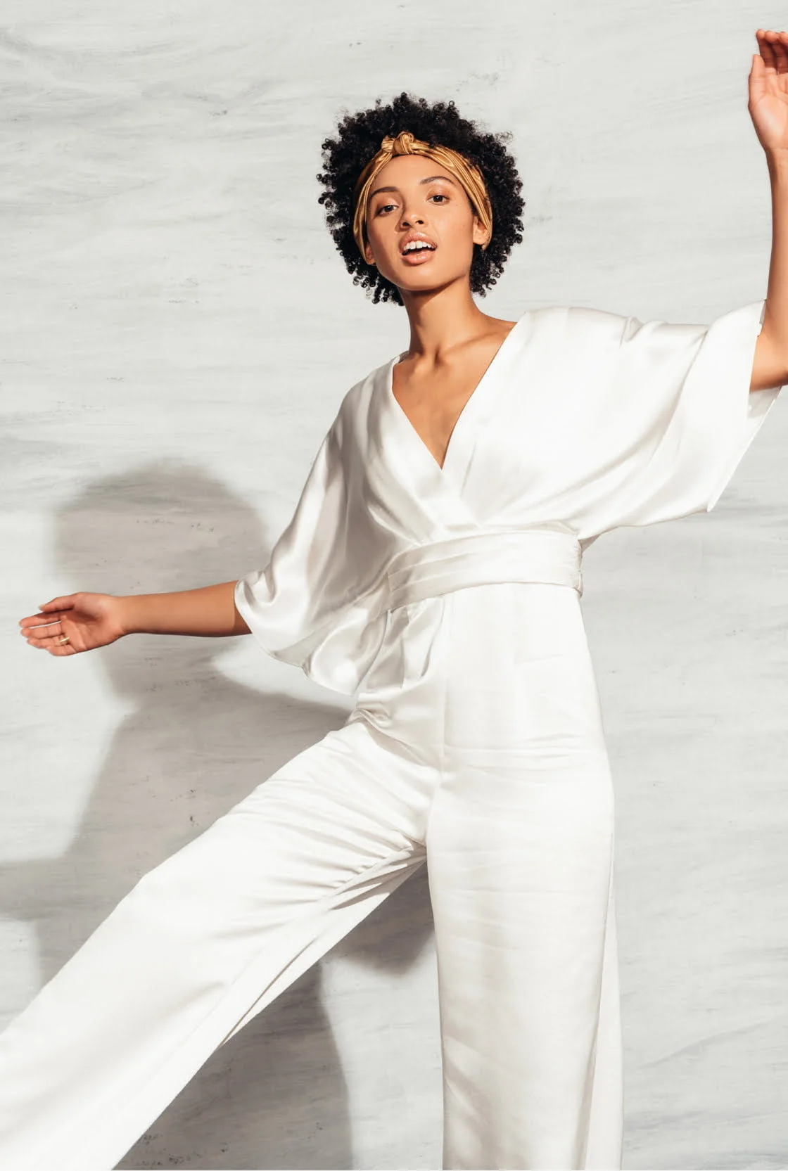 Theia Simona Kimono Pant Jumpsuit, $1299, The Bride Lab, Mrs Bill Sunglasses, $290, Karen Walker, Sophie Heels, $219.95, Alias Mae, Gold Knot Headband, $69, Slip.