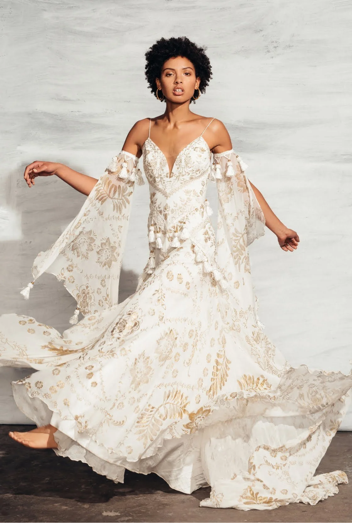 What about in the perfect shades worn low on your nose for your portraits? Or a head to toe gold sequin gown if you’re into full-on glamour? Scroll down to check out Natalie Chan’s creation and the ruffled gold number (reception dress anyone?). There’s also a little understated embroidery to bring in a touch of gold and champagne underlays for the subtle bride.