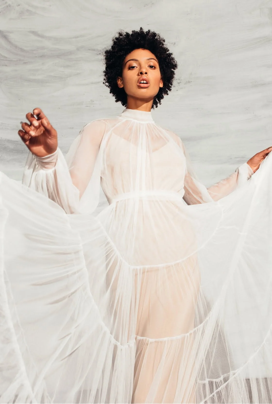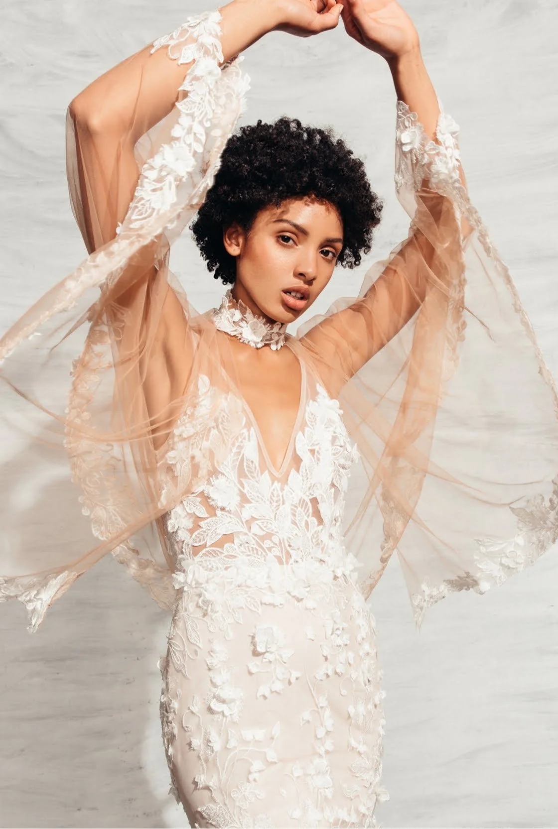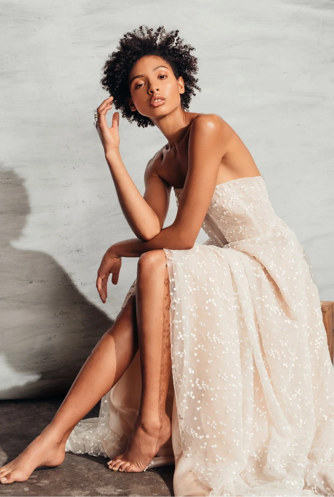 Amelie Gown, $5700, Bo & Luca. Worn Throughout: Linking Love Ring (Left Hand), $39, Krystal Knight and New Love Clarity Ring (Right Hand), $99, Krystal Knight.