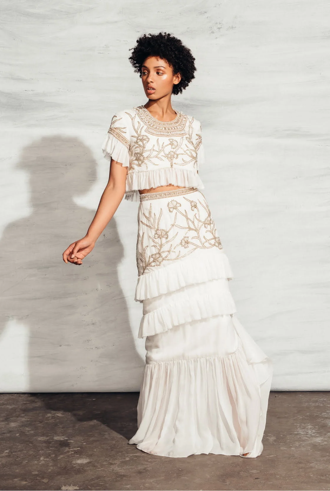 Adelaide Skirt, $1500 and Cecilia Top, $1700, Alca Line Bride, Christina Hoop Earrings, $95, Angelina Alvarez.