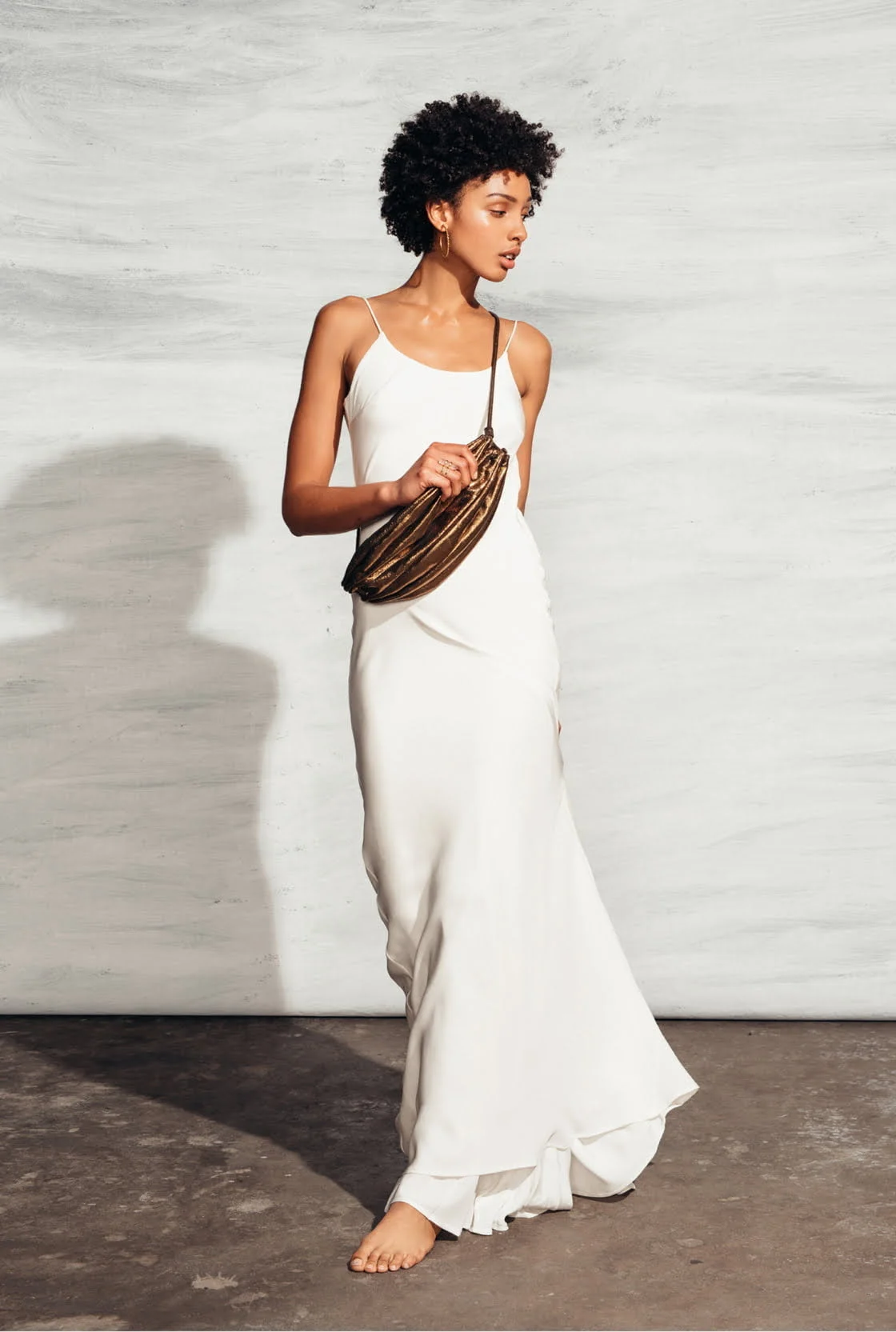 You can never have too much metallic, right? Well, done in the right way of course… And how’s that? To start with, it’s scattered over your glorious bridal gown, like the Rue De Seine below. Or found in a pair of statement sandals that you contrast with a soft silk gown like the chic Prea James Cara. Then it’s within your accessories (think Krystal Knight jewellery) or a high slung crossbody bag like the one over Fiona Claire’s slip dress below.