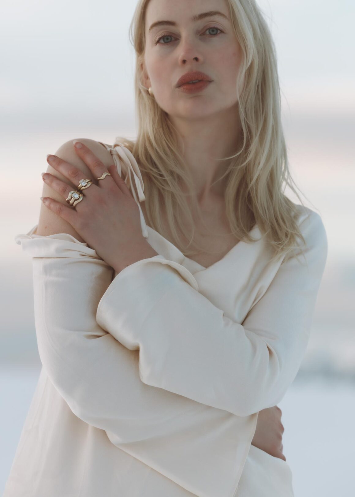 “The essence of this collection is inspired by the uniqueness of the wind-carved shapes in the snow and the cloud formations in the surrounding mountainscape,” says founder and jeweller Liz. “That sense of ephemeral beauty guided us in creating Plume: ceremonial jewellery that feels at once timeless and entirely personal.”