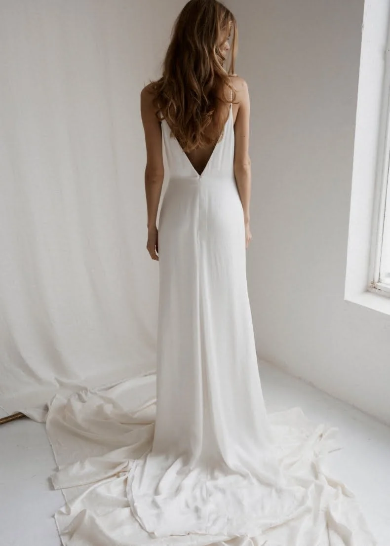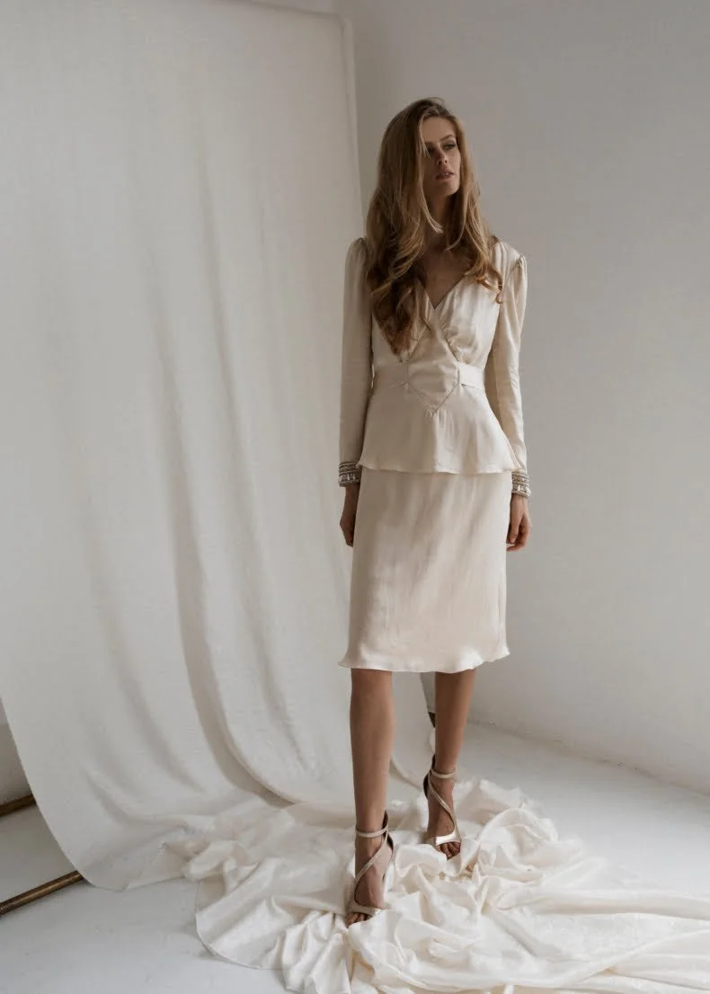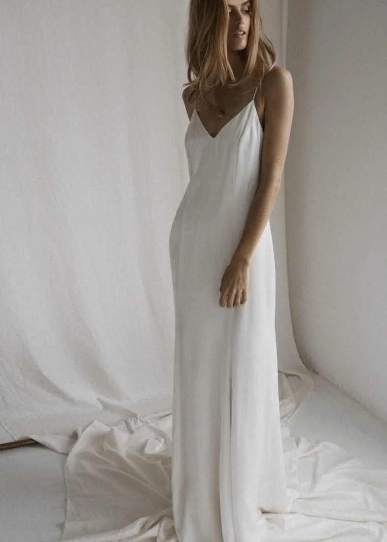There are 12 new pieces (in a mix of champagne tones and crisp whites) and everything from classic cut gowns to a sophisticated straight-leg jumpsuit, slip style gowns and even a knee-length skirt and matching blouse for the more mature, or conservative bride.