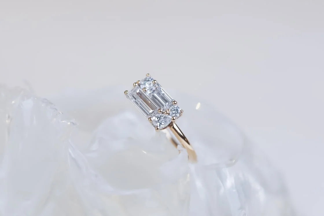This incredibly beautiful ring features white diamond baguette, brilliant and pear cuts, with a total diamond weight of 1.17ct. Set in 18ct yellow gold on a Grew & Co signature band. “Our Elke design is inspired by our love of art deco architecture. We are drawn to the elongation and repetition that can be found in buildings from this era; using white diamond baguette cuts, brilliant cuts and a pear cut, to mirror the shapes of this time.”
