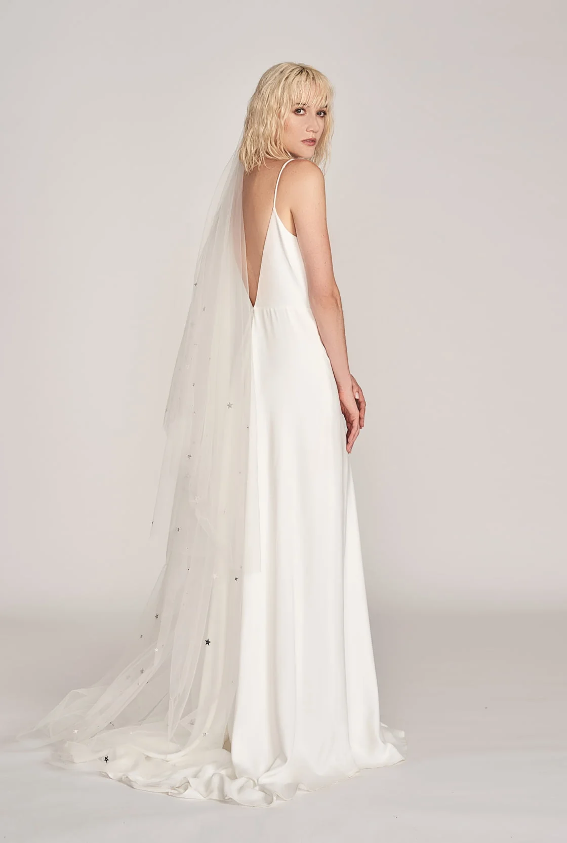 Charlie Brear Fernley Gown, $3250, Through The White Door, Dove Grey Bridal Star Drop Veil, $520, Hope X Page.