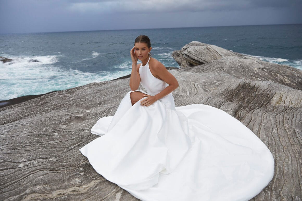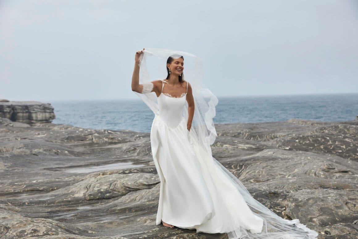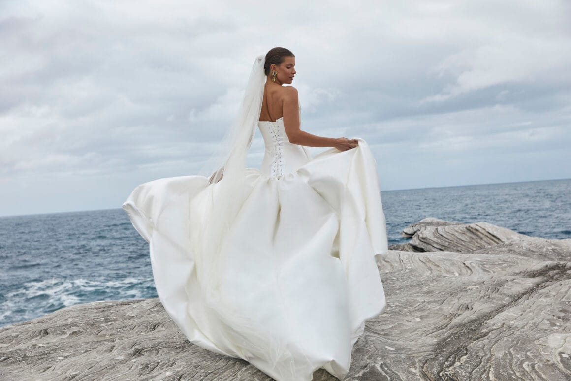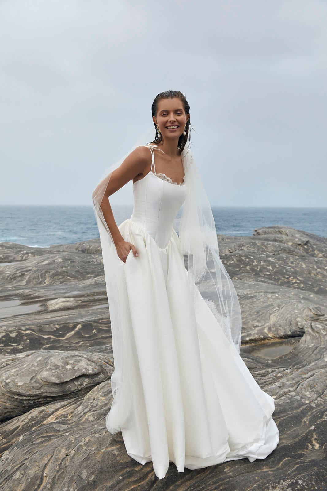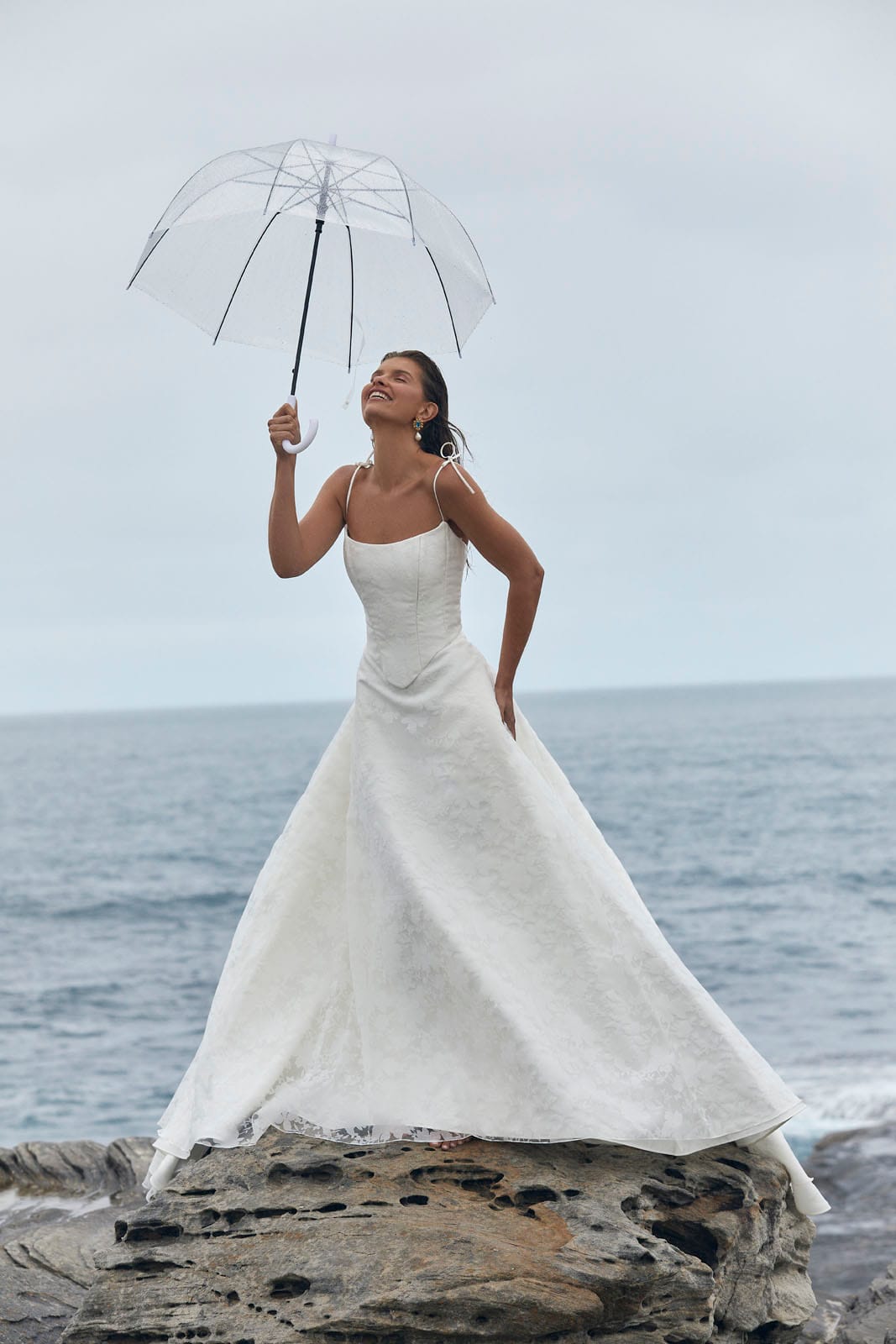 Named after the coastal beauty of Sydney’s iconic La Perouse (all sandstone cliffs, salty air and old-school romance), this milestone collection is all about embracing legacy while leaning into fresh, modern drama. Think drop-waist silhouettes, structured Basque bodices that cinch in just right, and more textural goodness than your Pinterest board can handle.
