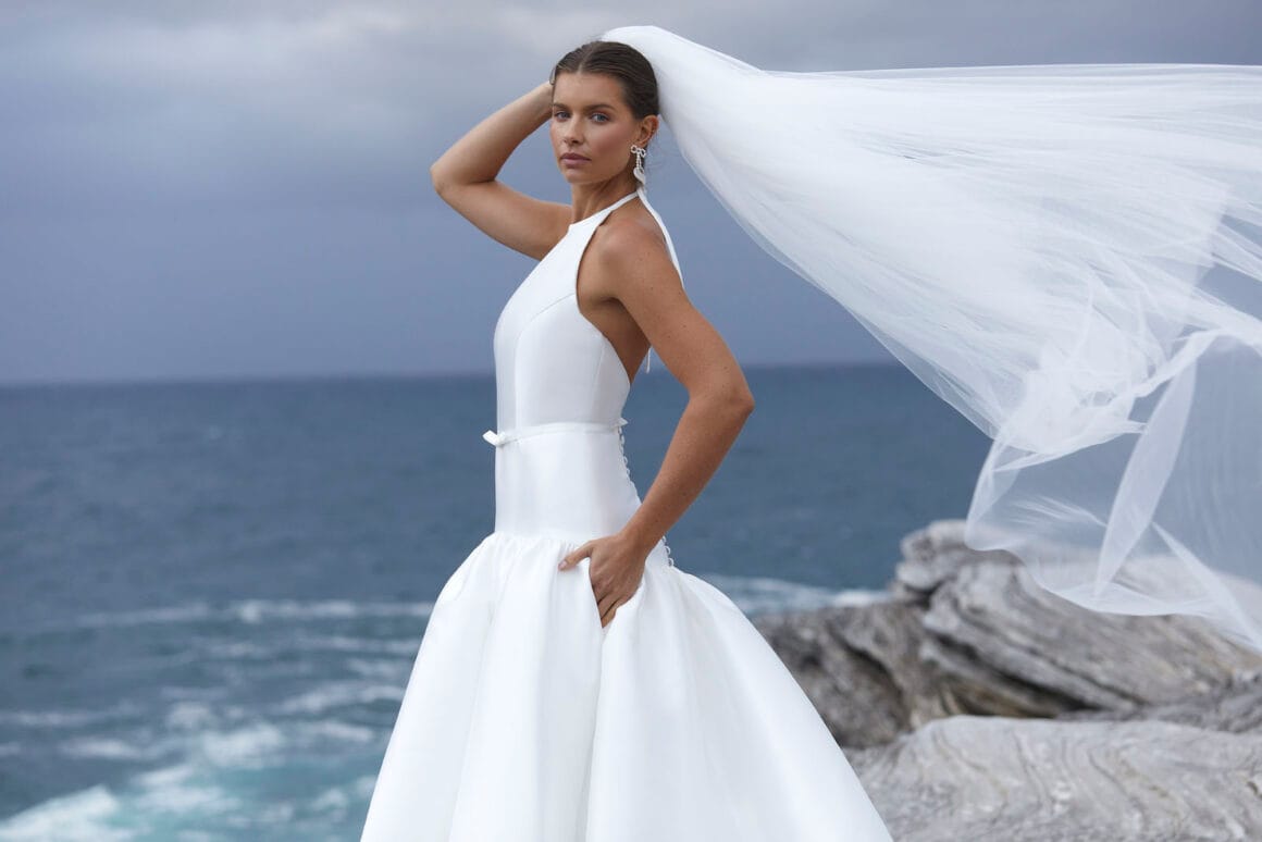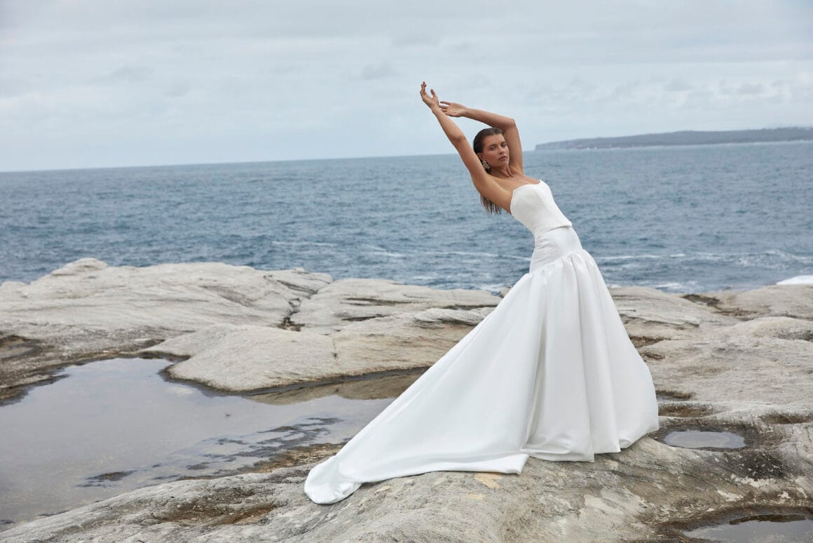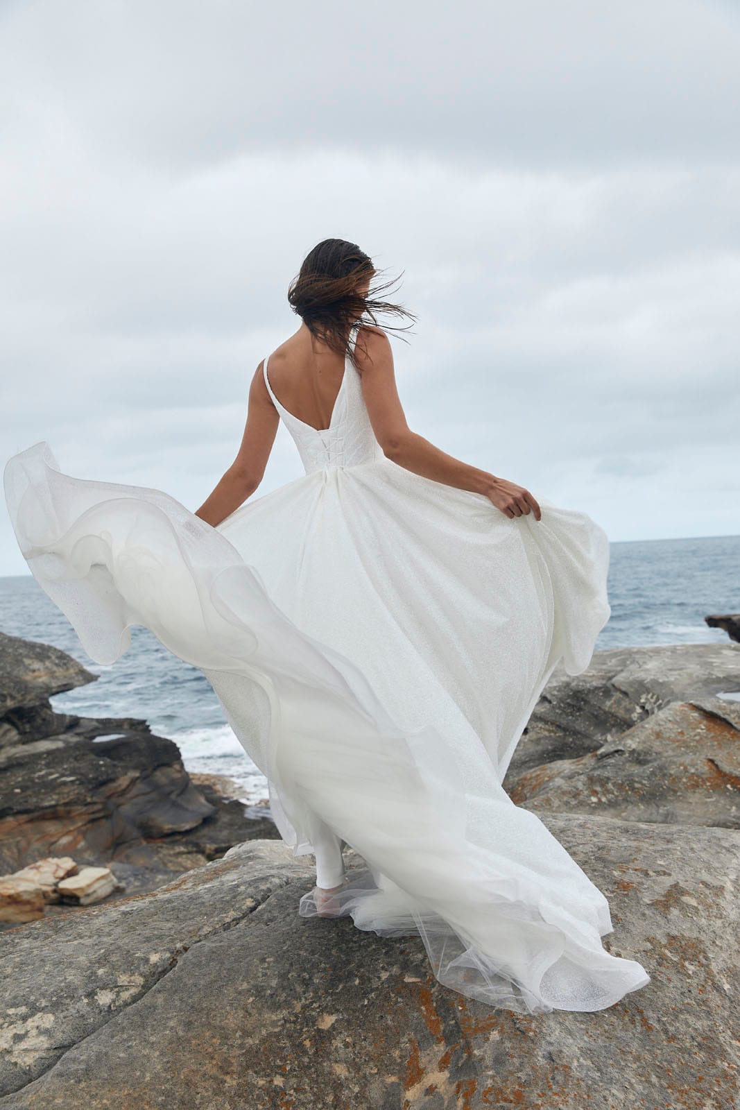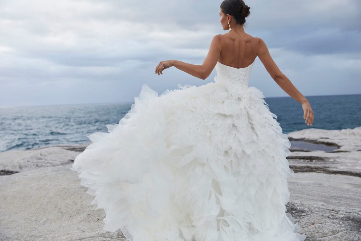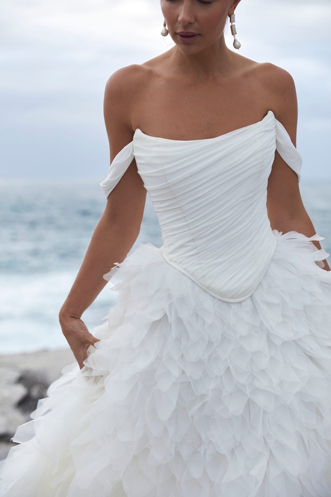 Standout styles? Don’t mind if we do. The Capri gown is pure red carpet energy with a plunging V-neckline and hand-draped soft-stretched tulle. The Jordyn Basque & Dahlia Darling brings a bold, romantic twist with organza petals you’ll want to twirl in forever, while Ciara (above) is for the cool-girl bride who wants a little structure, subtle details, and a whole lot of wow.