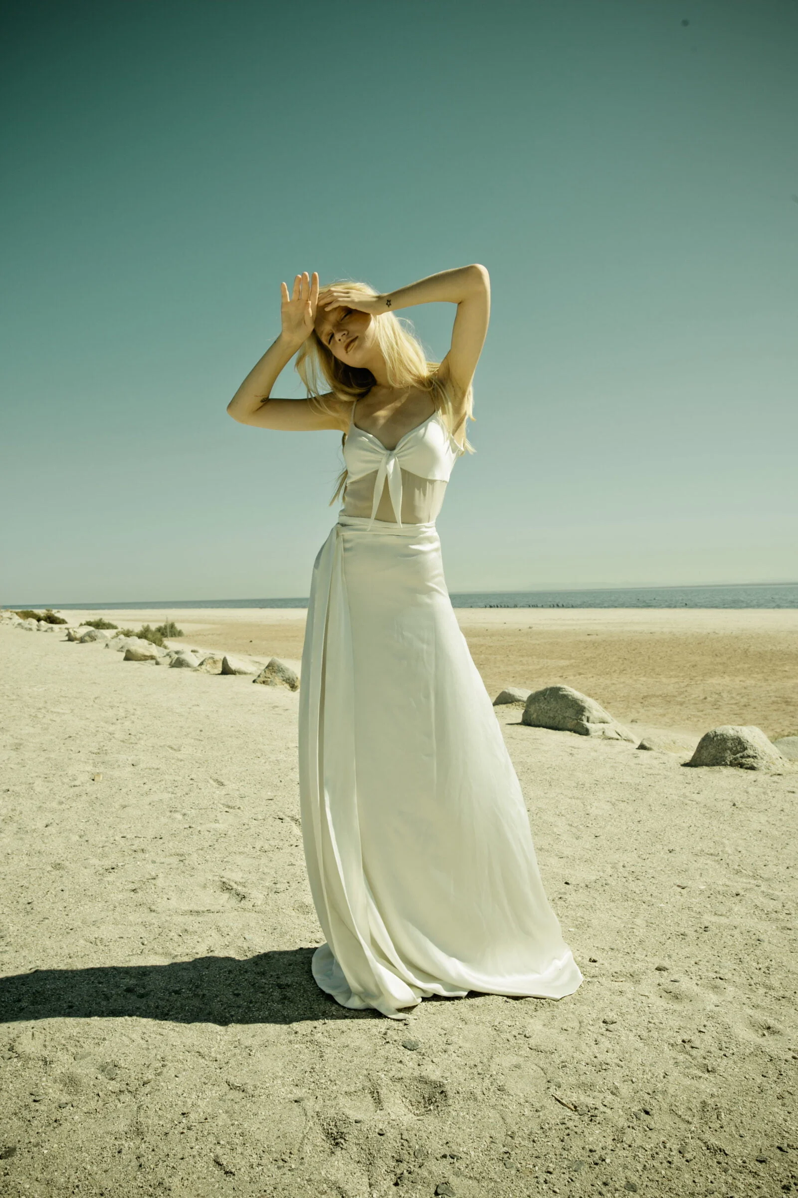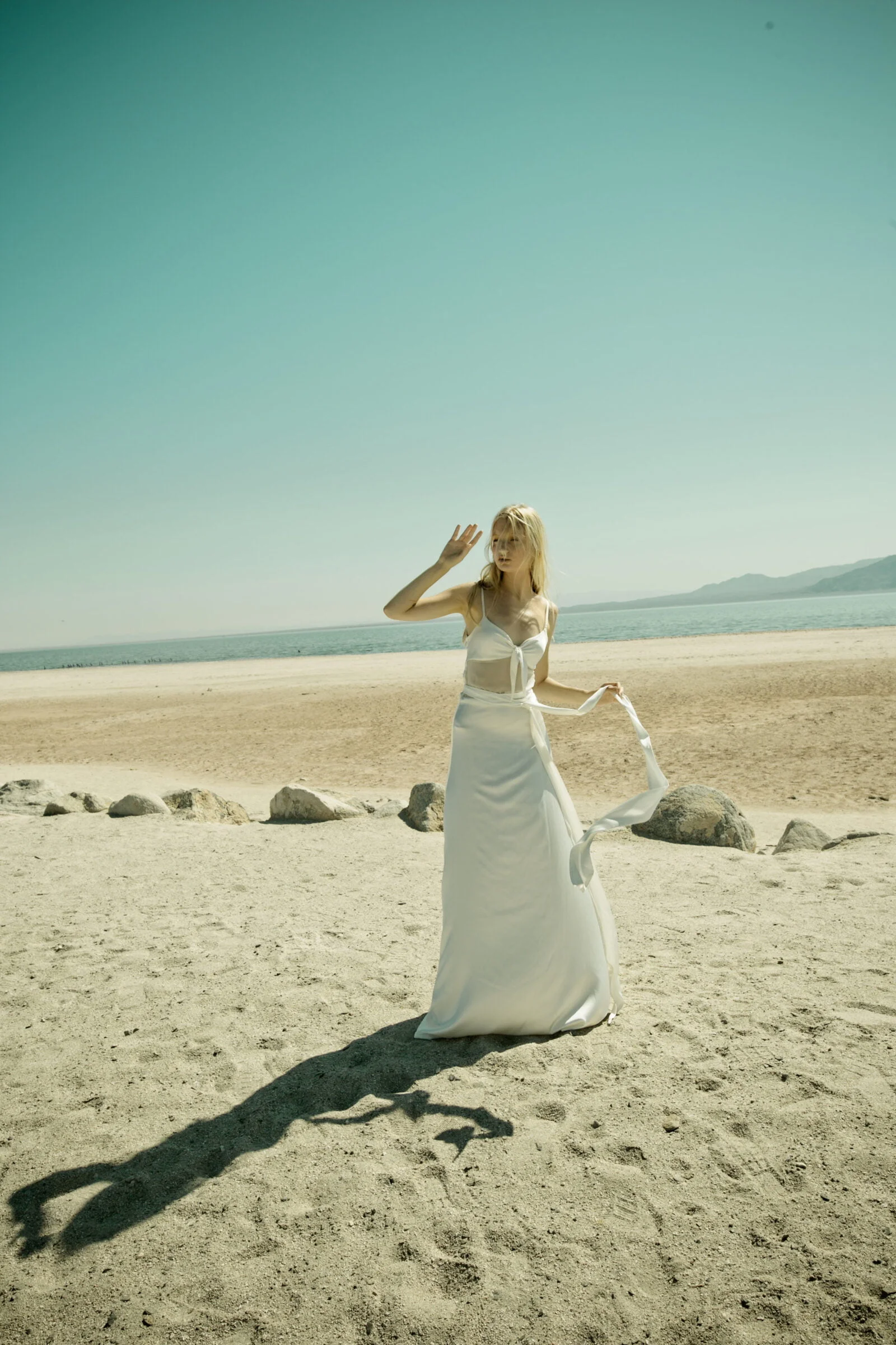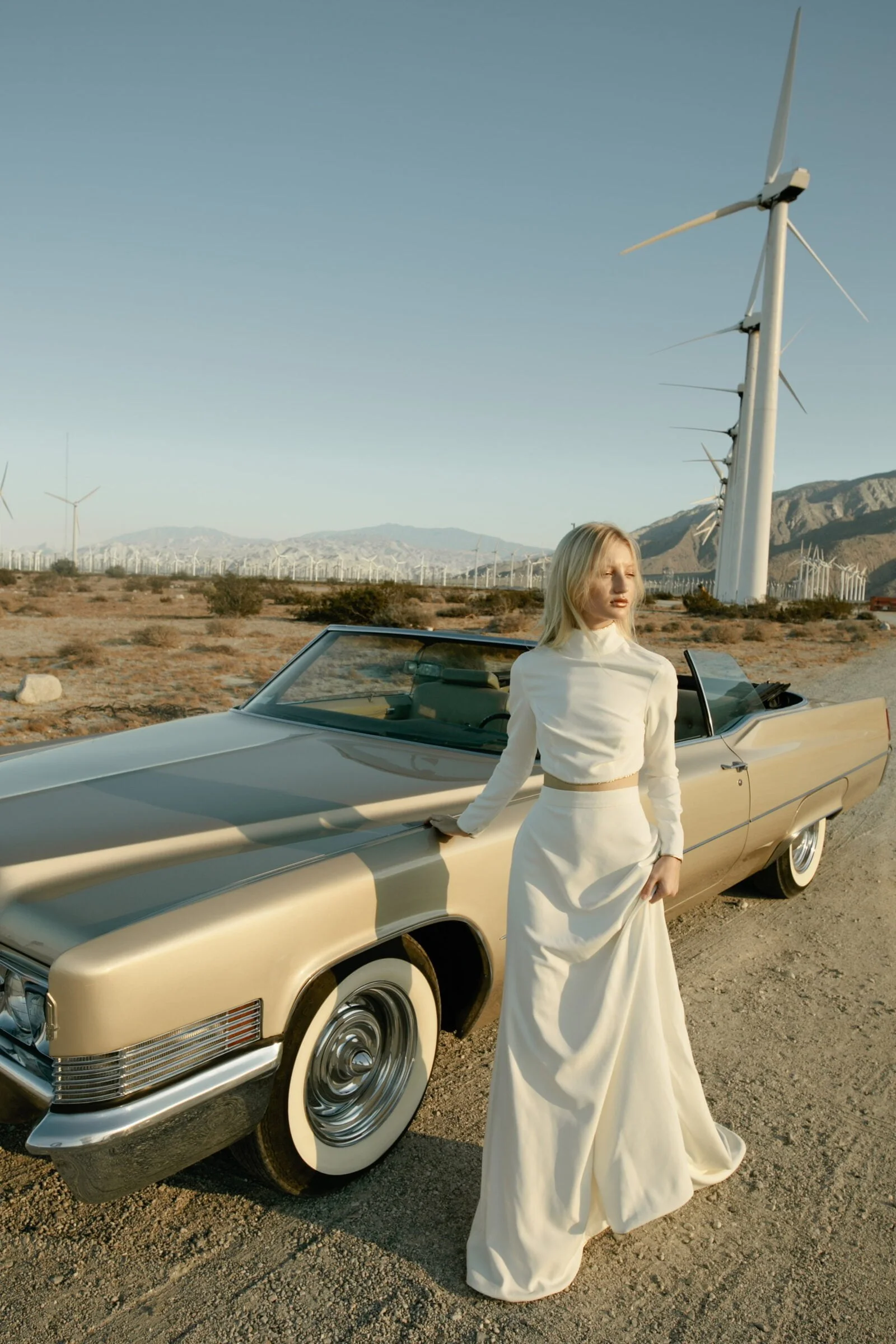 “A desert oasis of cinematic style is nestled under the San Jacinto Mountain Range. Palm Springs, iconic in its glamorous heyday for the rich and famous, is the backdrop and the faded colours of the widely-recognised architecture exude heat and feel sun-baked, all calling to mind the mid-century desert modernism of the area. As we yearn for a time that might never have been, the landscape promises escapism into a mirage world. Slightly melancholic and yet still romantic in following the story of our escapist, the collection is a sheer delight of fluid movements, languid silhouettes, and an abundance of lightweight silks. The warm desert wind carries languid beatnik vibes around wisps of blouson sleeves and organic pleats and the choice of lustrous silk gracefully evades the look of traditional heavy-handed decoration and fabrics.”