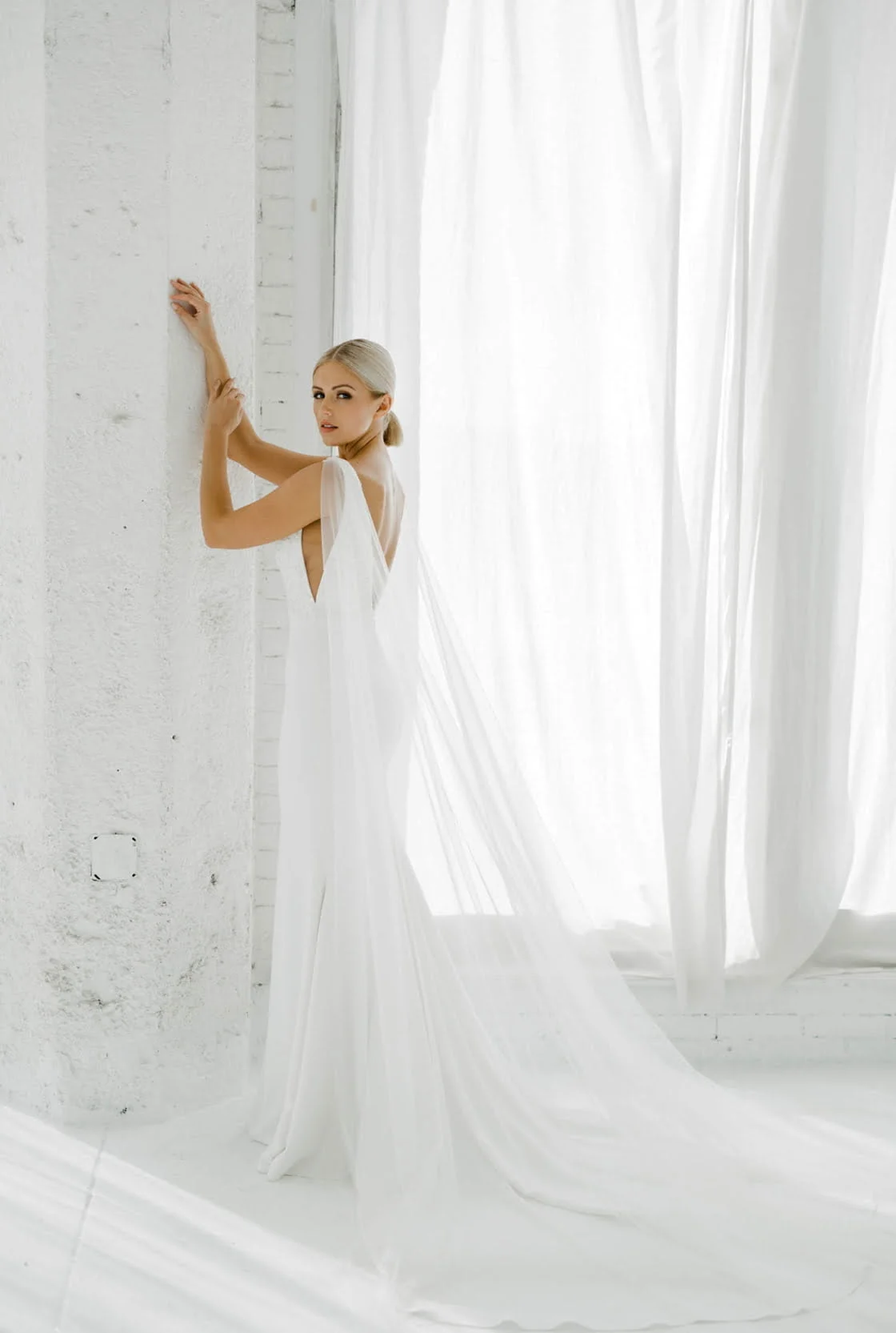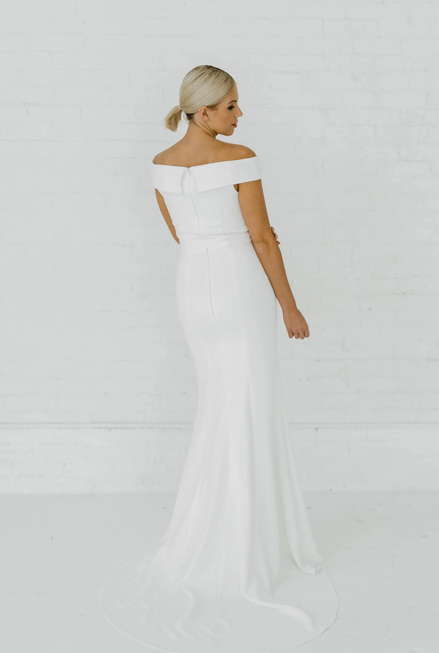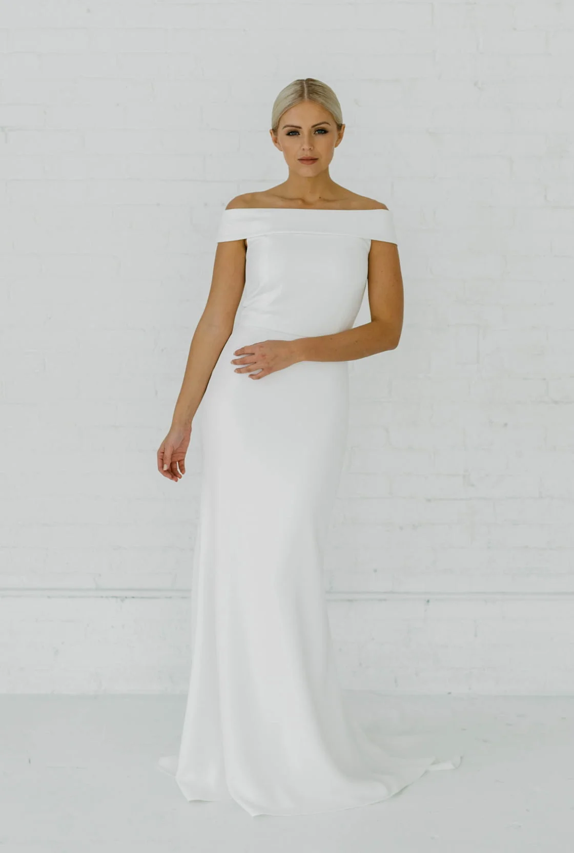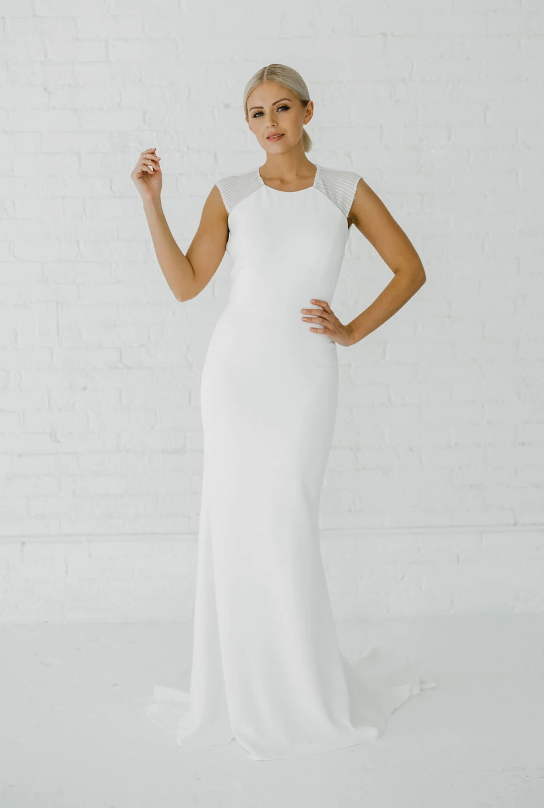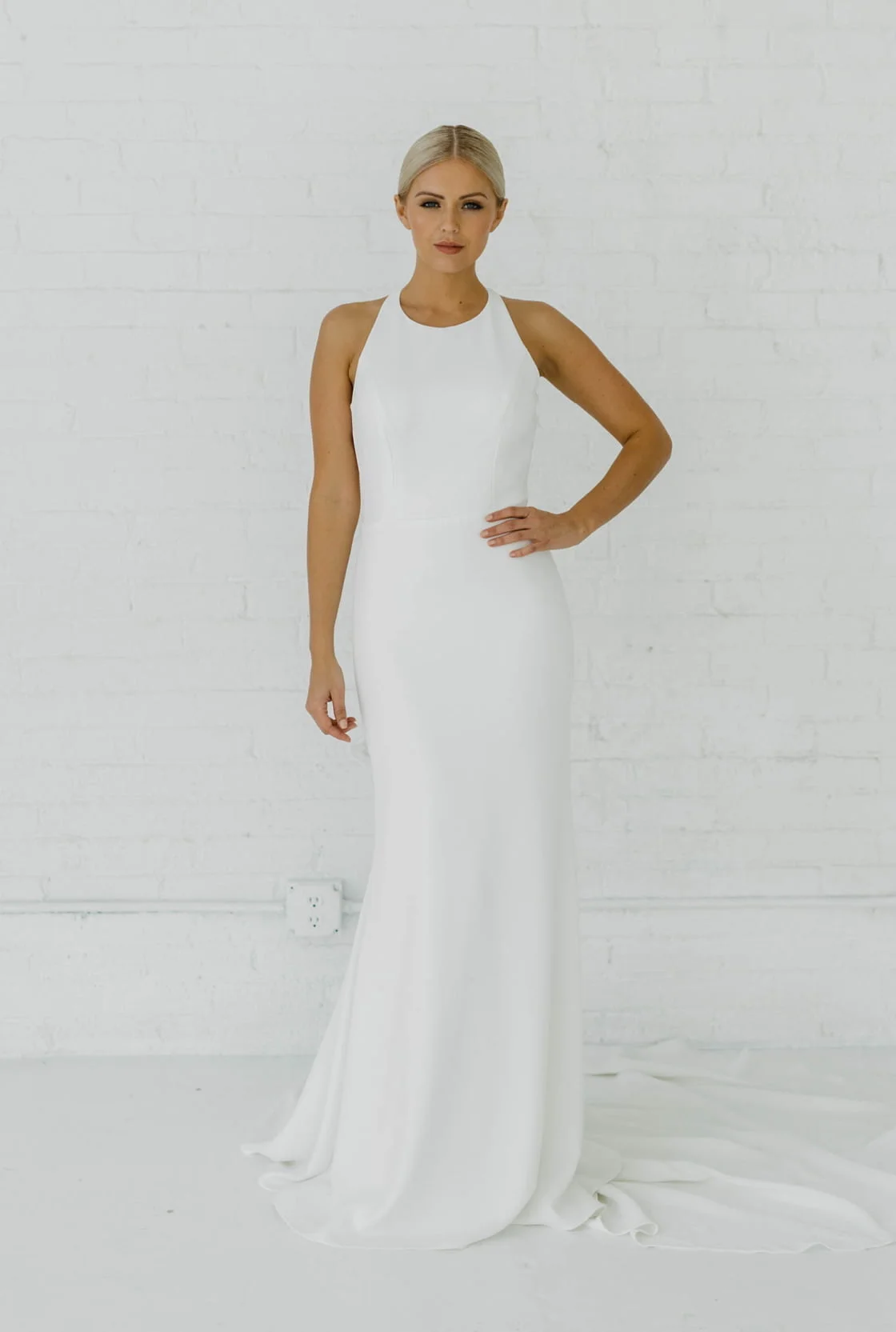 Amy, owner of Love Marie Bridal Boutique (in Camden, NSW) says the designer is most known for her chic crepe gowns. “The fit is perfect! They hug the booty just how you want them to and hide those funny underarm bits that no one likes!”