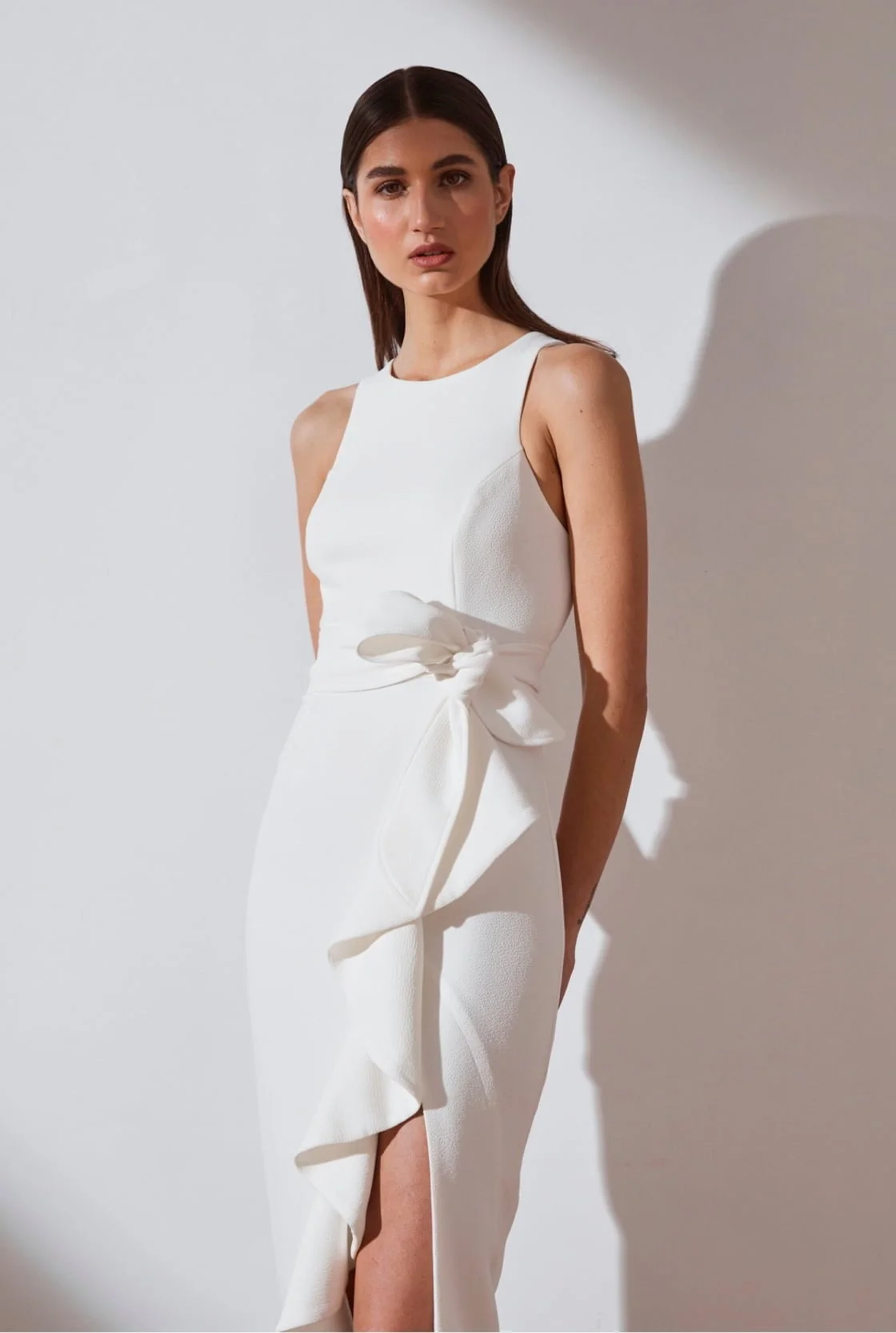Shona Joy Celeste Ruffle Front Midi Dress, $270, shop online at Shona Joy