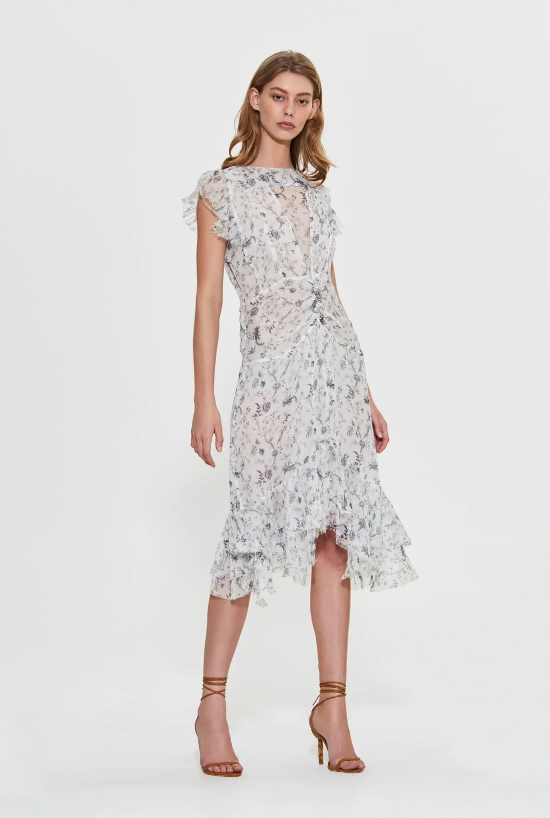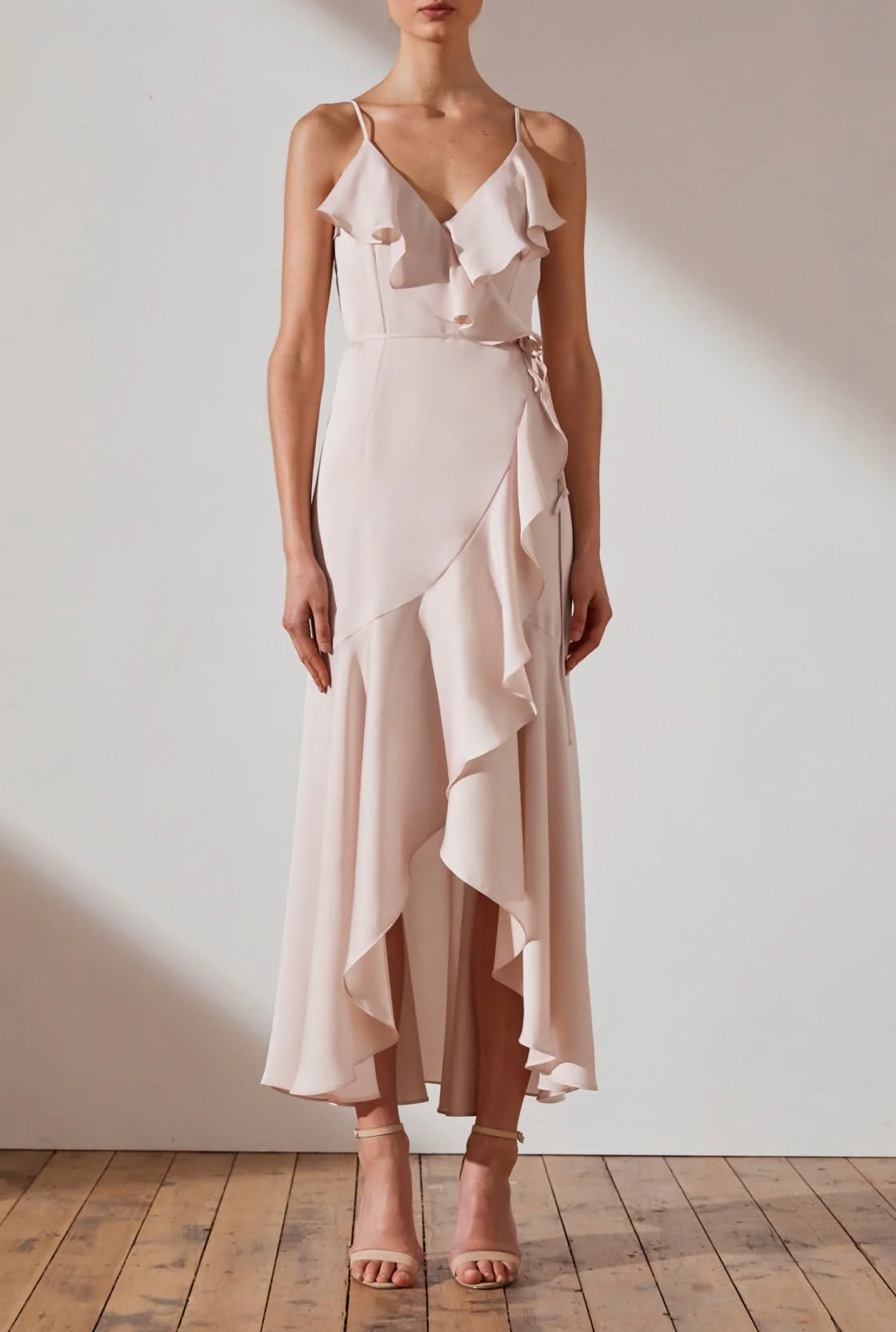Shona Joy Ruffle Wrap Midi in Porcelain (Coming next week), $295, shop online at Shona Joy.