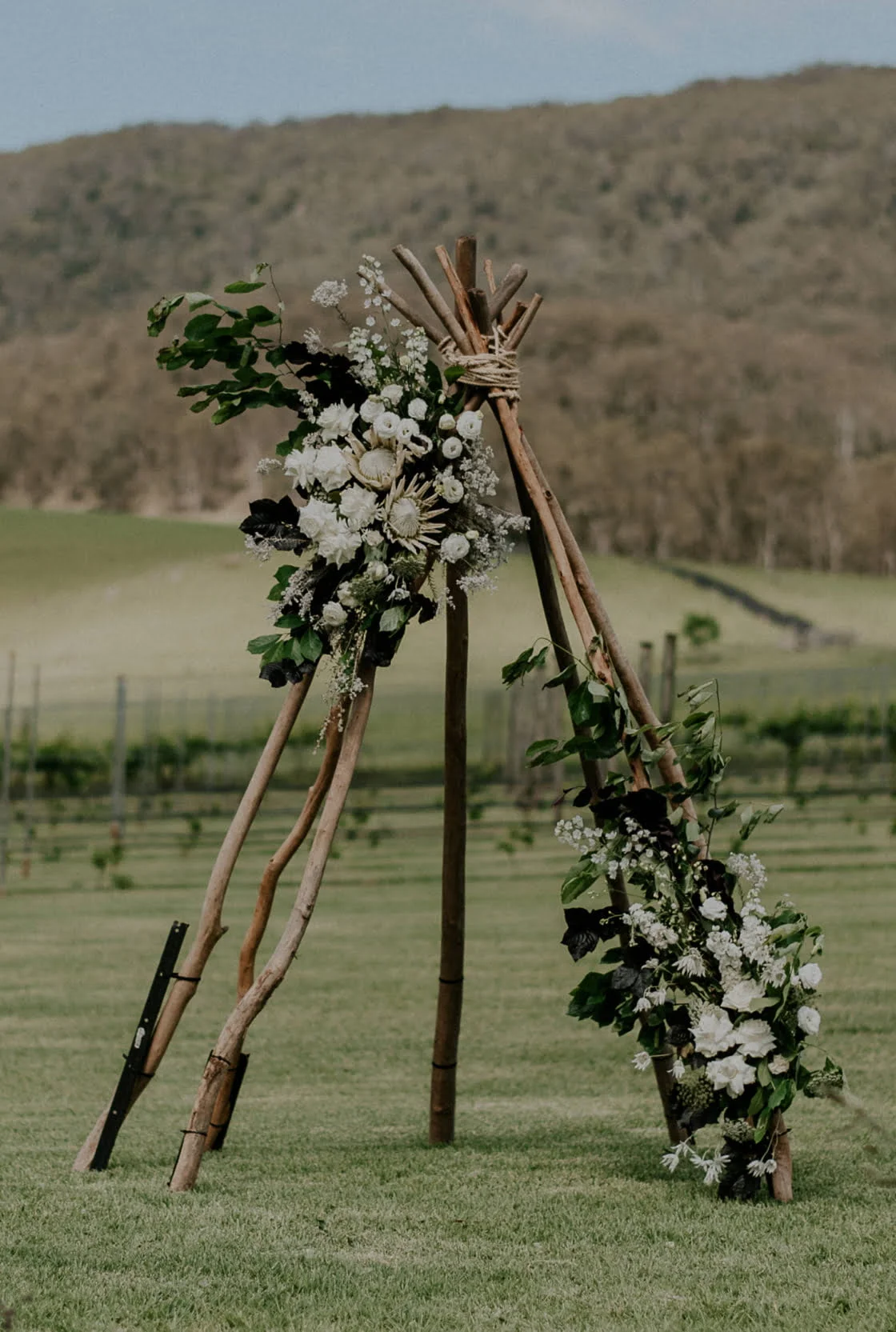 Maybe you’re keen on a more quirky vibe in which case the giant stack of old tyres spray painted purple and decorated with lemons by Victorian fave Nomad Styling (and photographed by Beck Rocchi) might be more up your alley? A naked tipi might tickle your fancy like the one Poppy Culture created below (complete with dream catchers mind you and photographed by Georgia Verrellsor something circular perhaps? Like that beautiful setup Sydney faves Aisle of Eden created at our fave bush venue Audley Dancehall  (captured by Gui Jorge)