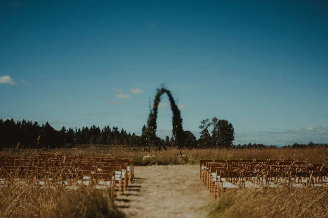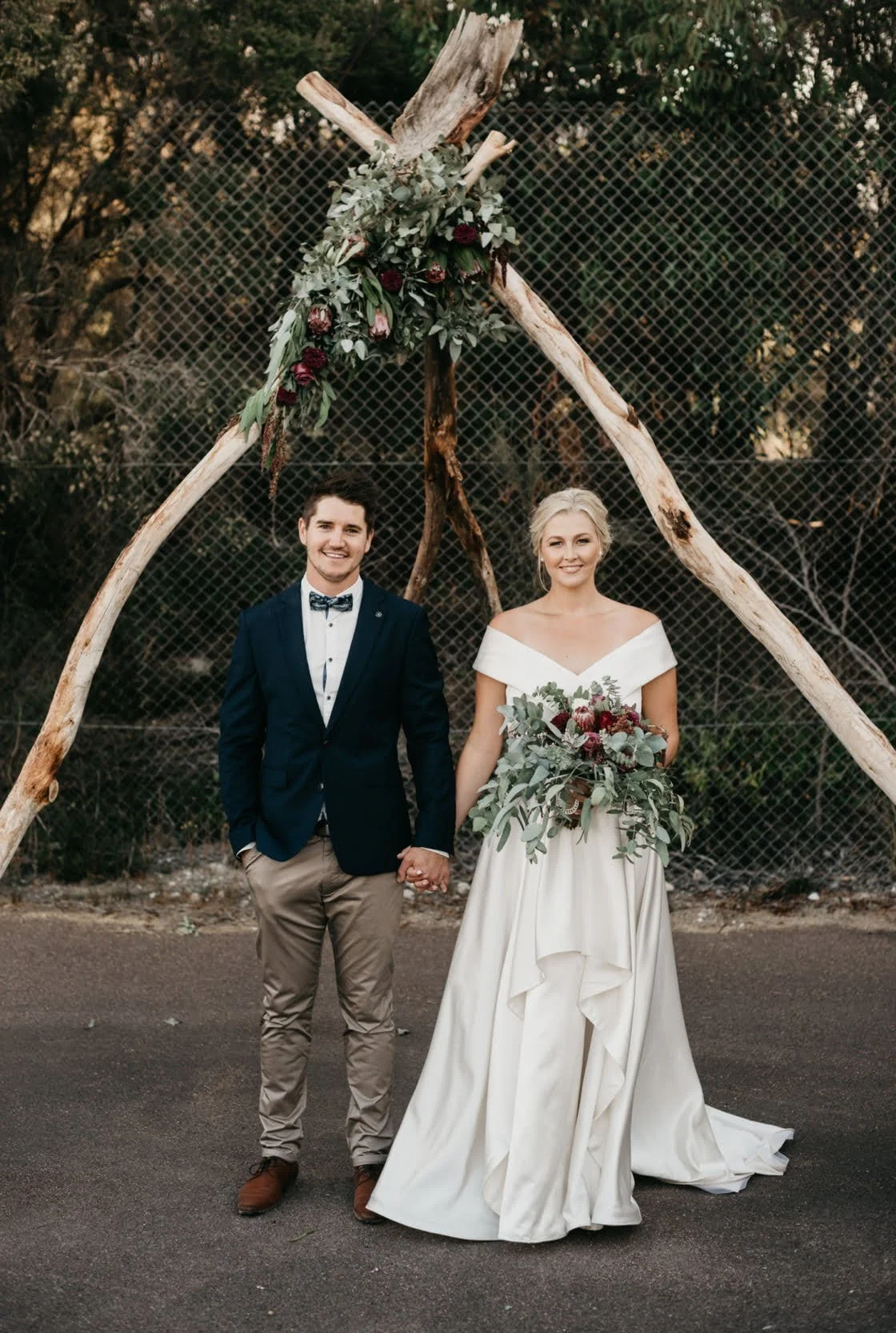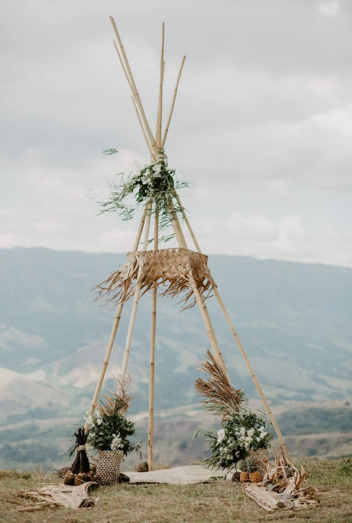 But maybe all things pastel and pretty is more your vibe, if so, be sure to clock that gorgeous ceremony set up by Sydney faves The Sisters as you scroll down. Where talking orchids, dried banksia and blush coloured roses with scattered petals for days. Of course, you’ll be dying to see more of this wedding – so once you’re done with this post be sure to click here. Keep scrolling and you’ll find everything from bambo tipis, to two poplar trees tied together at their tips (talk about thinking outside of the box!) along with hanging greenery to boot and a seriously bright ceremony set up inspo by way of Vic and Col’s Cactus country wedding.