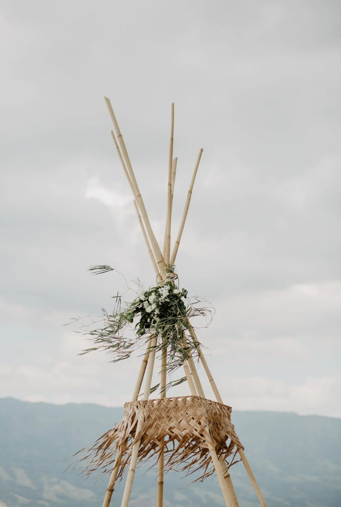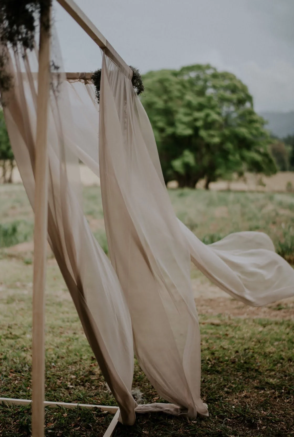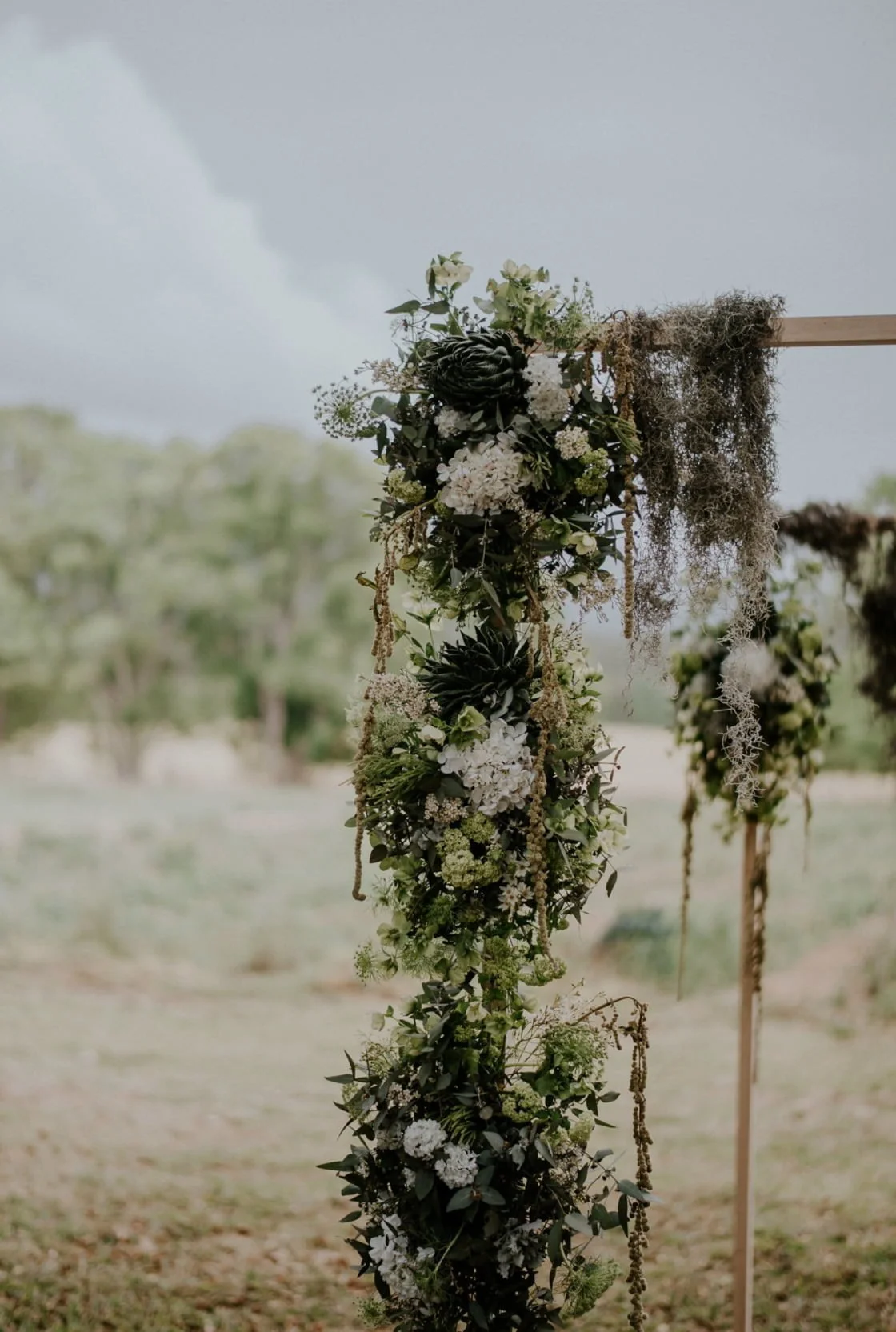 But maybe all things pastel and pretty is more your vibe, if so, be sure to clock that gorgeous ceremony set up by Sydney faves The Sisters as you scroll down. Where talking orchids, dried banksia and blush coloured roses with scattered petals for days. Of course, you’ll be dying to see more of this wedding – so once you’re done with this post be sure to click here. Keep scrolling and you’ll find everything from bambo tipis, to two poplar trees tied together at their tips (talk about thinking outside of the box!) along with hanging greenery to boot and a seriously bright ceremony set up inspo by way of Vic and Col’s Cactus country wedding.