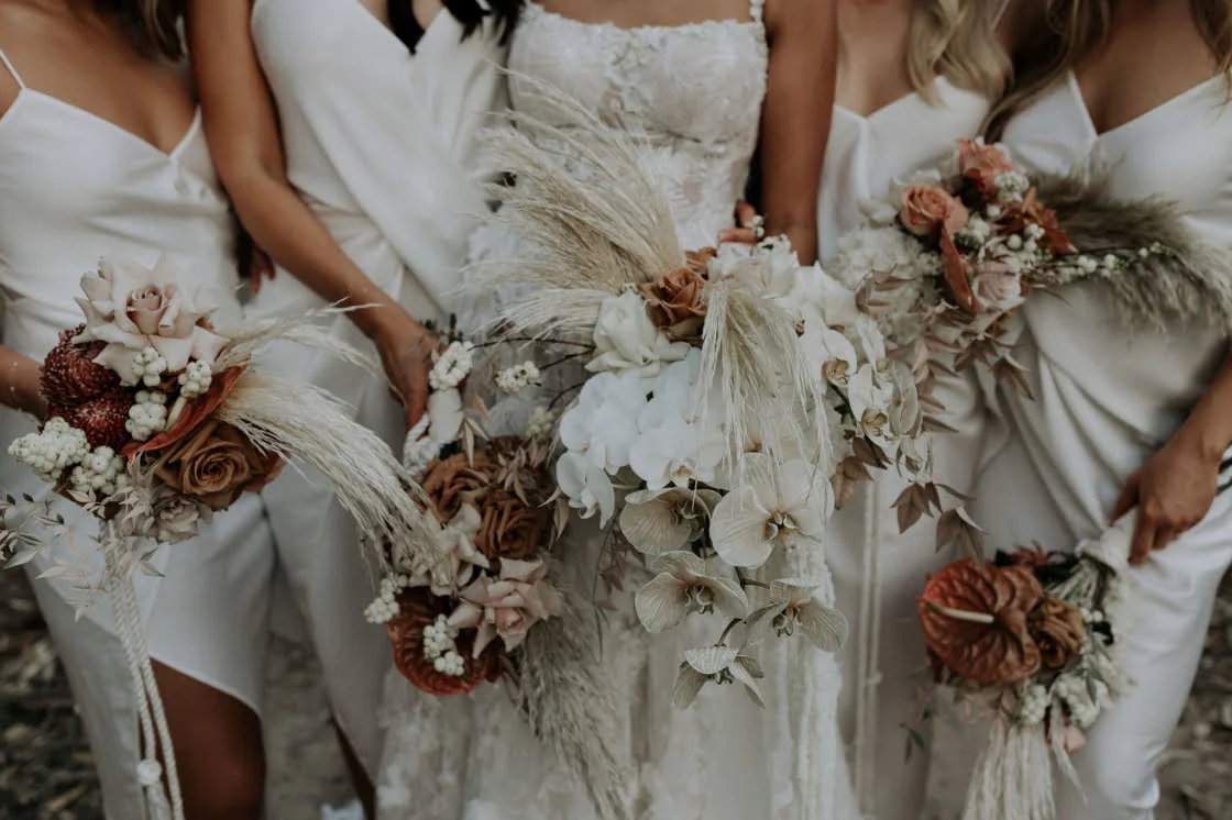 So, what does this mean for you? Flexibility is key! When you are pinning to your floral inspo boards, try to keep in mind broader ideas of what you want: overall mood, colour palette and desired texture. Trust us, your florist will thank you and it will ensure you don’t get too caught up trying to recreate someone else’s bouquet. Plus, it’ll leave room to discover some gorgeous seasonal joys like River & Eve‘s homegrown chocolate comsos (four pics down!) and the gorgeous seasonal flannel flowers in Mrs Gibbons Flowers‘ bouquets below, as well as allowing your florist’s creative vision to flourish (check out FreakHaus’ daring pastel blue and red confection five snaps below).