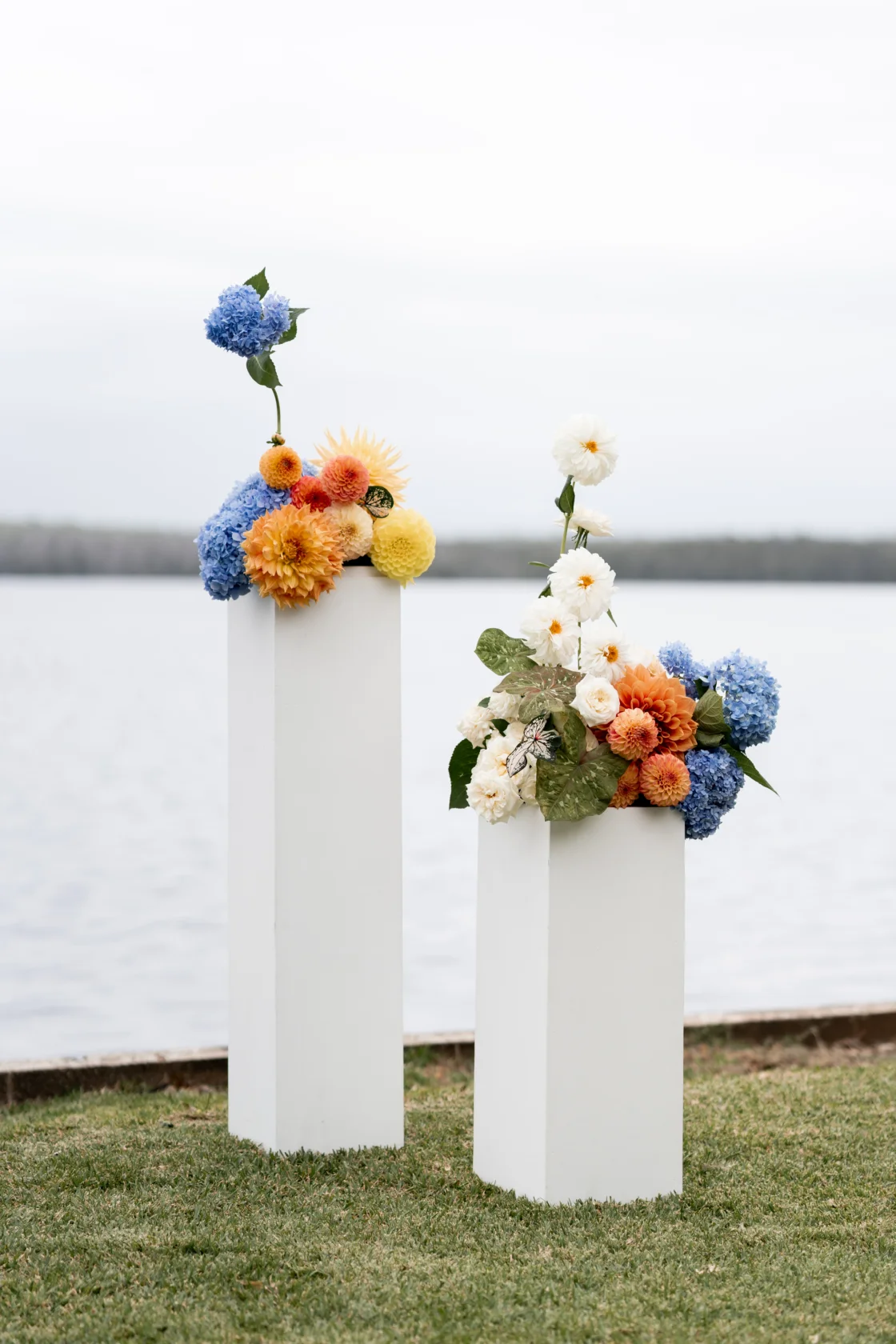 Today, amongst this hefty roundup, we’ve been sure to cover everyone off whether you’re tying the knot on the front porch, in the backyard or amongst a grove of towering trees. Notable mention goes to Eden & Bell’s colourful floral pillars set amongst the backdrop of Audley Dance Hall’s lush surrounds (fourth ceremony setup down) and The Bluebird Collective’s simple coastal-inspired styling five snaps from the bottom.