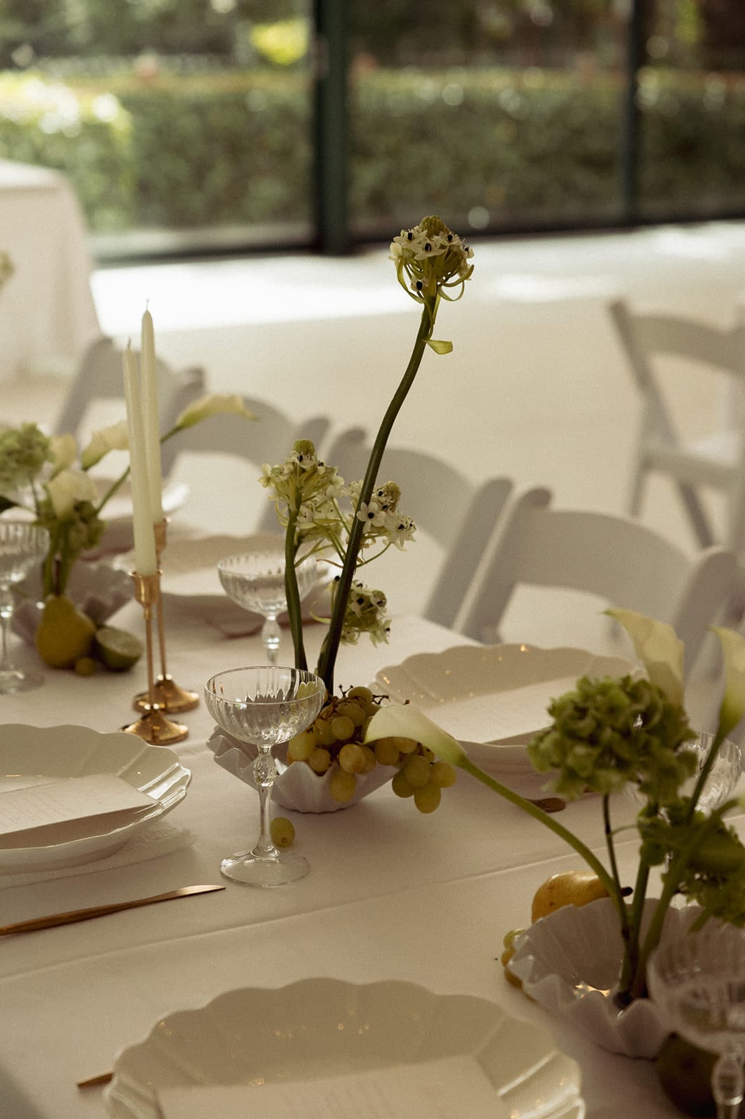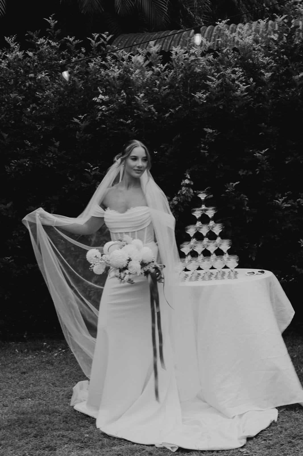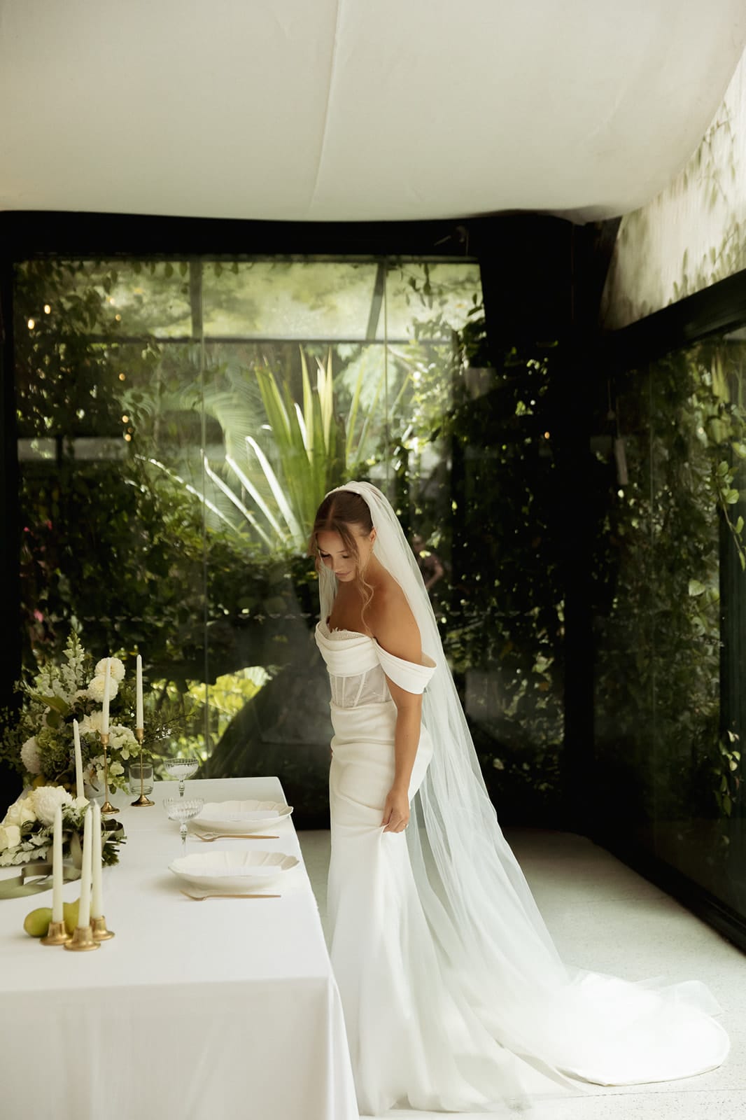 Crystal And The Wild has a real knack for using the power of flowers to create memories and special moments – their handiwork below speaks for itself! Spreading the local love, they opt for Aussie-sourced blooms where possible and also offer styling advice if you need a little more support. Here, combining an “elegant and classic” colour palette with fresh fruits and flora, Crystal And The Wild wanted to complement the “already lush” Sol Garden space. “With this shoot,” founder and creative Crystal shared, “I really wanted the vision to be old money glamour. Once we saw the dress, the vision brought itself to life so perfectly.”