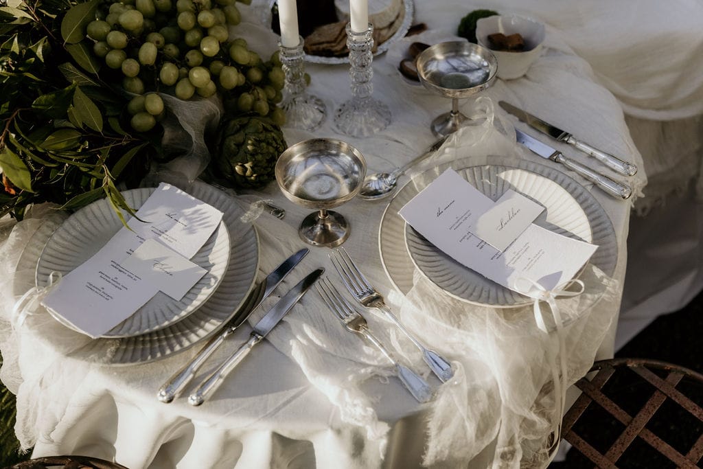 We were immediately taken by the luxuriousness of this styled shoot, the creative vision of stylist Giselle from Sugar Blossom Events. “I was inspired by the European appreciation of ‘the beautiful life’, where simple pleasures and indulgence meet in a dreamy, modern-day romance,” she shares.