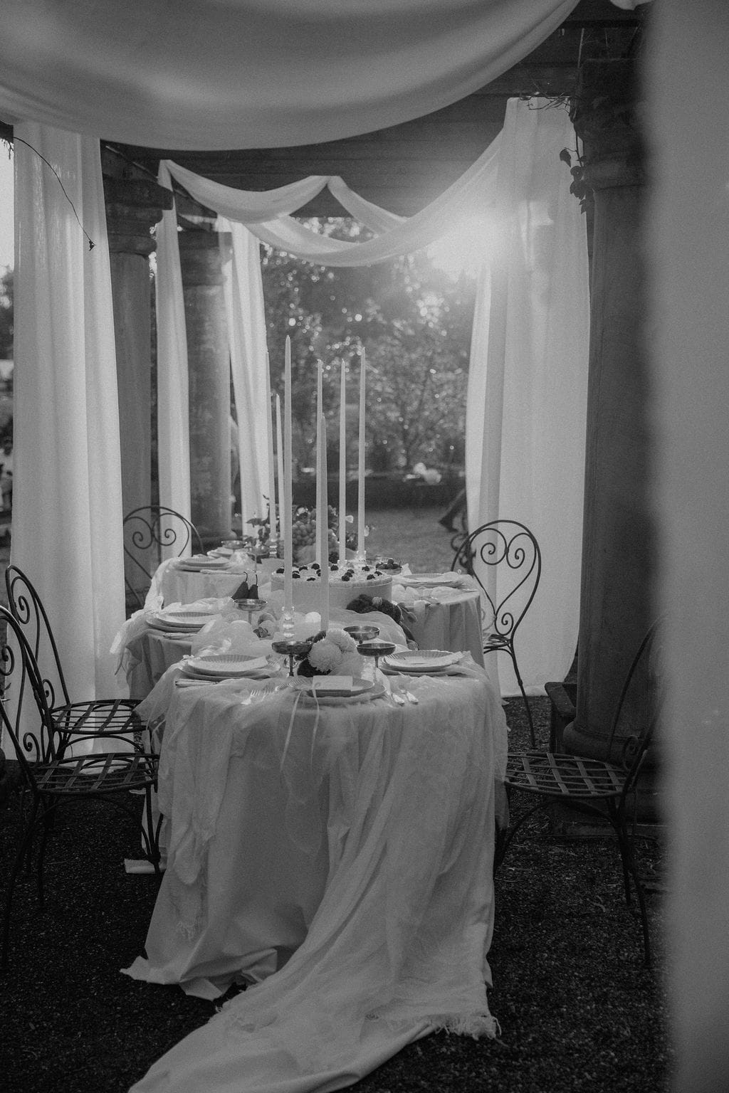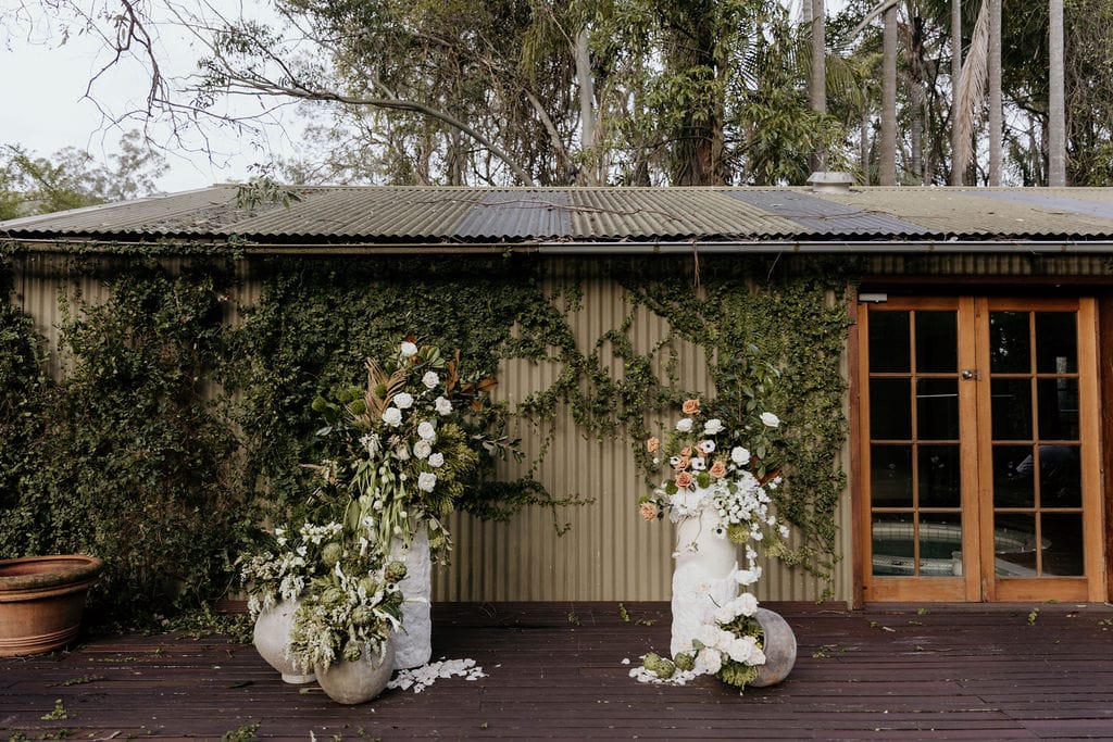 Hunter Valley-based stylist Sugar Blossom Events’ style is naturally ethereal, romantic and timeless with a touch of whimsy. When working on this shoot, the prominent, European architectural features of the colonnade present at venue Leaves & Fishes took centrestage. “They are softened with delicate draping, immersive sunset, and natural, effortless blooms. Wrapped in these romantic surrounds, this love story unfolds, exploring the decadence, playfulness and celebration that shape the fabric of this beautiful life,” says Giselle.