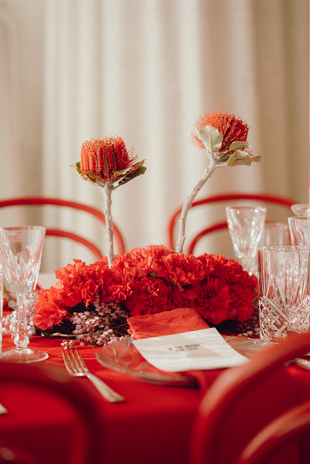 Kevin Twan, founder of Melbourne floral studio Soya, is responsible for these sensationally striking blooms. Arrangements that come out of the Soya studio are sculptural and a little unexpected in nature. In short, works of art. Referencing In The Mood For Love’s iconic colouring, Kevin leant into nostalgia and moody romance, reaching for shades of red as well as pink orchids and chrysanthemums – “a subtle nod to flowers popular during the 1960s in Hong Kong,” Kevin explains. “These were juxtaposed with Australian natives like Banksias, and sculptural, modern florals including anthuriums.”