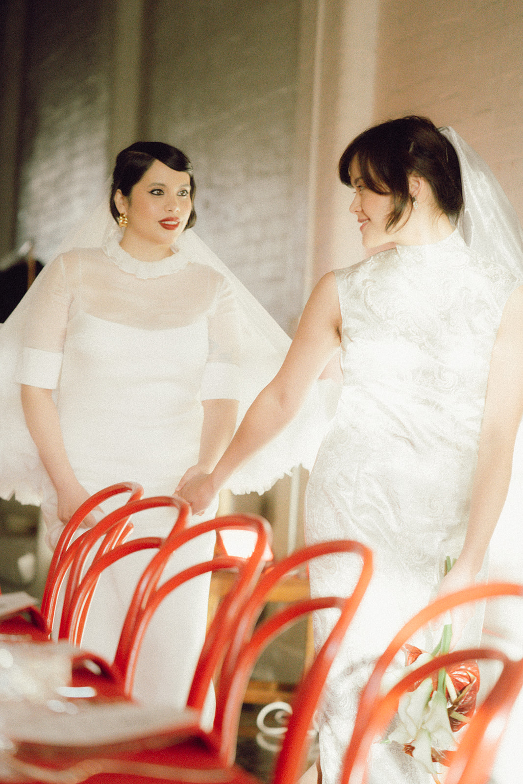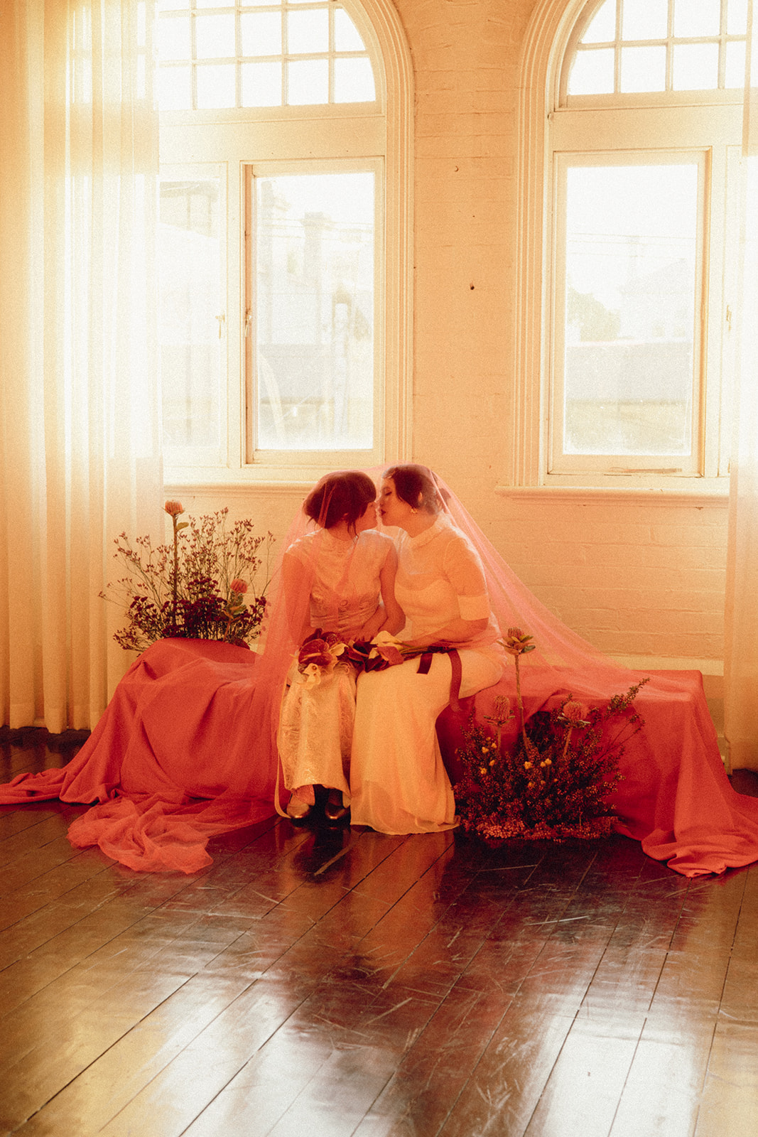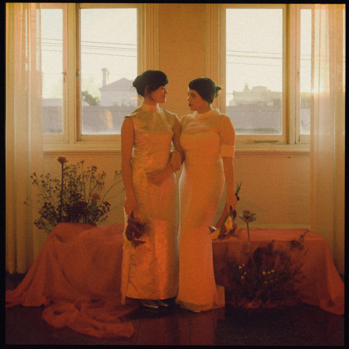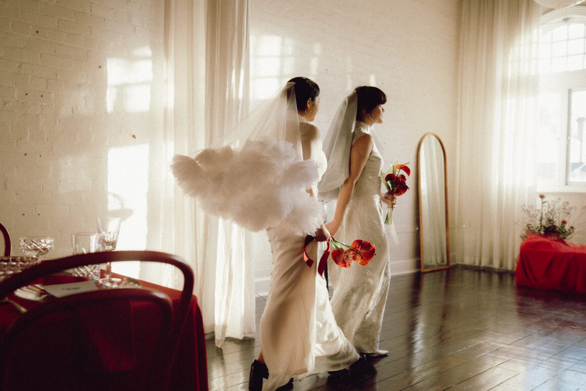 Within these pics, wearing their celebrant cap (or should we say signature wide-brim), eagle-eyed readers might recognise one of our fave Melbourne legends—Jamima Wu (aka Celebrant Jam). As we shared above, Jamima helped spark the inspo behind this fiery concept, and tracked down the talent too. “I roped in friends (and real-life couple) Bonita and Lucinda to star in the shoot as the models and brides,” Jamima shares. “The shoot was a roaring success thanks to the dream team of creatives coming together, all bringing their skills and good vibes to make the vision come to life.”