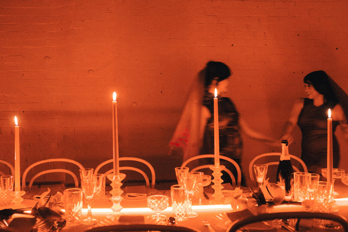 Based in Melbourne, planning and styling specialists Inner North Studio are known for bold, avant-garde, and inclusive weddings. Weddings like Kath and Dave’s rich red celebration, which you might remember from Issue 41. “Weddings that feel personal, unique and don’t look like everyone else’s,” as founder, Kath Hunter, explains. Totally non-traditional, Kath says that this shoot encompasses everything Inner North Studio stands for. “. . . The shoot reflected the moody, shadowy, red-hued, mid-century Hong Kong aesthetic of the film, but was infused with modern elements, including an understatedLola Varma gown and a neon table scape, set within a minimalist studio in Collingwood (Smith Street Studio).”