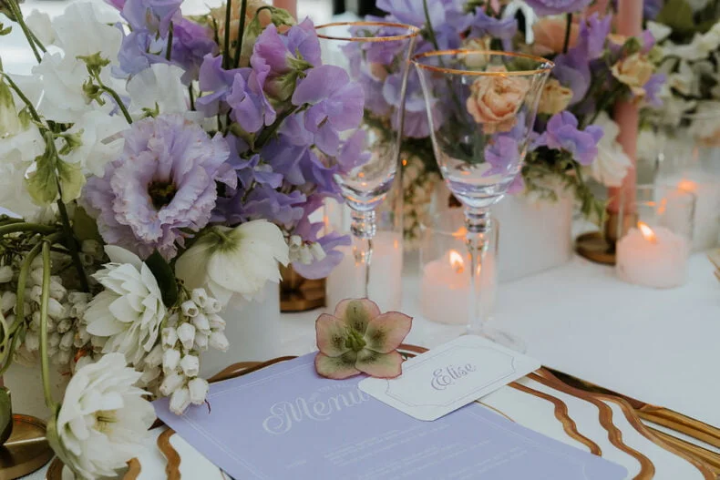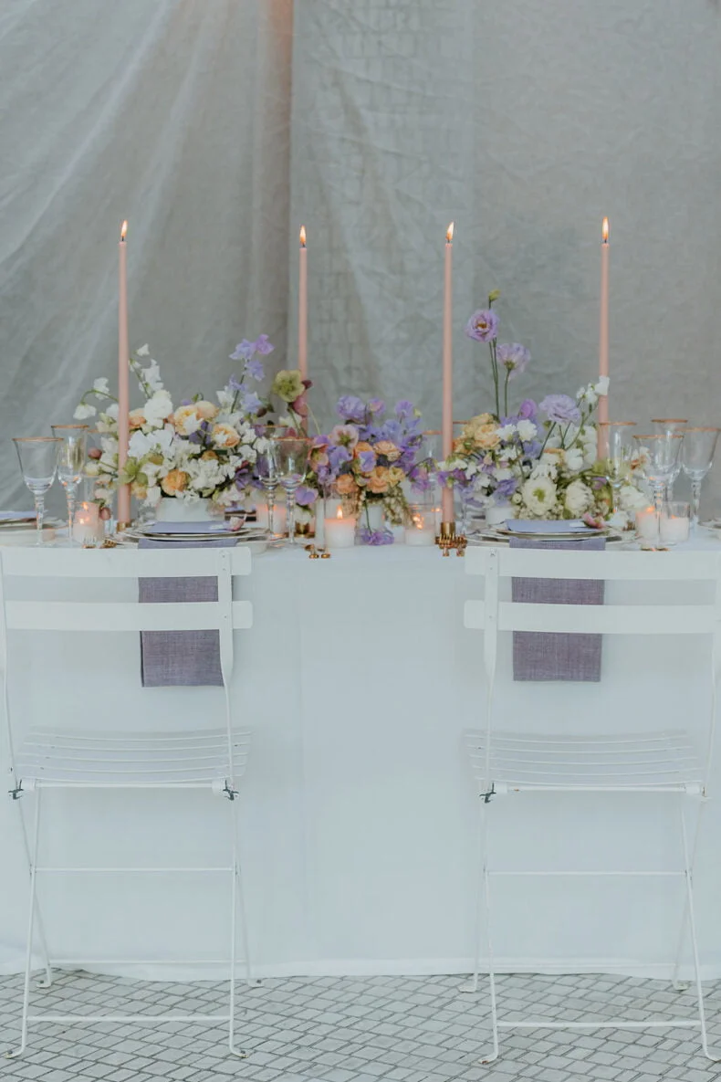 For Elena, event planner and stylist behind this lush styled shoot and owner of LNR Events, her inspo for the day was the meaning behind the color purple and its association with royalty and luxury. “I wanted to focus on the softer tone of lilac, as it blooms in spring and evokes feelings of serenity and romance,” she says.