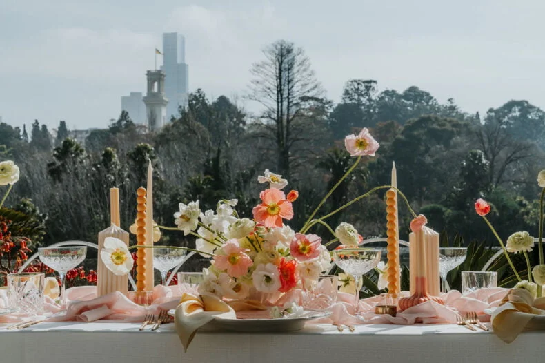 Located in the heart of Melbourne’s Royal Botanic Gardens, The Terrace was a no-brainer for the creative team when deciding on a venue. With uninterrupted views across the Ornamental Lake and city from the covered alfresco area, the space played a huge role in the overall vibe. “The Terrace is bathed in light and surrounded by green foliage, which provided the quintessential springtime backdrop for this concept,” the team say.