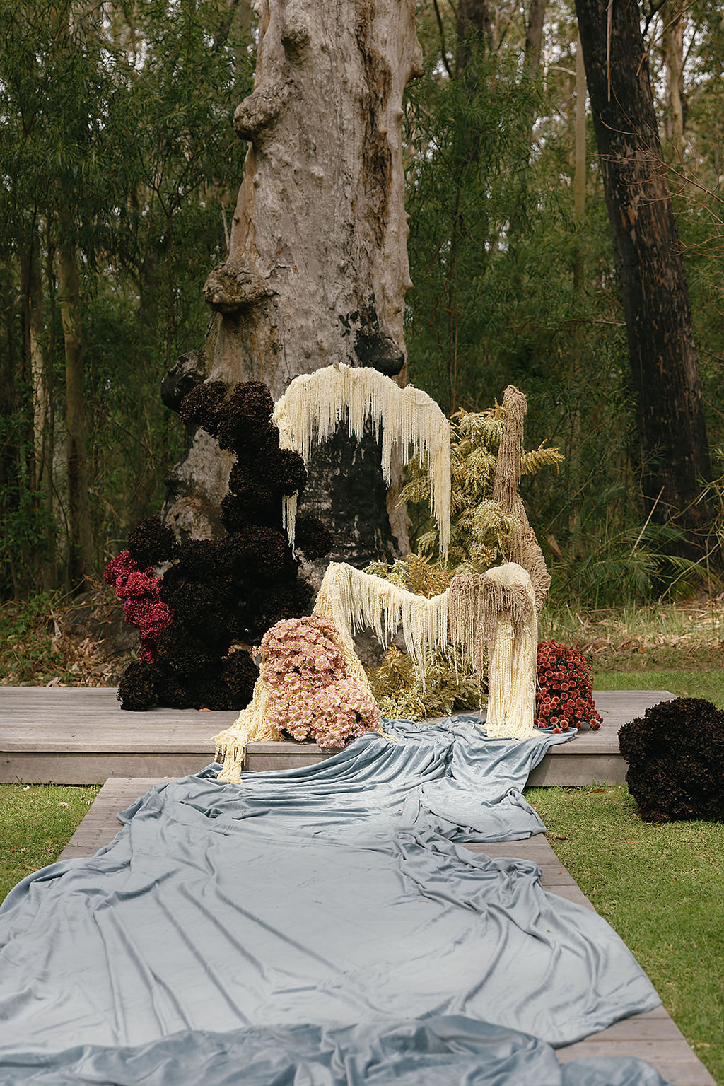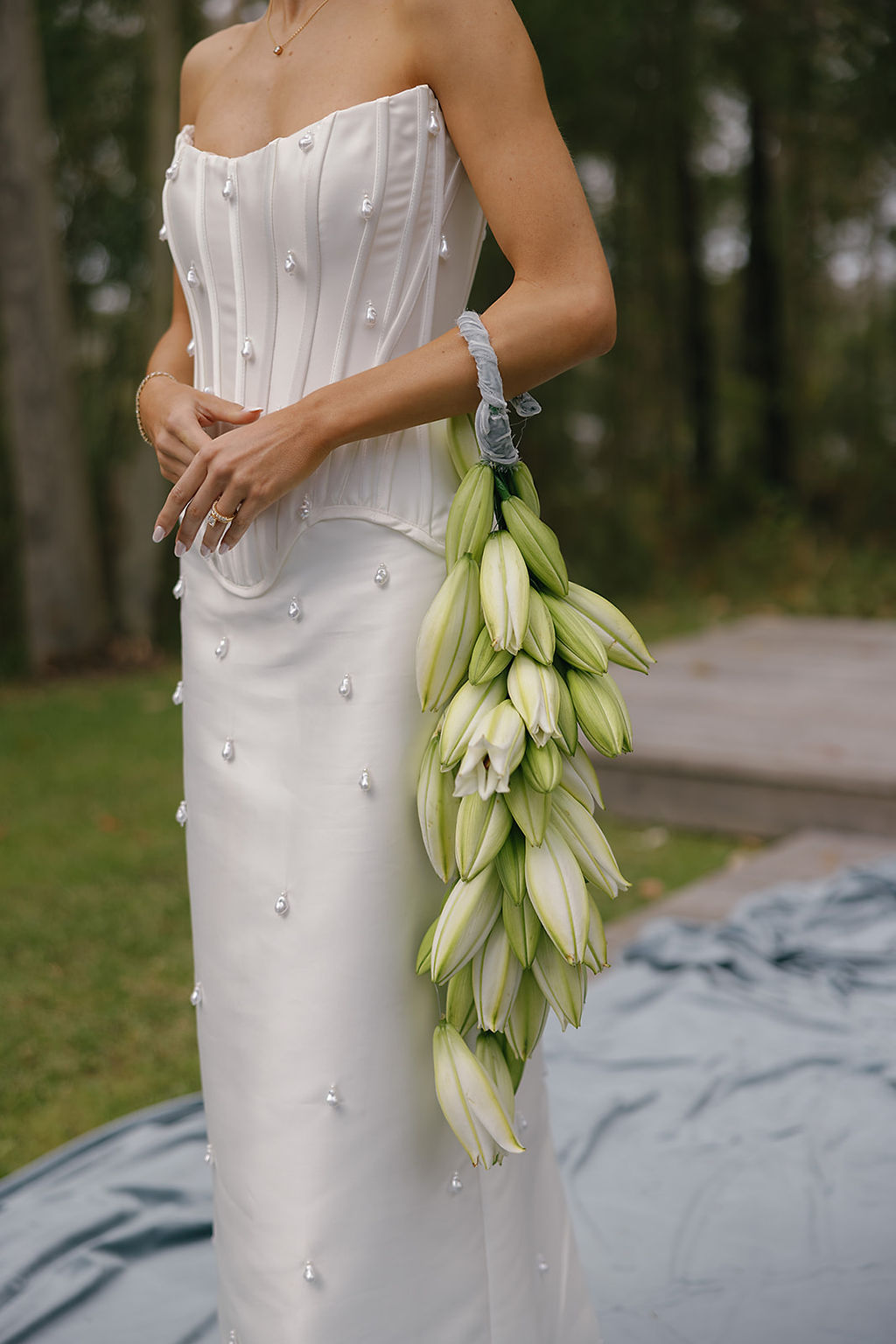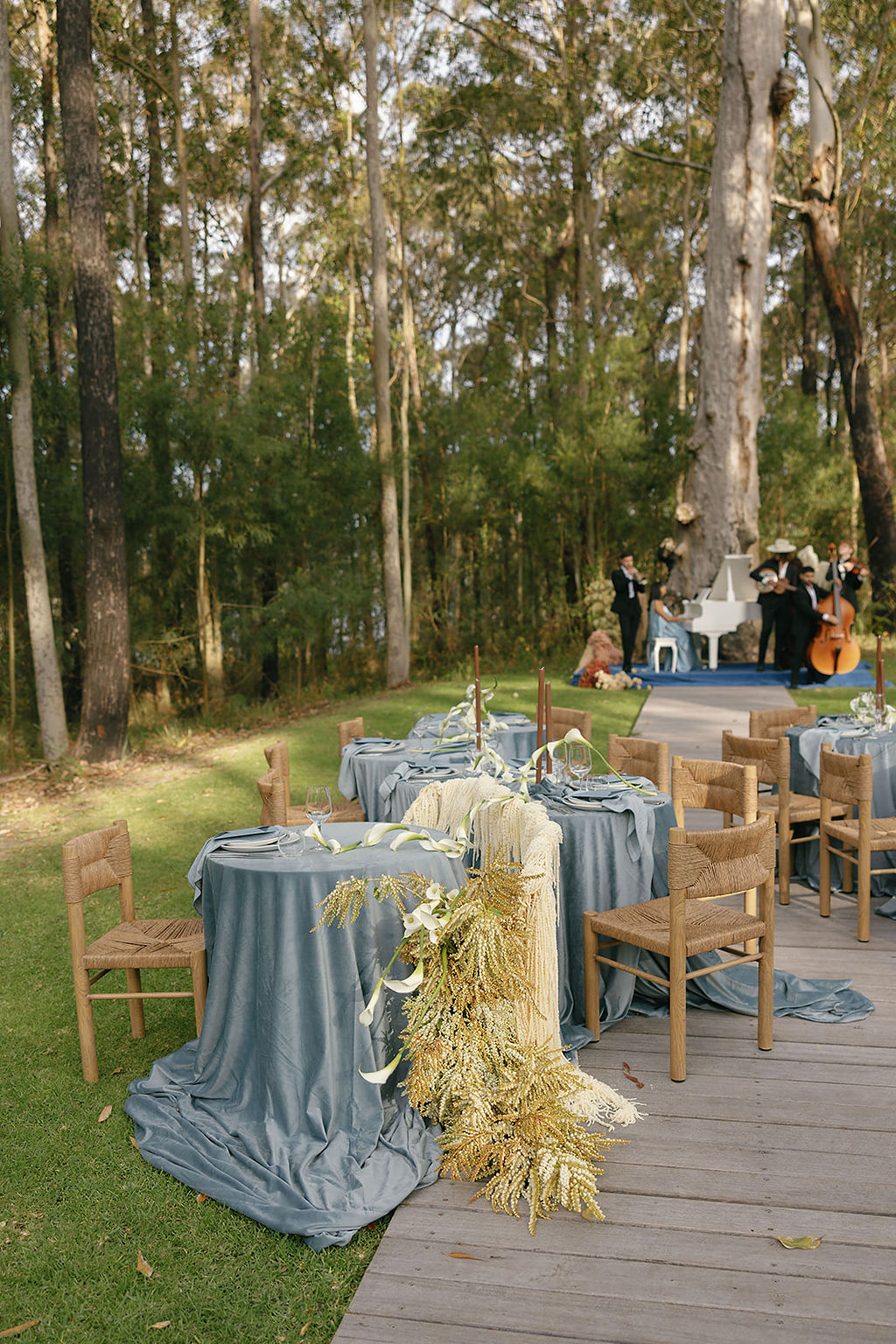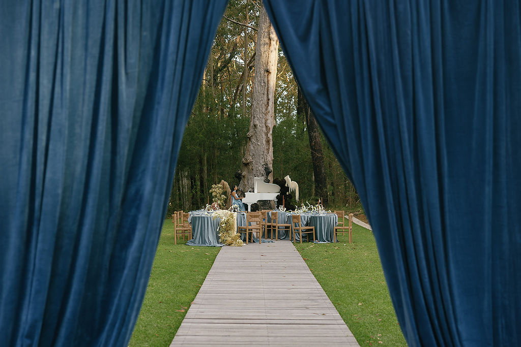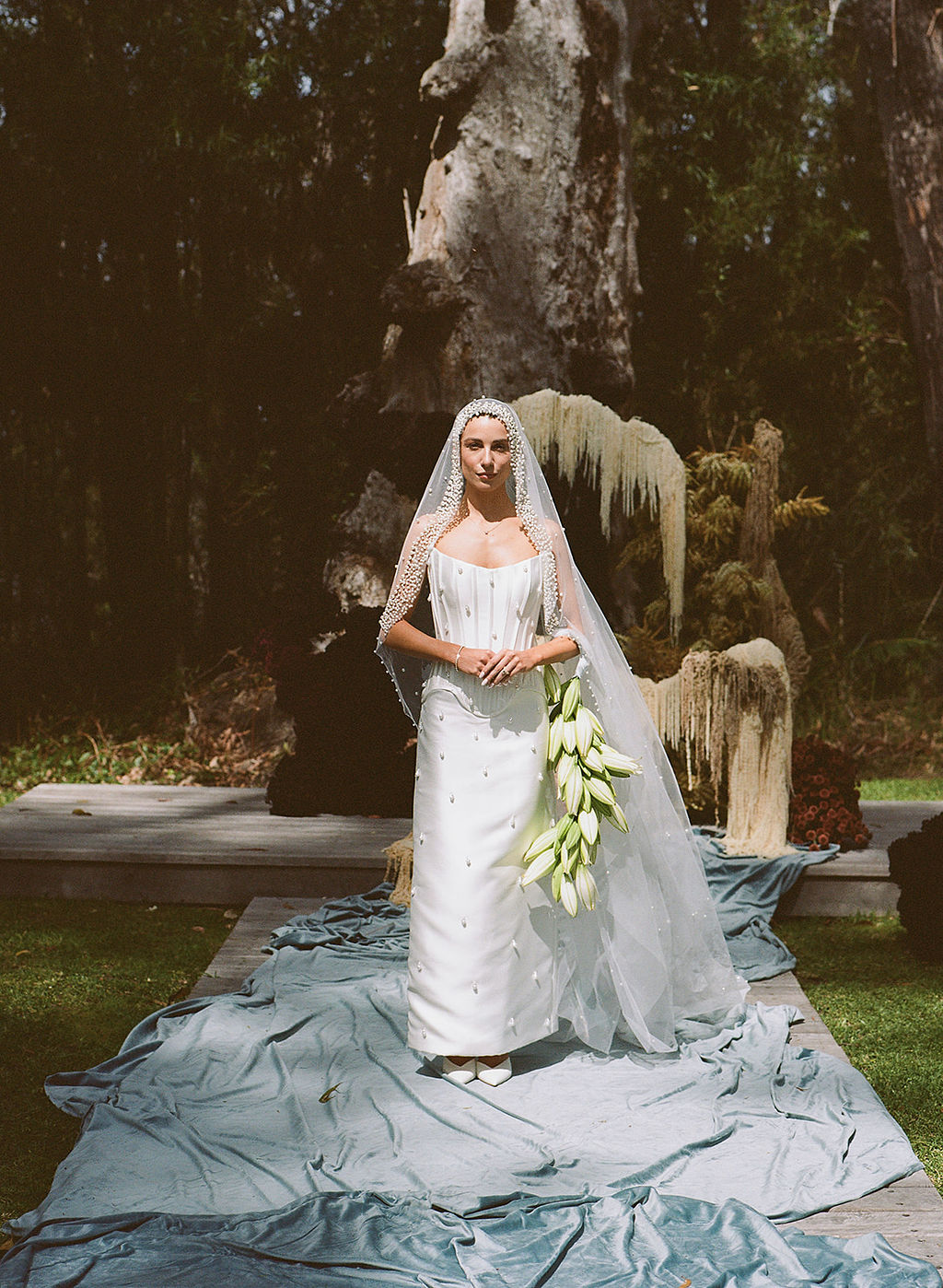 Effortless yet easy-going elegance set against raw natural beauty – this shoot feels right at home at The Jackson Ranch (one of our fave coastal places to get hitched). It’s not too far from the city (a 3.5hr drive from Sydney; 2hrs from Canberra), which is definitely appealing. But it’s the versatility of this venue that continues to capture our hearts. Think leafy canopies, lake glimpses, moody rainforest moments and the coastline not far away. “The Jackson Ranch feels like a secluded luxury retreat, tucked away from Sydney’s usual hustle and bustle,” says Kyle. “It’s calm and quiet, a place that invites you to slow down, whilst still having a high-end feel.”