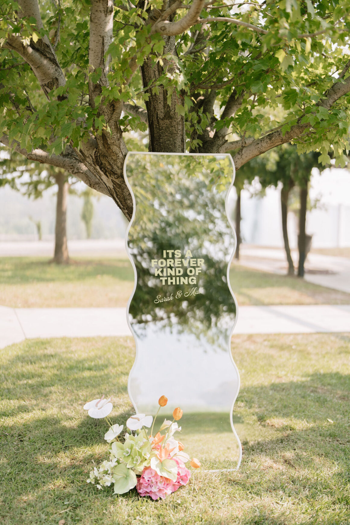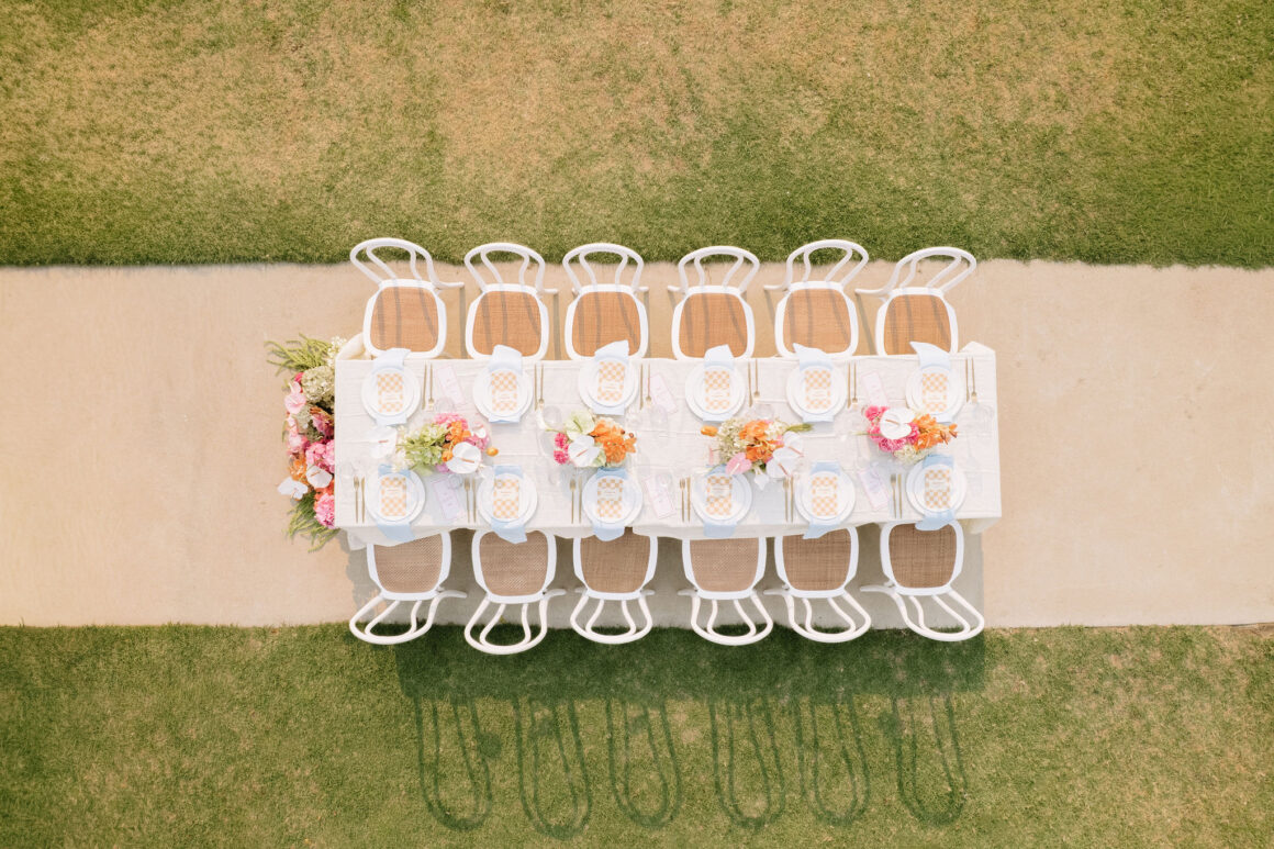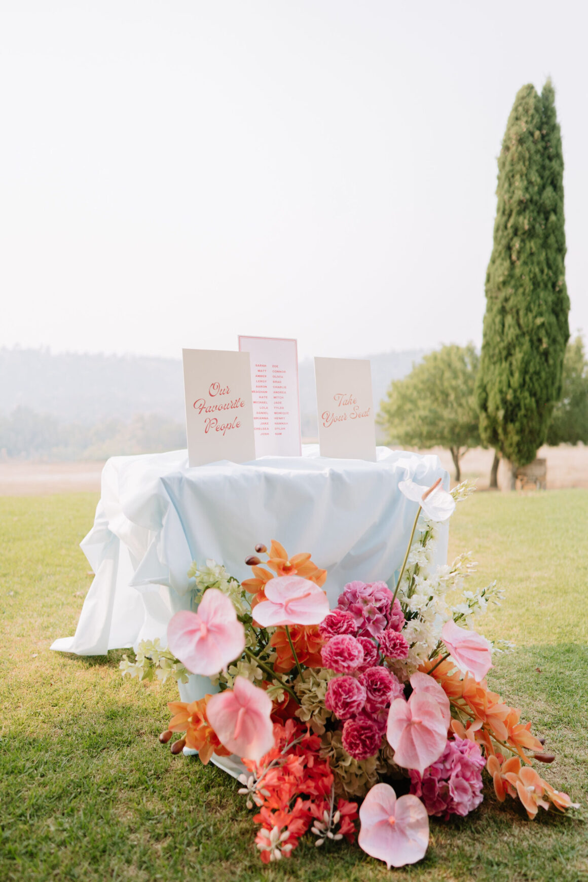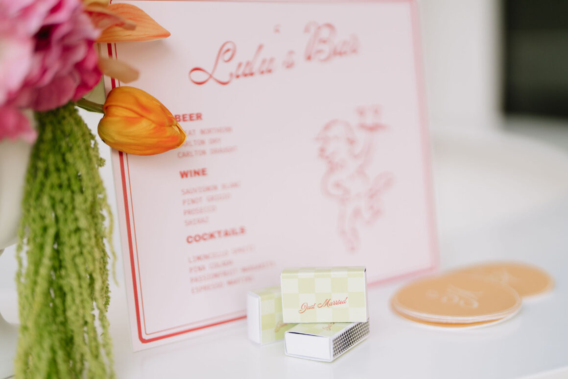 An additional layer of fun comes in the form of print artistry by Palm Creative Studio. Collaborating closely with clients to weave in personal touches, bespoke event stationery is their jam. “We drew inspiration from the vibrant charm of Palm Springs, embracing bold and cursive typography, bright colours, and layered textures to create a look that feels modern, joyful, and effortlessly elevated, incorporating European heritage sayings and beloved pet names throughout the pieces.”