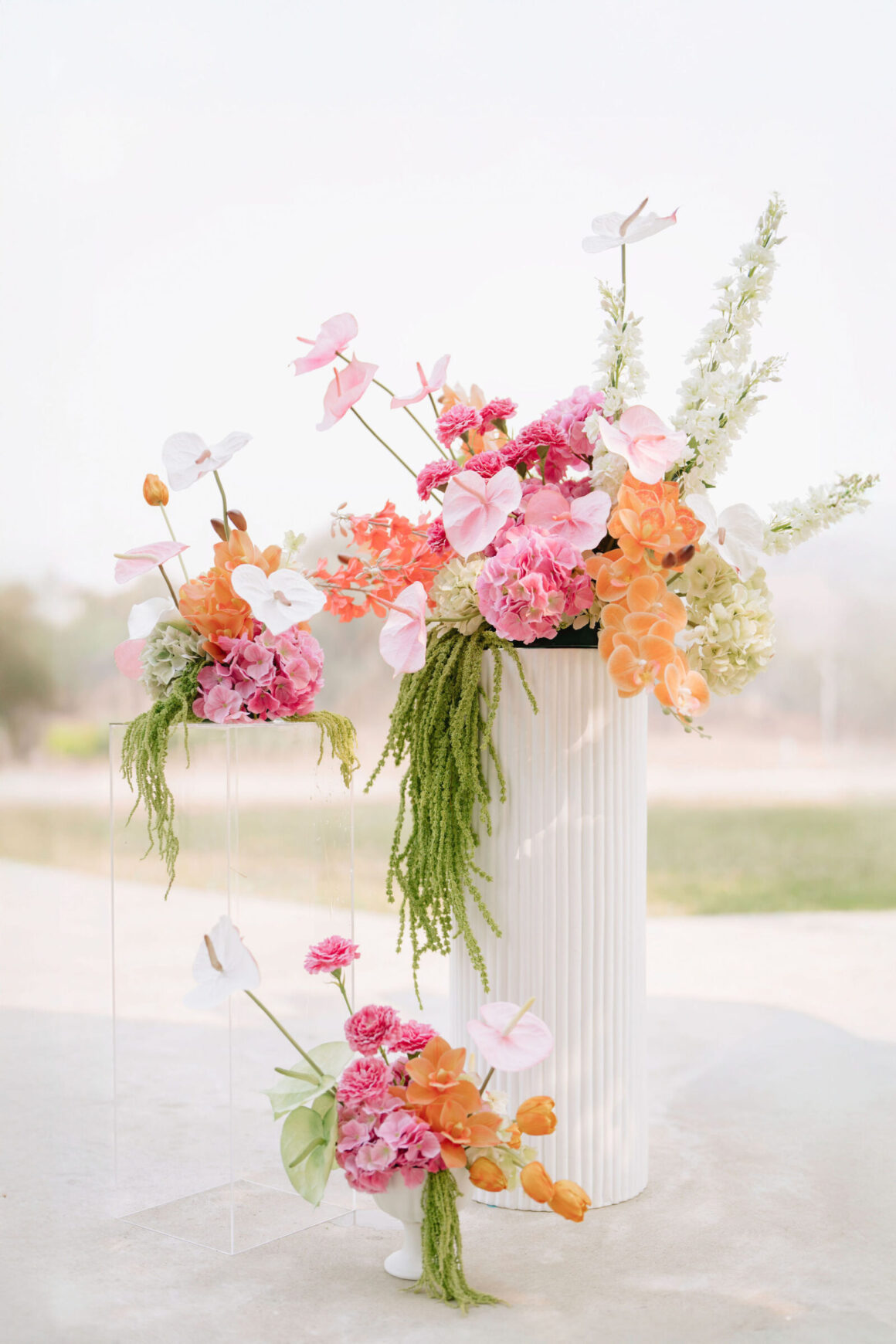 A sculptural explosion of various pink hues, pops or orange and ultra-vibrant green, these blooms by Flowers Naturally demand attention (in the best way possible). “My absolute favourite part of my job is creating statement arrangements,” says Brooke of Flowers Naturally, who’s been working with blooms for 22 years (!!) “I love designs that feel a little bit different and experimenting with bold colours and interesting textures. This shoot was inspired by Ellen’s vision, I went with the vibe, and got to have a fun creative play day with it.”