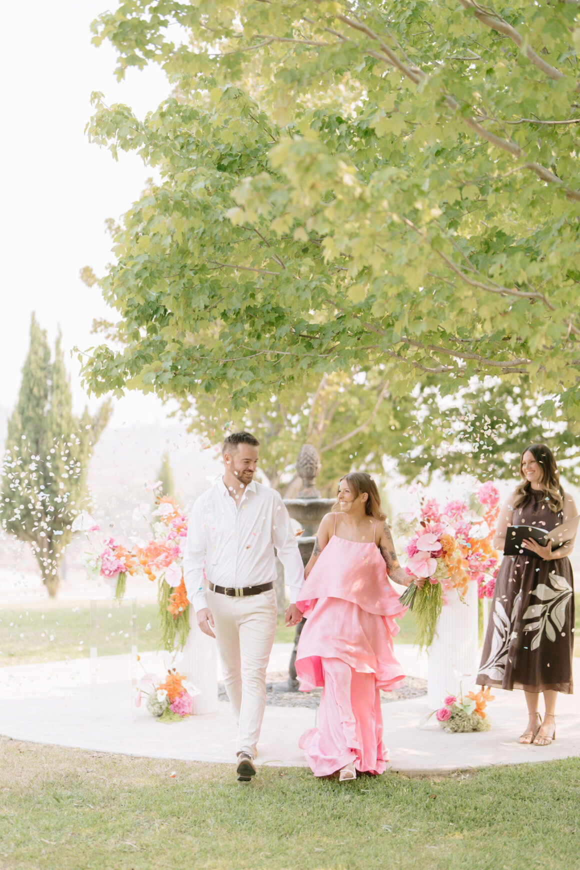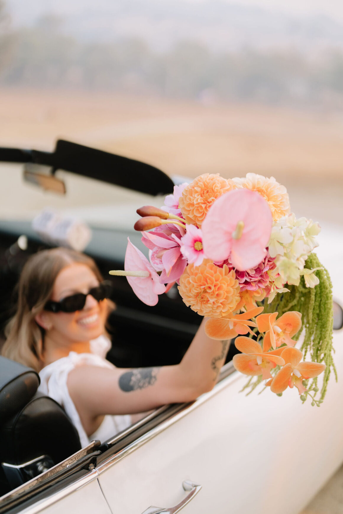 A story of feminine pinks and vivid petals, unexpected bridal dresses, and high-energy details that pop (but play oh-so-nicely) with the picturesque winery setting surrounds. Plus, just for good measure, a vintage-style set of wheels to ride off into the sunset. Total dreamscape.