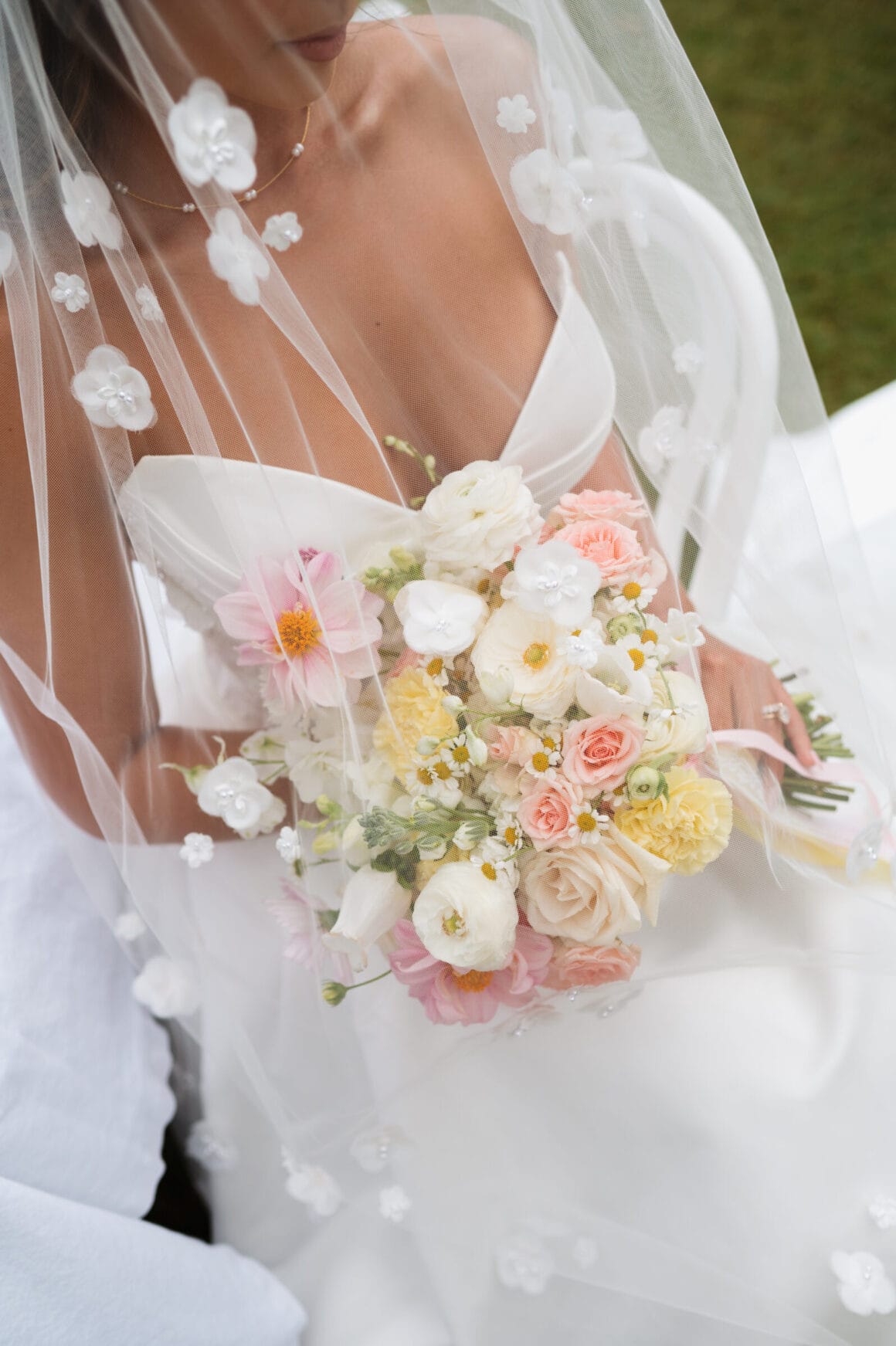 Romantic bridal bouquet with soft pastel flowers and lush greenery, styled for a modern wedding.
