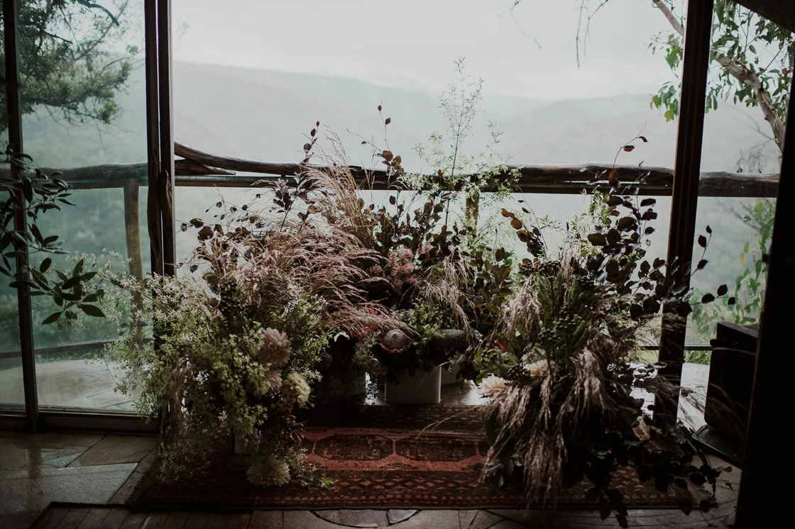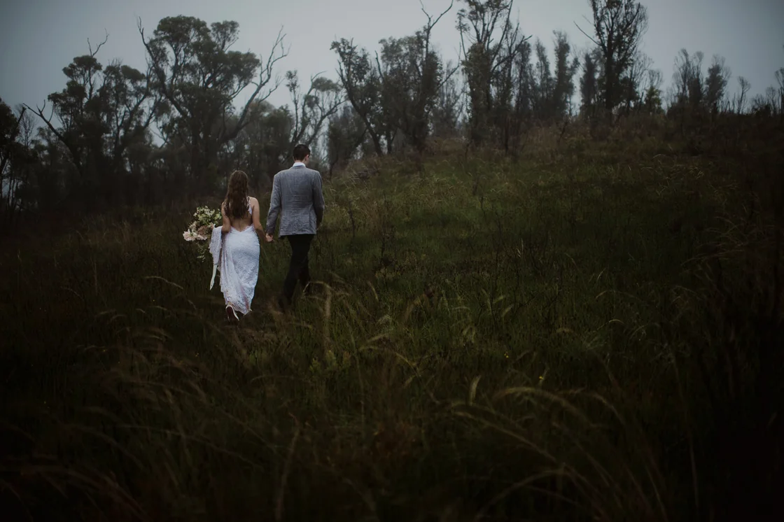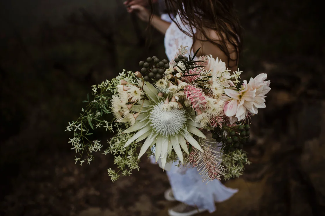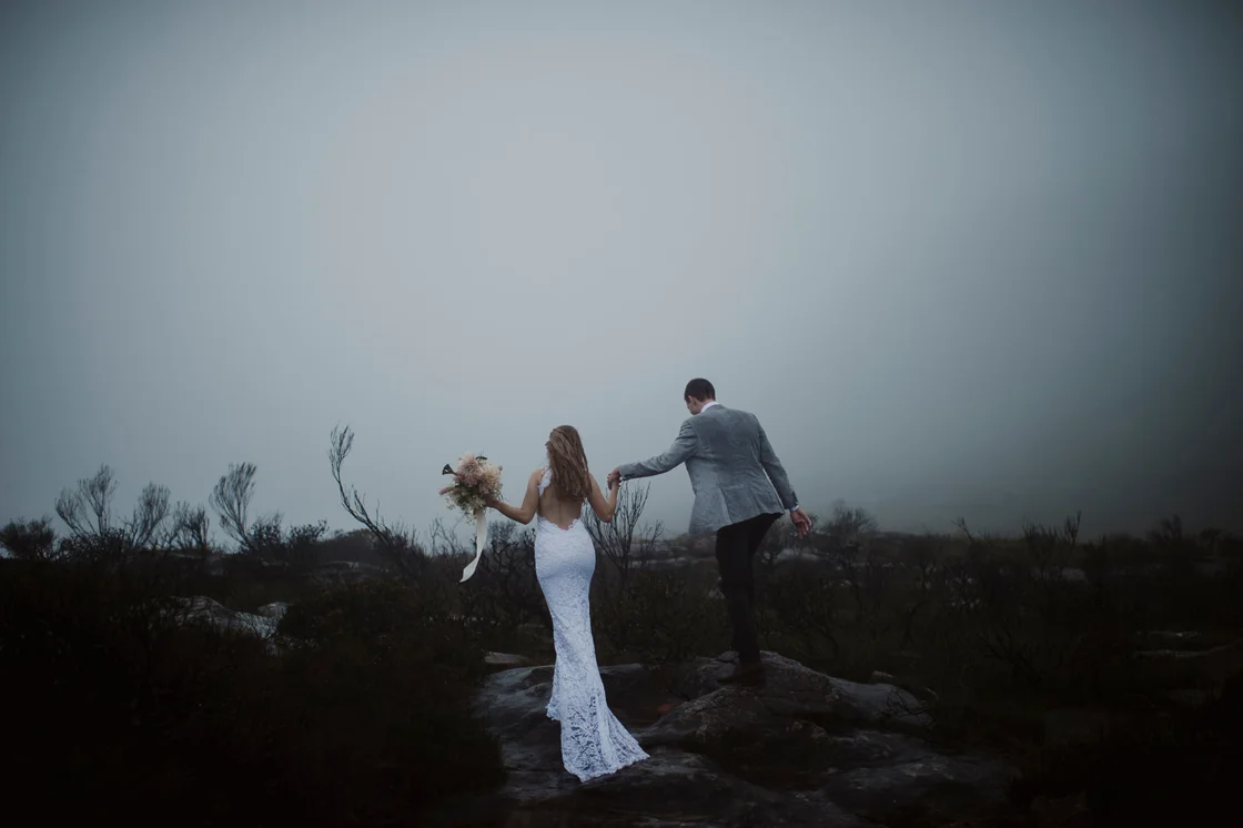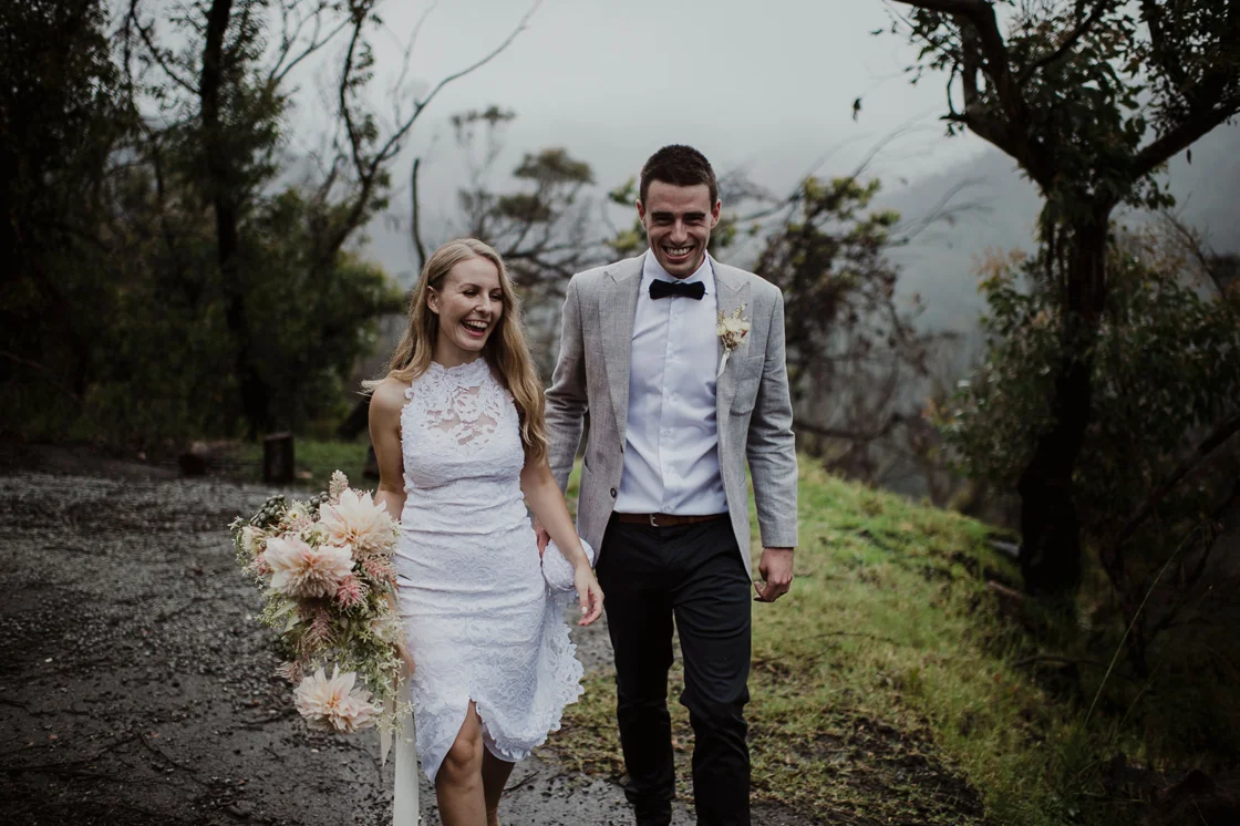 FAVE DETAILS “One of our favourite details was the venue itself. The Treehouse Blue Mountains is one of the most spectacular accommodations we have ever seen! It sits almost 11m above the ground in the tree canopies overlooking Wollemi National park. You could hear the river flowing at the base of the valley, the fog and cloud formation changed by the second and the view was just breathtaking! Although it was December it was actually quite cool due to the rain, which was perfect as there was a fireplace in the treehouse and made the mood and setting so much more magical! Our other favourite detail of the day was hiking up Mount Banks in the pouring rain for our adventure shoot with our photographer, Barefoot & Bearded, and cinematographer, The Lucky Ones. It had been raining for a few days so the ground was quite wet, we hiked 20 minutes up the mountain in our raincoats (we planned in advance as the weather wasn’t looking good), took them off at the top of the mountain and got absolutely soaked walking back down. But this memory I will never forget! “