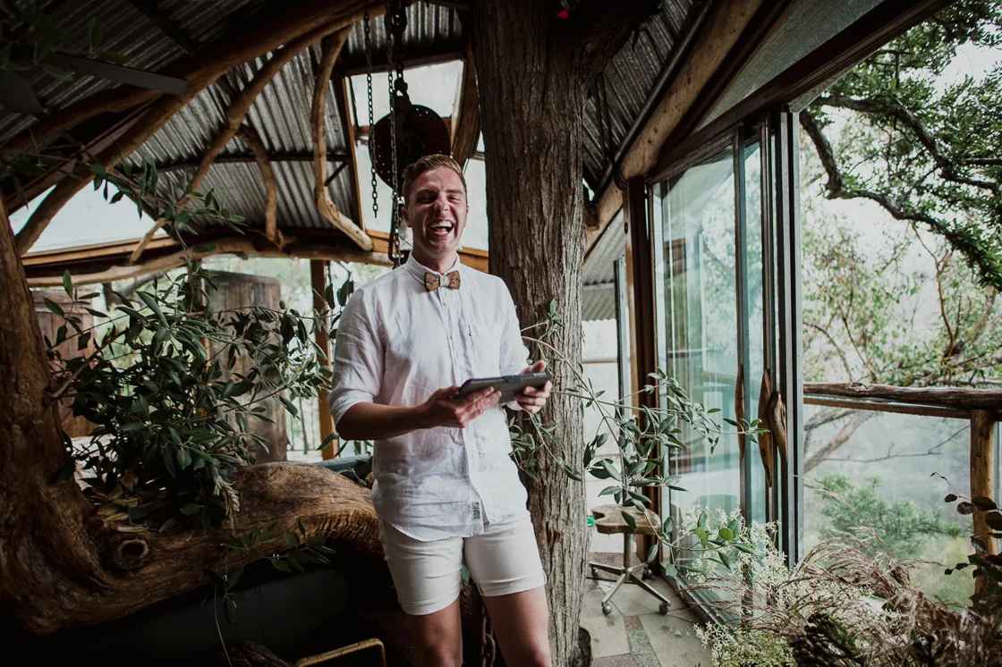 LITTLE LOL “Our celebrant Monty, of HolyMatrimonty, and what he termed the ‘stripper pole’ in the treehouse (also known as the support pole!). As soon as he walked in, the pole made his day and after we got married, of course, we all had to get a photo with the pole and had a great laugh.”