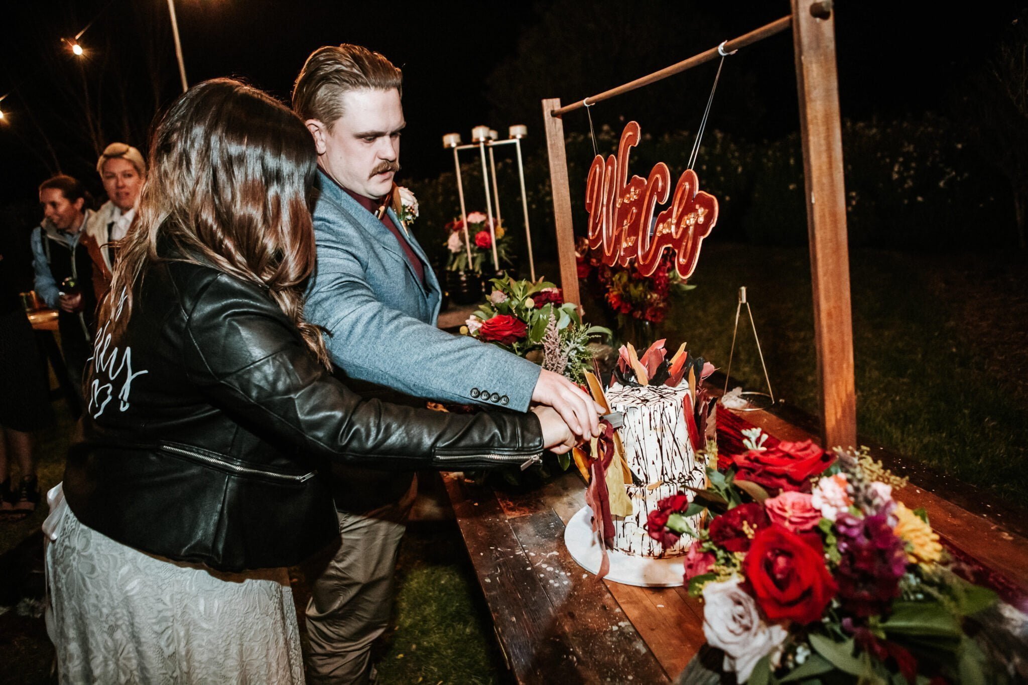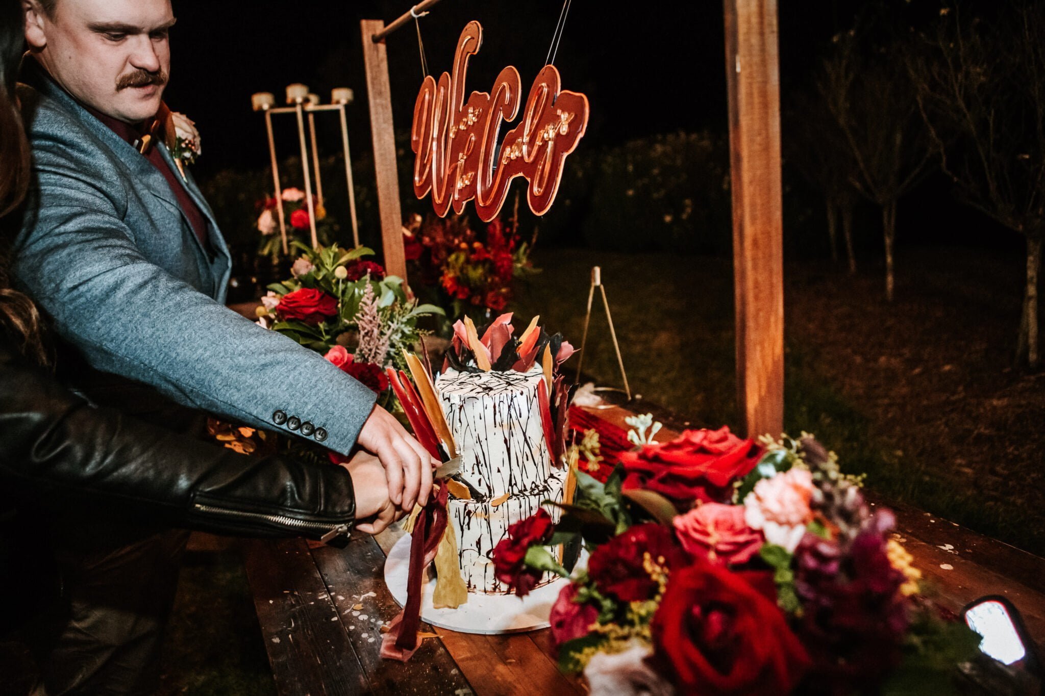 FAVOURITE DETAIL “My personalised jacket. I have never been a super girly girl, and barely ever wear dresses. I knew I wanted to wear a dress on our day, but wanted to feel a little more like myself, and had my talented friend Gillian from The Marker hand paint my favourite leather jacket to match my R.M. Williams boots. Also, for our first song, our musician Joe Mungovan learnt and did the most AMAZING cover of INXS ‘Never tear us apart’. This is such a special song for Bradley and I and we both love the original, but now long Joe’s version, so much more.”