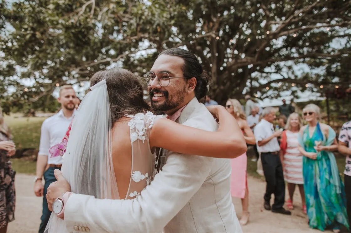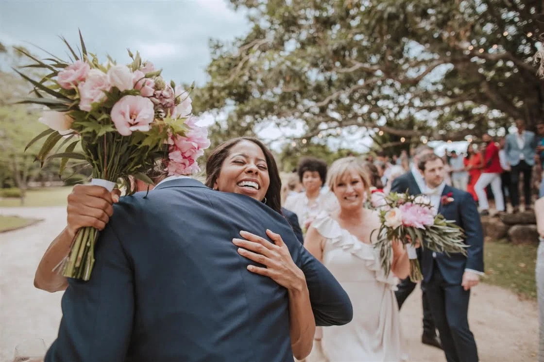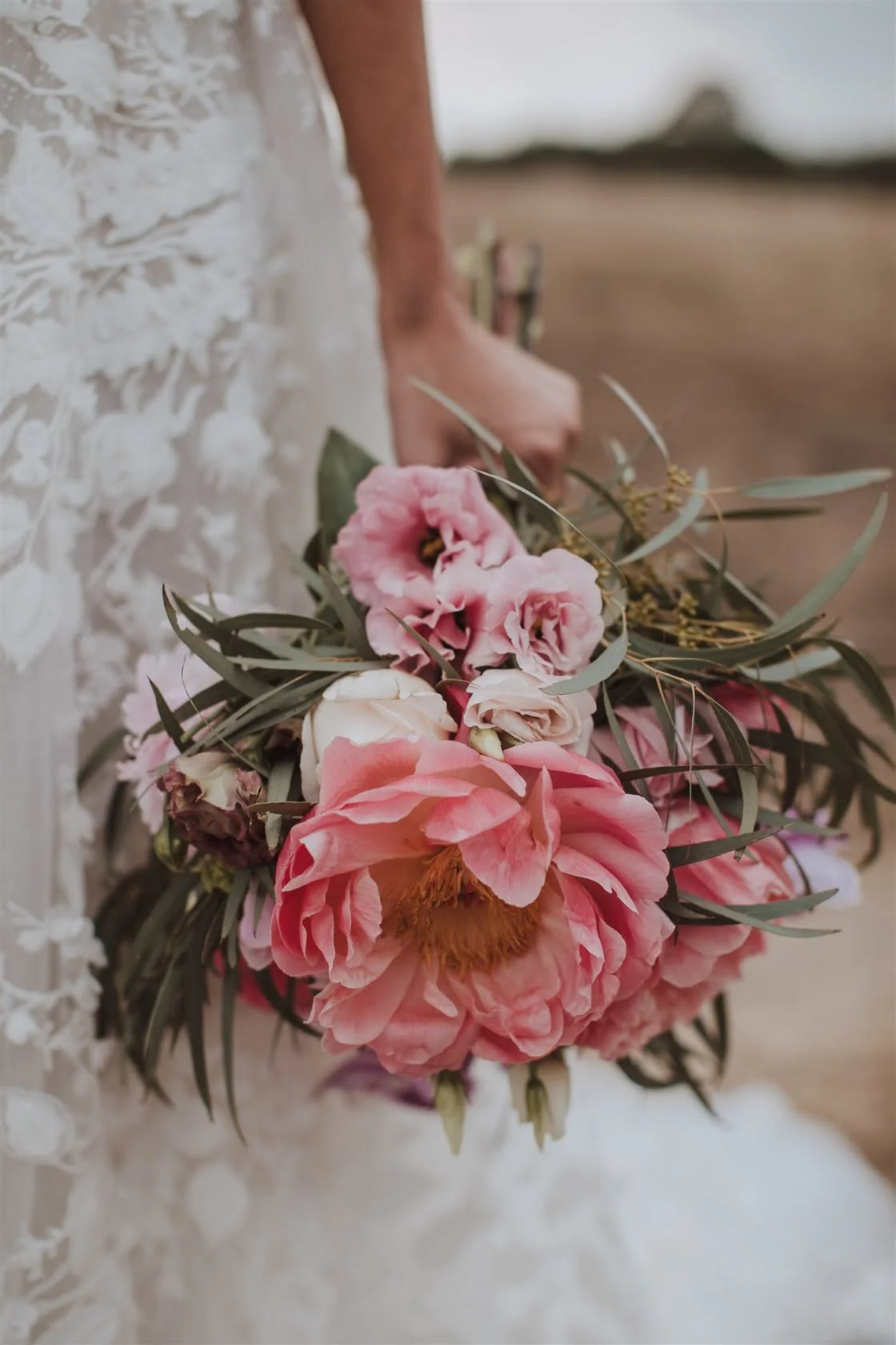 THE VIBE “We wanted to keep the theme true to Byron Bay using bohemian accents and highlighting natural materials like timber, linens, and cane to blend in with the natural surroundings. We used pops of colours throughout our floral arrangements to make a statement in our ceremony and reception setting and told all of our guests to wear colour or loud printed shirts.”