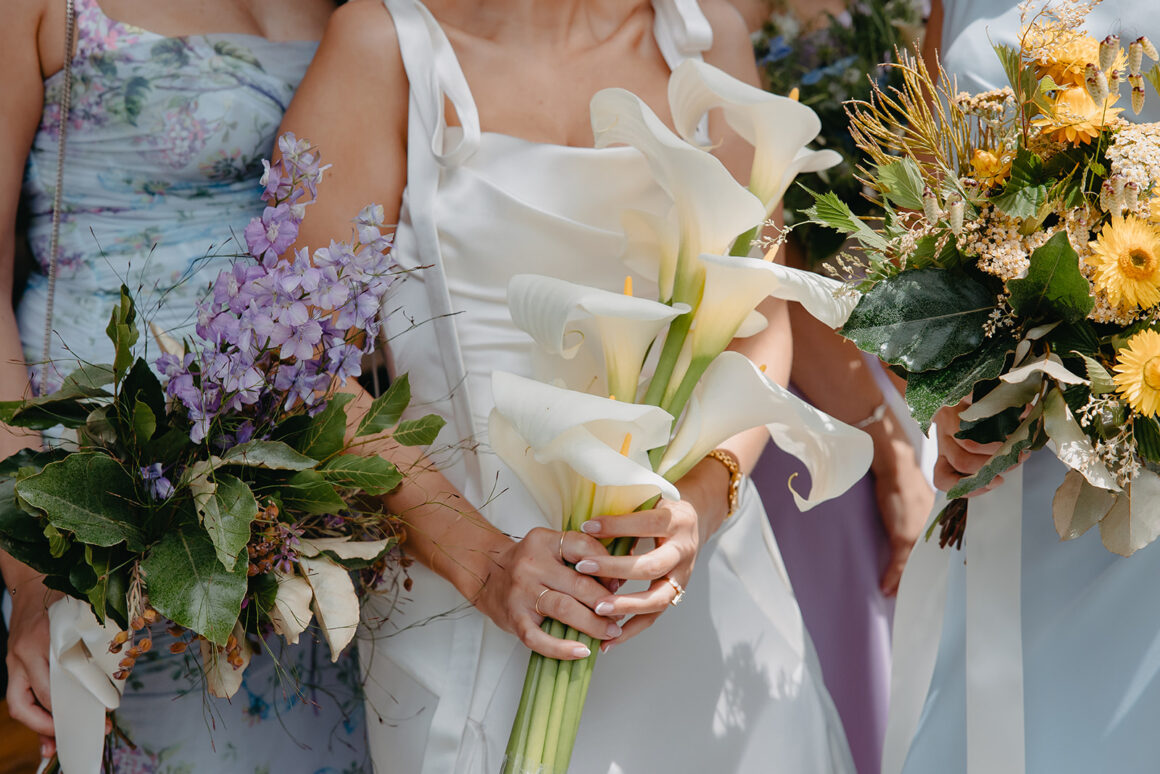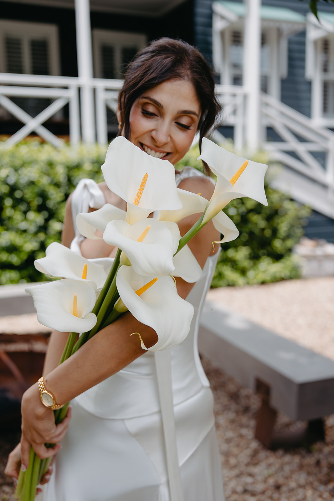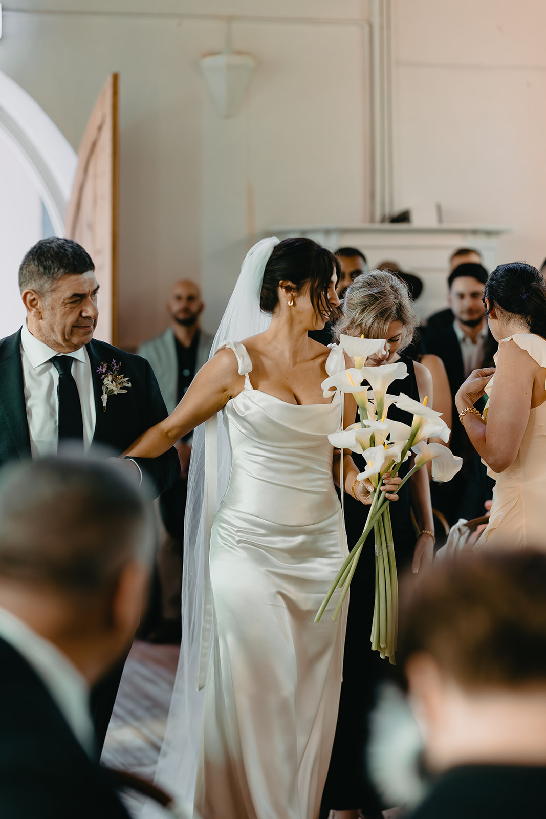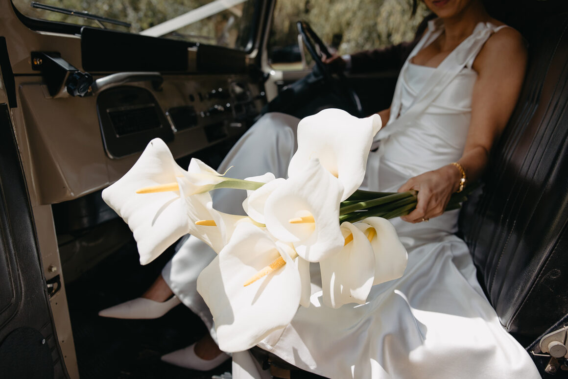 “One of the most special moments of the ceremony was how we created my bouquet. With the help of our florist Elissa (Larkspur Flowers), we placed a single stem calla lily on ten guests’ chairs. As I walked down the aisle, I collected one from each of them, building the bouquet as I went. When I reached the altar, Marco’s mum handed me the final stem, my mum gave Marco the ribbon, and he tied it all together. It felt like a beautiful symbol of everyone who had played a part in our journey.”