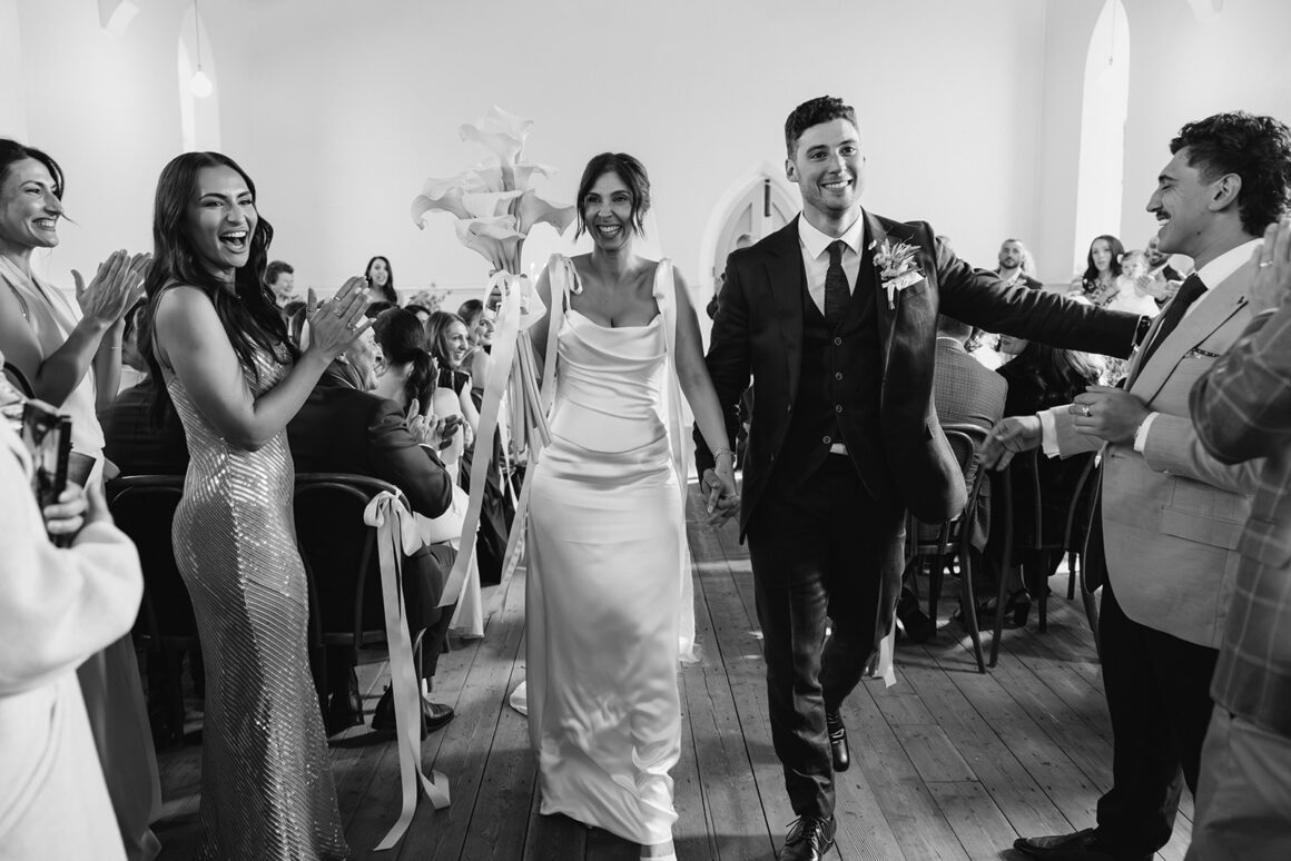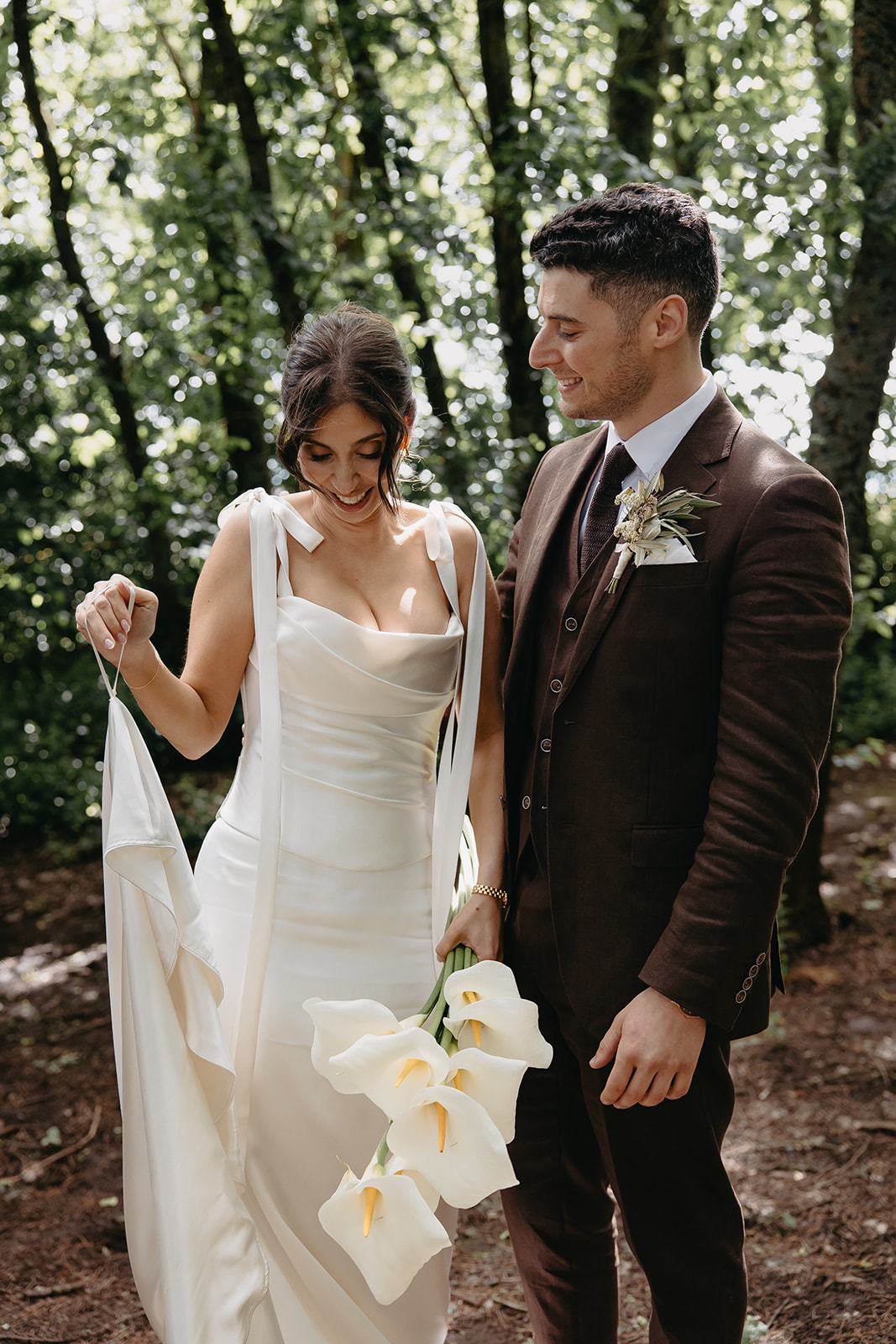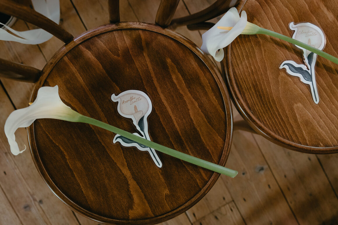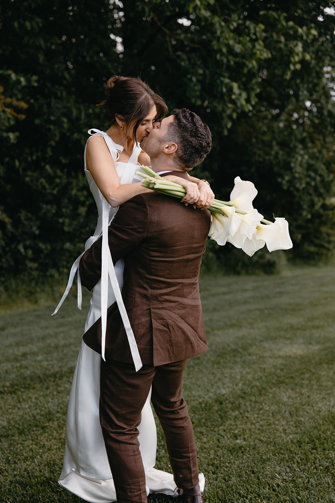 “One of the most special moments of the ceremony was how we created my bouquet. With the help of our florist Elissa (Larkspur Flowers), we placed a single stem calla lily on ten guests’ chairs. As I walked down the aisle, I collected one from each of them, building the bouquet as I went. When I reached the altar, Marco’s mum handed me the final stem, my mum gave Marco the ribbon, and he tied it all together. It felt like a beautiful symbol of everyone who had played a part in our journey.”