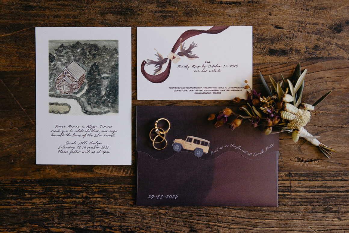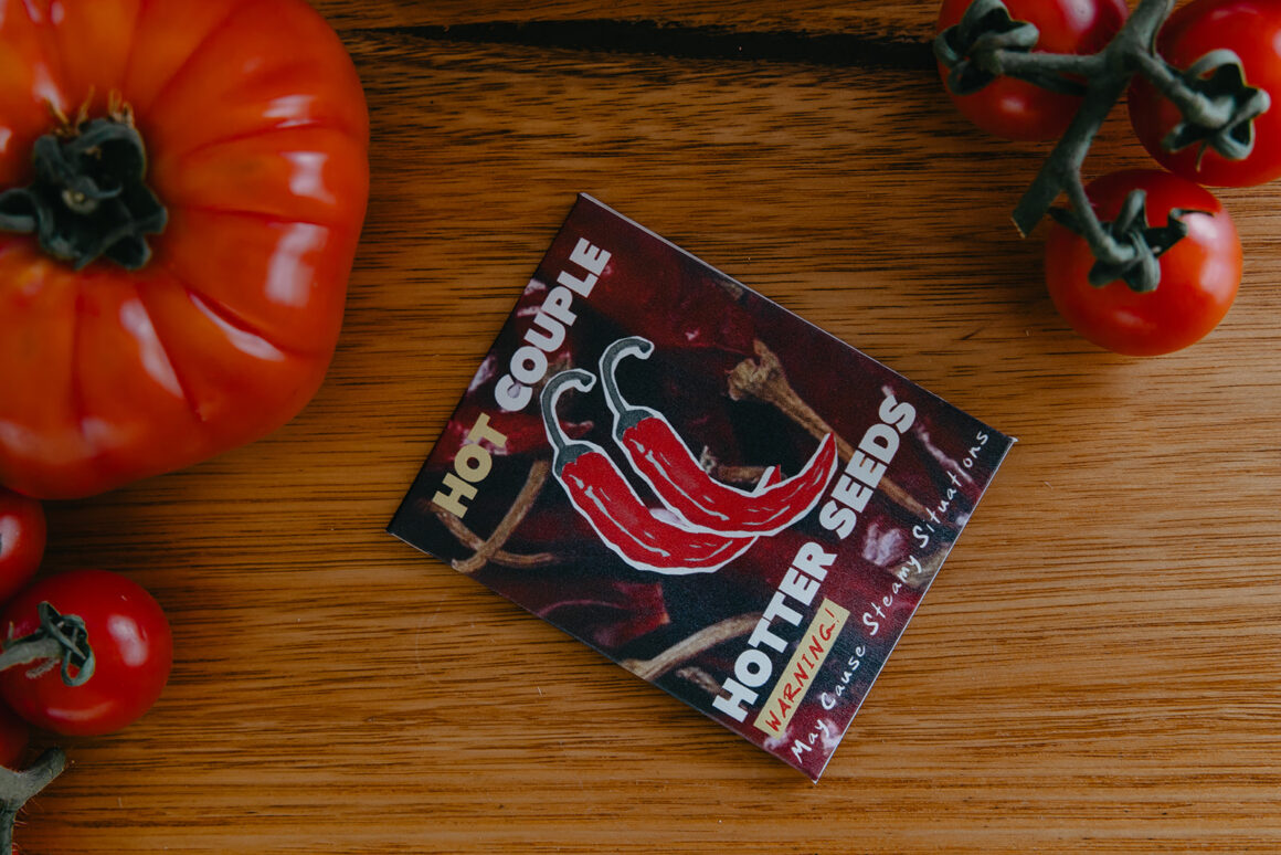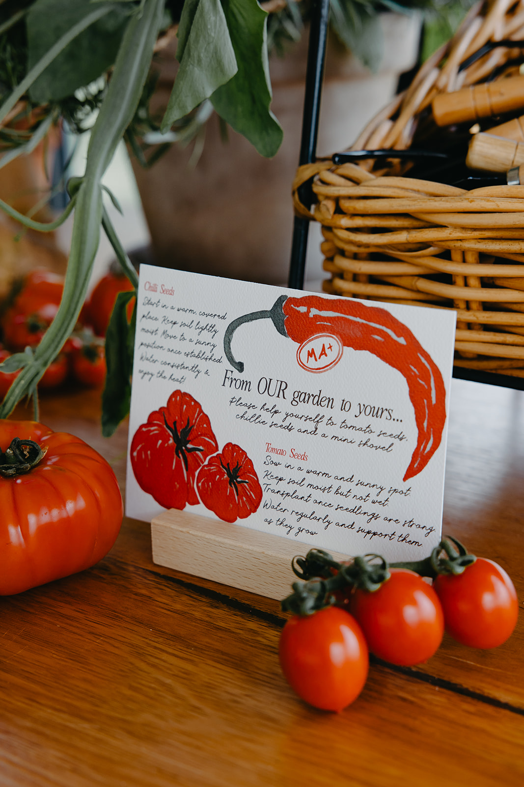 “I painted all of our wedding stationery myself, including the invitations, to give everything a personal touch. For our party favours, we wanted something that reflected us. Marco loves gardening and sharing his tomatoes and chillies with family and friends, so we chose tomato and chilli seeds paired with a mini shovel. I designed the packaging myself, adding a fun, cheeky touch to bring a smile to everyone’s faces.”