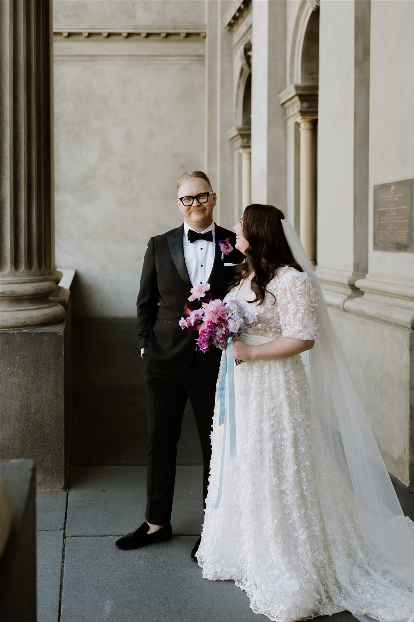 (Amanda) “I’m so glad we chose a cocktail wedding rather than sit-down. The night went by so fast and it was great to be able to chat with different people and it felt like a big party. We both love being on the dance floor but a choreographed dance was never on the cards for us… so instead we smashed a disco ball piñata!”(Drew) “The night at the W Hotel the night before was just what we needed to relax a bit in the lead-up to the wedding. Whilst some say it’s traditional to spend the night before apart, being together, ordering room service & watching Wedding Crashers was just what we needed. Also, having our fur child Reggie make an appearance for couple portraits was pretty special.”