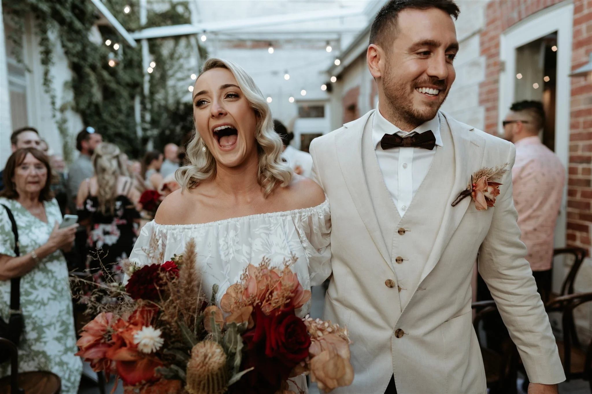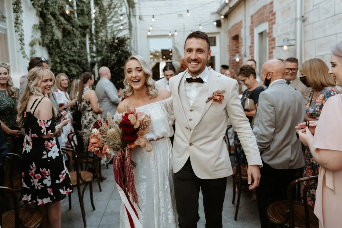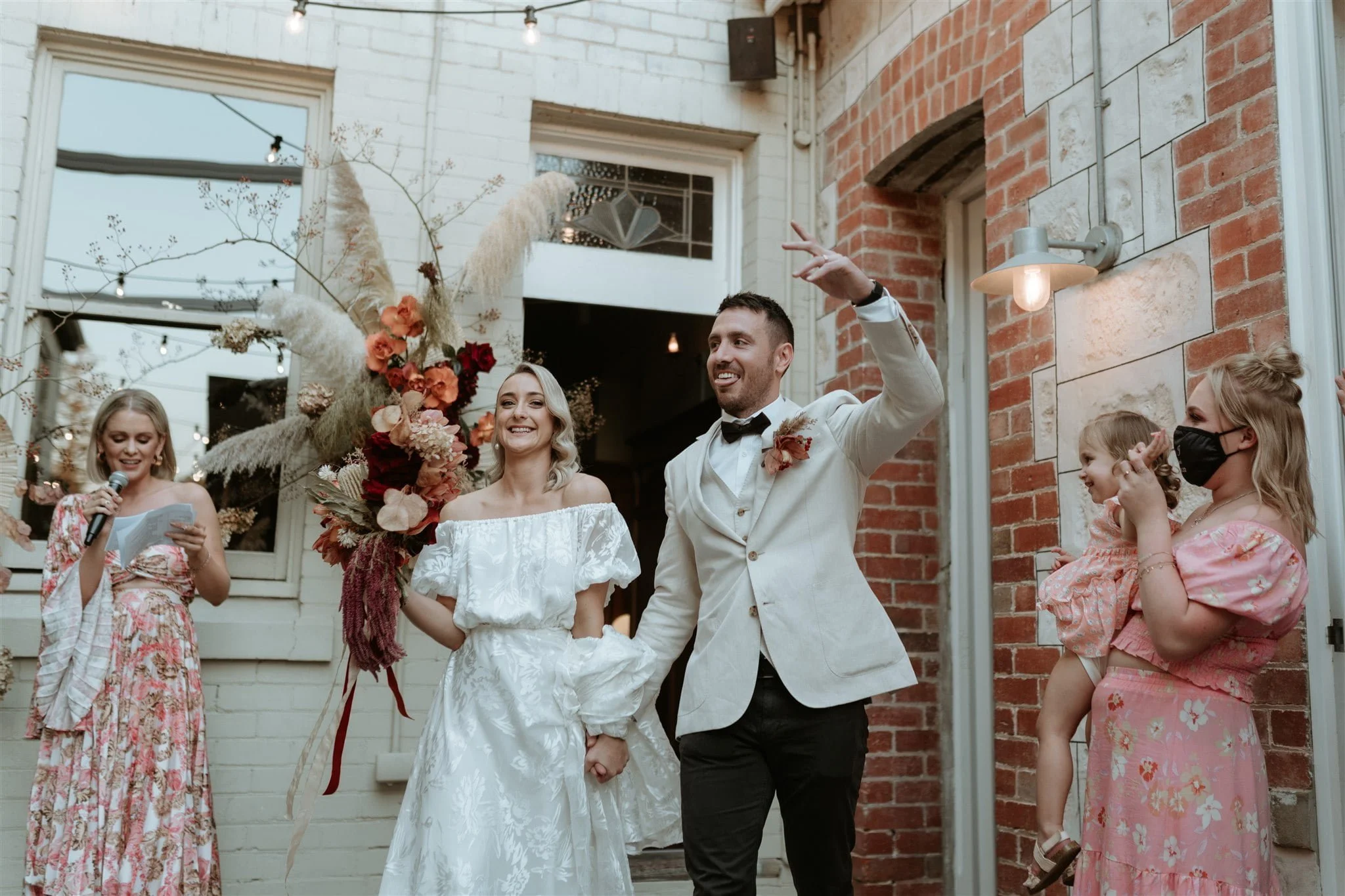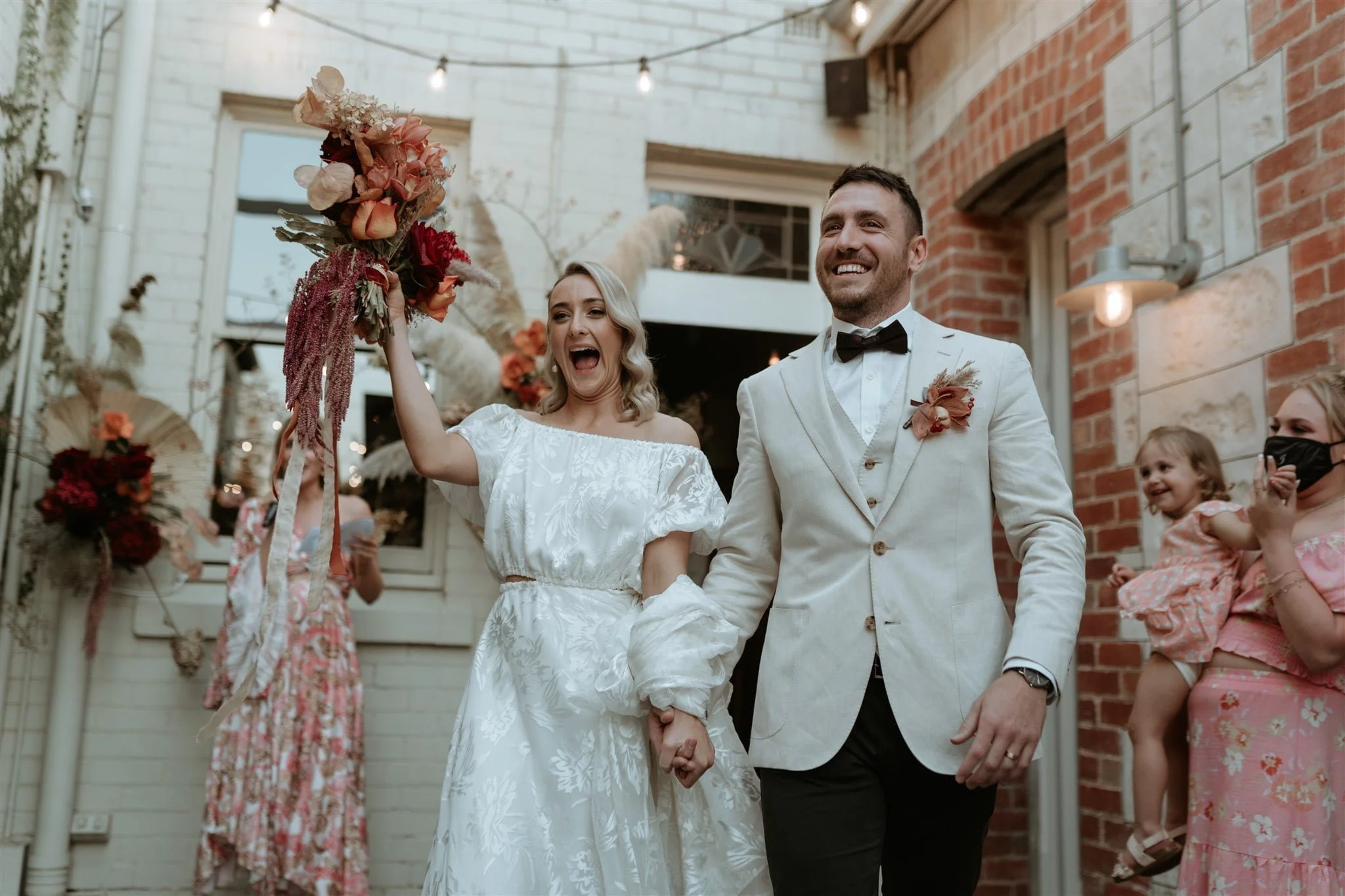 Amy and James tied the knot in the courtyard of the historic Guildhall in North Fremantle and we are here for the dreamy vibes created with the help of Festoon Perth (Yep. We are firmly of the opinion that festoon lighting adds that touch of magic every ceremony and dancefloor needs). For more of their gorgeous day, including that stunning Behati two-piece by cult Aussie designer Grace Loves Lace and dapper M.J Bale suit with snaps by Ring and Veil, simply scroll on below…