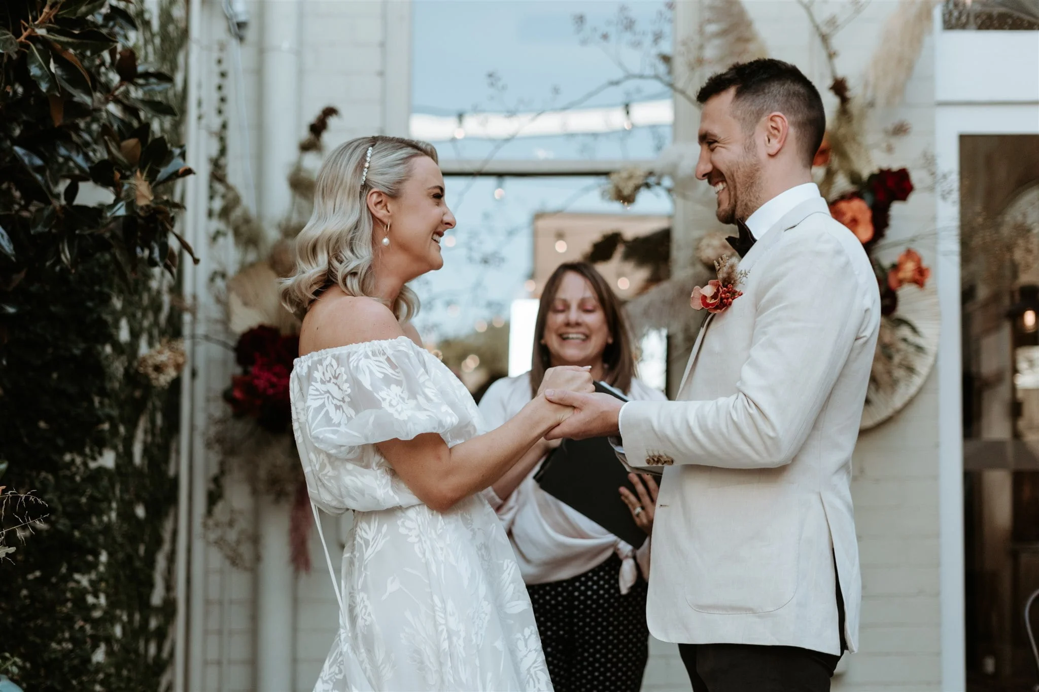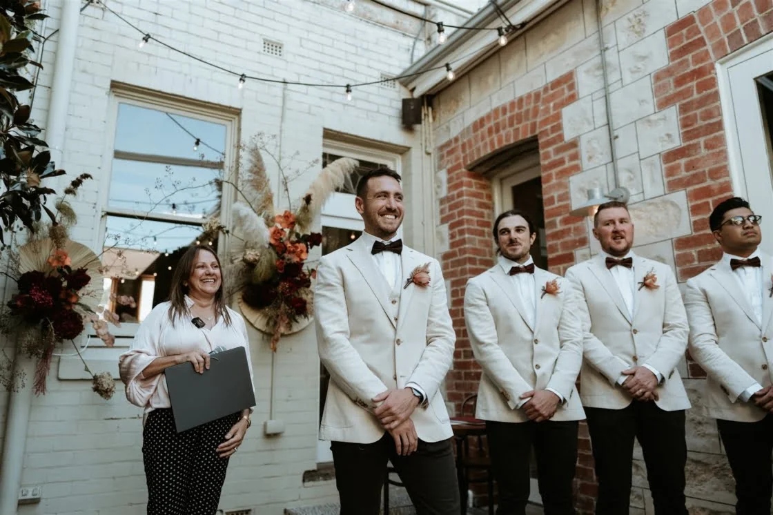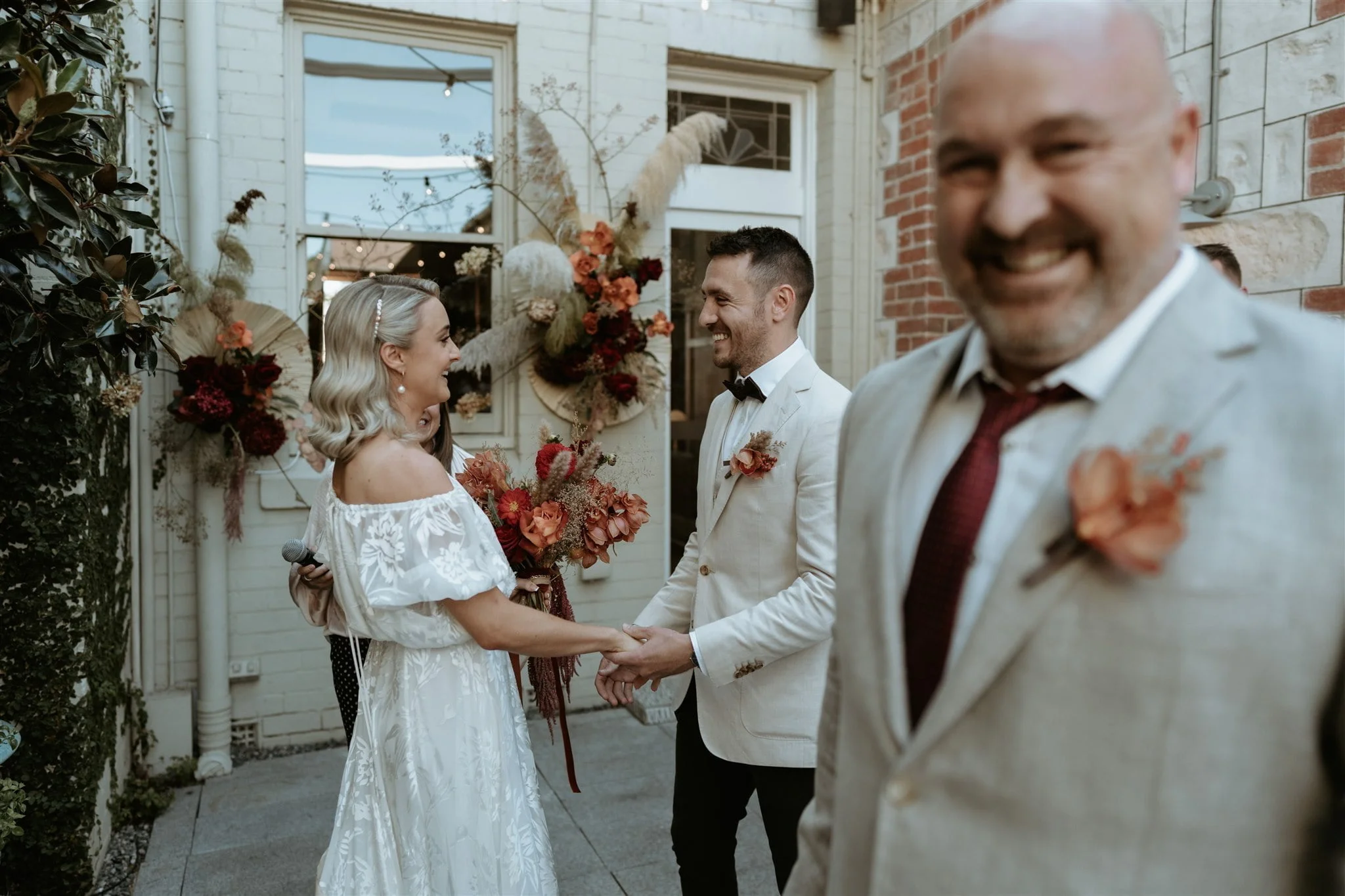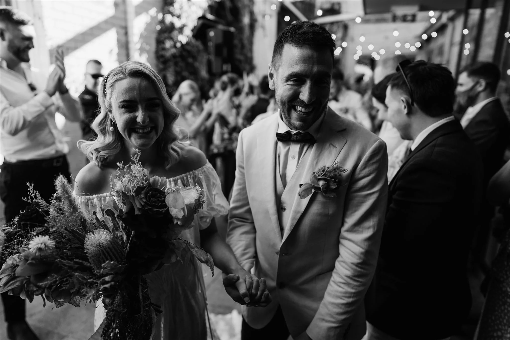 Amy and James tied the knot in the courtyard of the historic Guildhall in North Fremantle and we are here for the dreamy vibes created with the help of Festoon Perth (Yep. We are firmly of the opinion that festoon lighting adds that touch of magic every ceremony and dancefloor needs). For more of their gorgeous day, including that stunning Behati two-piece by cult Aussie designer Grace Loves Lace and dapper M.J Bale suit with snaps by Ring and Veil, simply scroll on below…