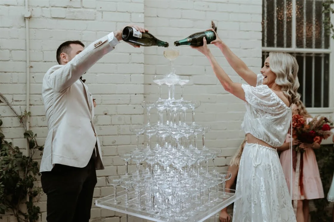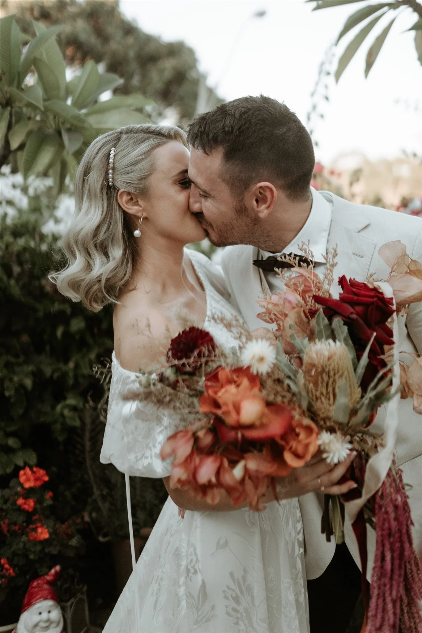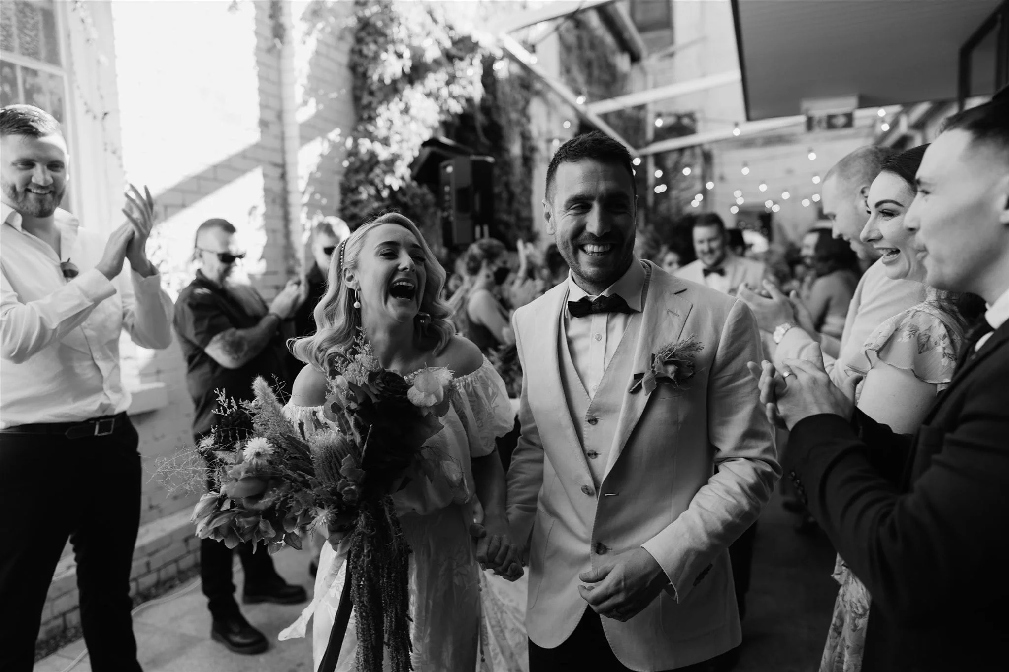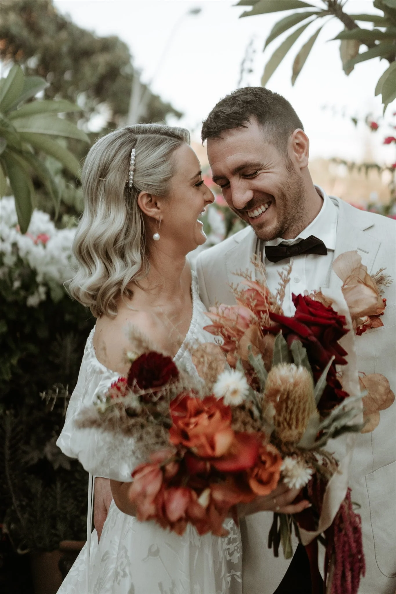 Amy and James tied the knot in the courtyard of the historic Guildhall in North Fremantle and we are here for the dreamy vibes created with the help of Festoon Perth (Yep. We are firmly of the opinion that festoon lighting adds that touch of magic every ceremony and dancefloor needs). For more of their gorgeous day, including that stunning Behati two-piece by cult Aussie designer Grace Loves Lace and dapper M.J Bale suit with snaps by Ring and Veil, simply scroll on below…